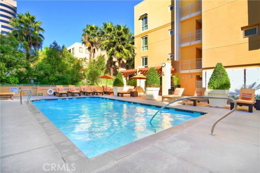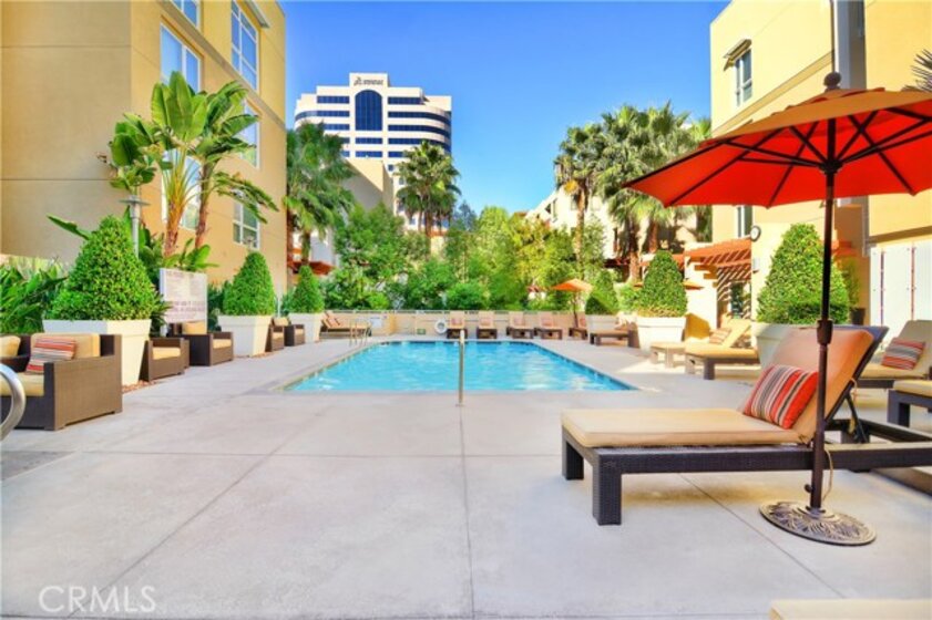 A modern full service luxury building built in 2010, welcome to the ASCENT at Warner Center! Immaculate 2 bedroom / 2 bathroom PLAN B LARGER MODEL (1,160 Sq. Ft. vs 1,050 Sq. Ft.) showcasing WOOD FLOORS & a fabulous open floor plan directly across from the pool!! Spacious cooks kitchen w/Stainless Steel appliances, Maple cabinetry, Granite counters and a generous sized breakfast bar. Plan B is the most desirable floor plan, offering open concept living with kitchen island and two bedrooms on opposite sides. From the living area, inspiring views of the outdoors prevail with access to your private terrace overlooking the community greenbelt and pool. Master bedroom is generous in size & comes equipped with a HUGE walk-in closet and luxurious en-suite bath featuring double vanity sinks and granite counter tops. Full size in unit washer and dyer, plenty of storage, recessed lighting and central heat & air are only a few of the amenities you'll enjoy living here. This unit also comes with 2 SIDE BY SIDE reserved parking spots near the elevator for convenient access (NO STARIS ANYWHERE!). The complex itself features a plethora of amenities: Pool, spa, fitness center, club house w/kitchen, game room, entertainment lounge w/flat panel television, outside barbecues, fire places, dog park, cabana, etc! All this located in the heart of Warner Center mere walking distance to The Village, Westfield Topanga Mall, Warner Center Park & Westfield's newest upcoming project "LA Warner Center."