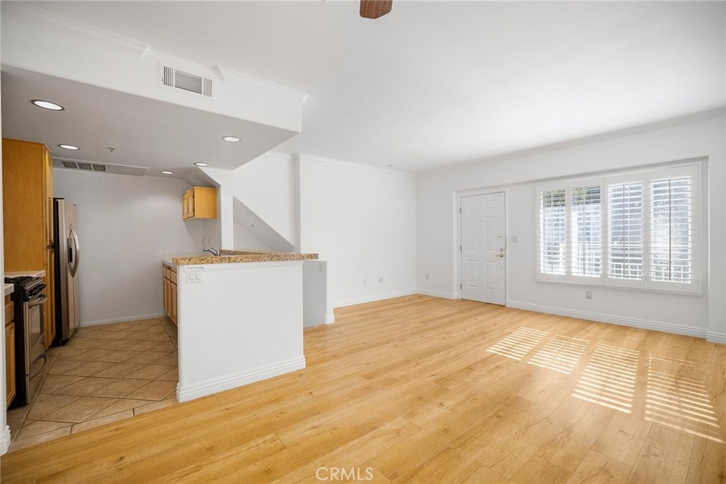 Beautiful and spacious 1 bedroom 1 bath unit in gated community "Bella Montagna" south of Ventura. Kitchen bar has granite countertops, stainless steel appliances, wood floors, shutters, washer and dryer in unit, attached garage with direct access. Unit is in a great location of community at the top of the hill with open grassy area in front of unit. No other units in front of this unit. Clubhouse; resort style pool, spa; fitness center; tennis courts; saunas and showers; theater room; basketball court.