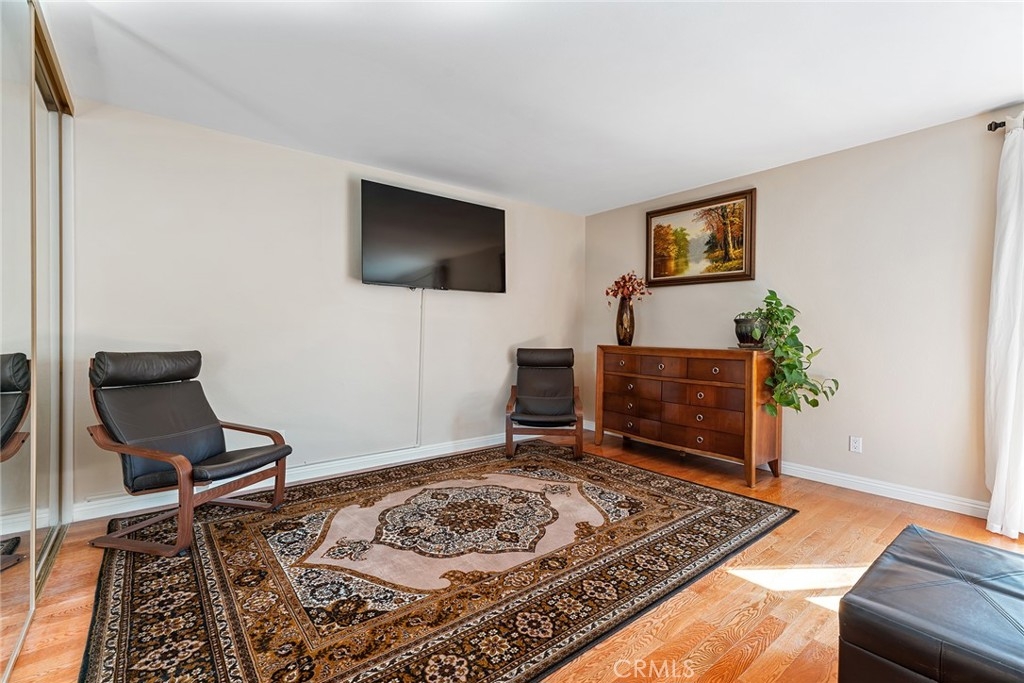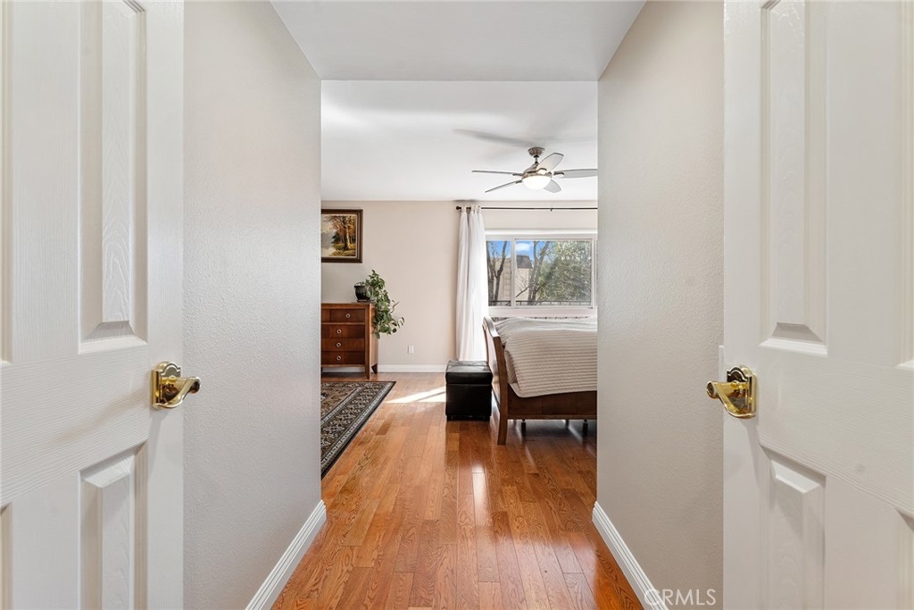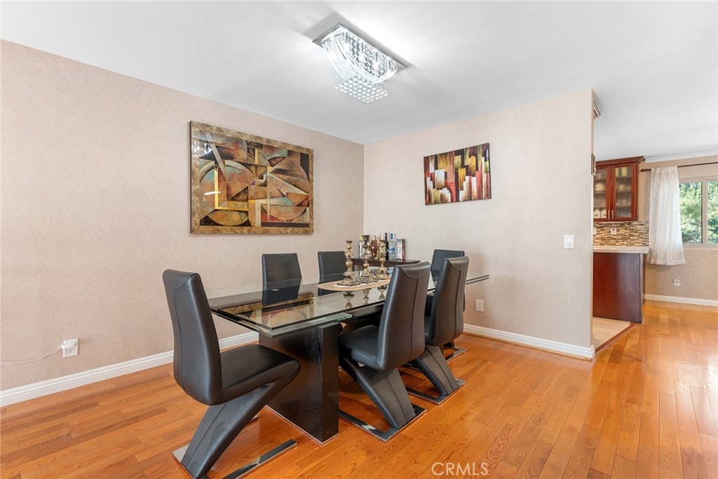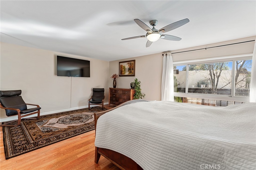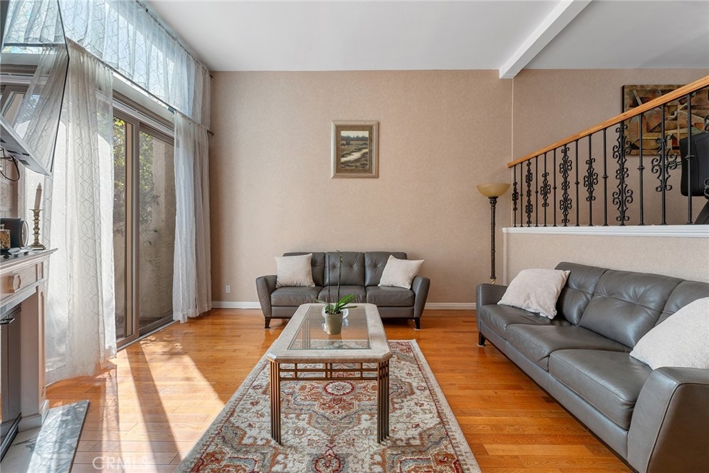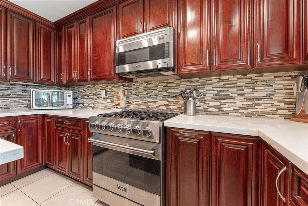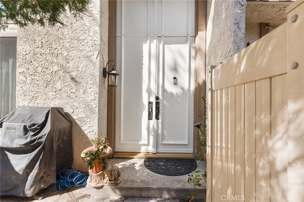 Rare upgraded townhome in the beautiful community of Dove Creek with private patio and attached 2-car garage with direct access! The unit is the largest model in the community featuring 3 bedrooms, 2.5 bathrooms and is privately situated in the very back of the complex making it the ideal quiet location away from any street noise. The unit boats a gated front patio perfect for outdoor dining and entertaining. Step inside to find an entry foyer that opens to the spacious sunlit living room featuring high soaring ceilings, upgraded wood mantled fireplace with stone hearth, sliding glass door that opens to the front patio for great indoor/outdoor flow, and hardwood floors found throughout. The separate formal dining room overlooks the living room and has a remodeled wet bar with quartz counter, sink, and cabinetry with wine storage. The chef’s remodeled kitchen boasts center island, quartz counters with tiled backsplash, Viking stainless appliances including 5-burner range with overhead built-in microwave, fridge, dishwasher, and separate breakfast room with abundant pantry storage. There is a convenient powder bathroom for guests and coat closet. Upstairs you will find three bedrooms including the oversized primary featuring a grand double door entry, large sitting room area, 2 wardrobe closets with built-ins, and private en-suite bathroom with large vanity, granite counters, and separate toilet room with walk-in shower and skylight. The second and third bedrooms each have closets with custom built-ins and share a hall bathroom with bath tub and shower. There is direct access to the 2-car garage where you will find the laundry area with storage. Community amenities include a heated swimming pool, multiple spas, tennis courts, and manicured walking paths. System upgrades per seller: newer water heater, newer electrical panel, and newer dual paned windows and patio sliding glass door. HOA also covers fire and earthquake insurance as well as water and trash costs. Adjacent to Westfield Topanga Mall & Village, Calabasas Commons, and Warner Center.