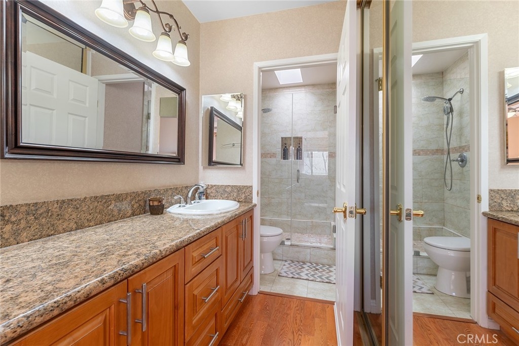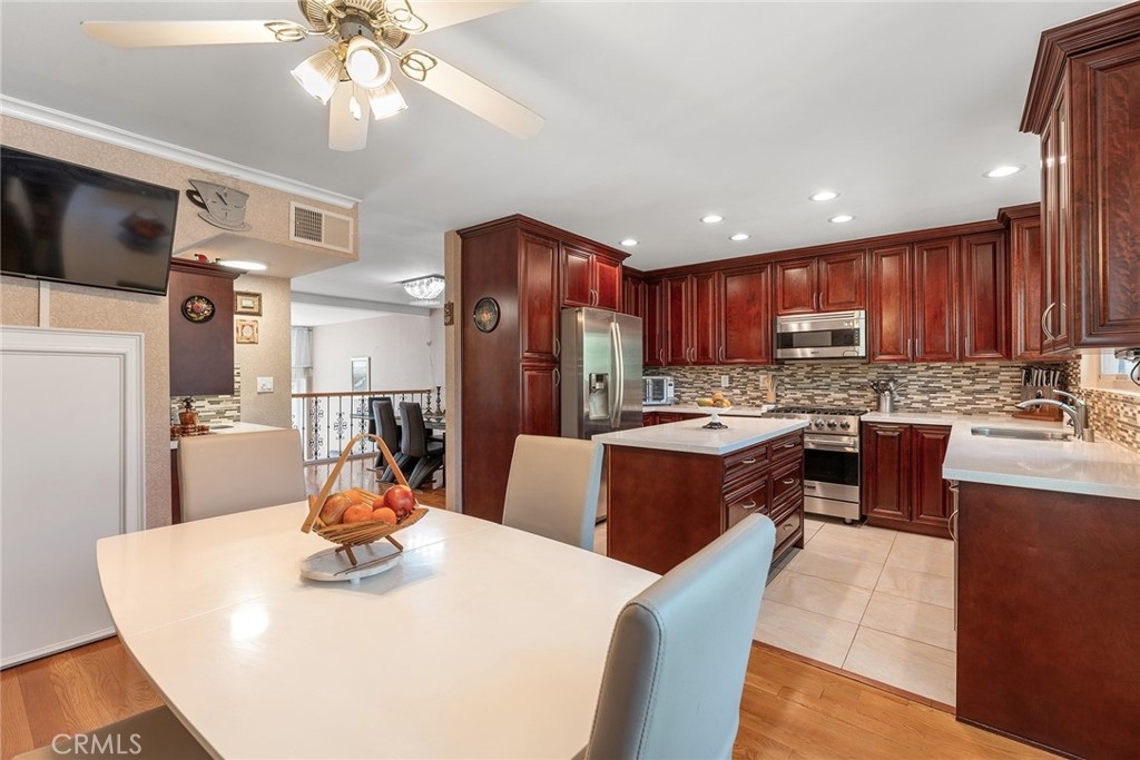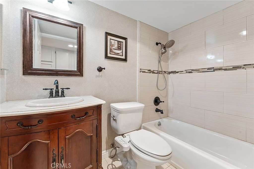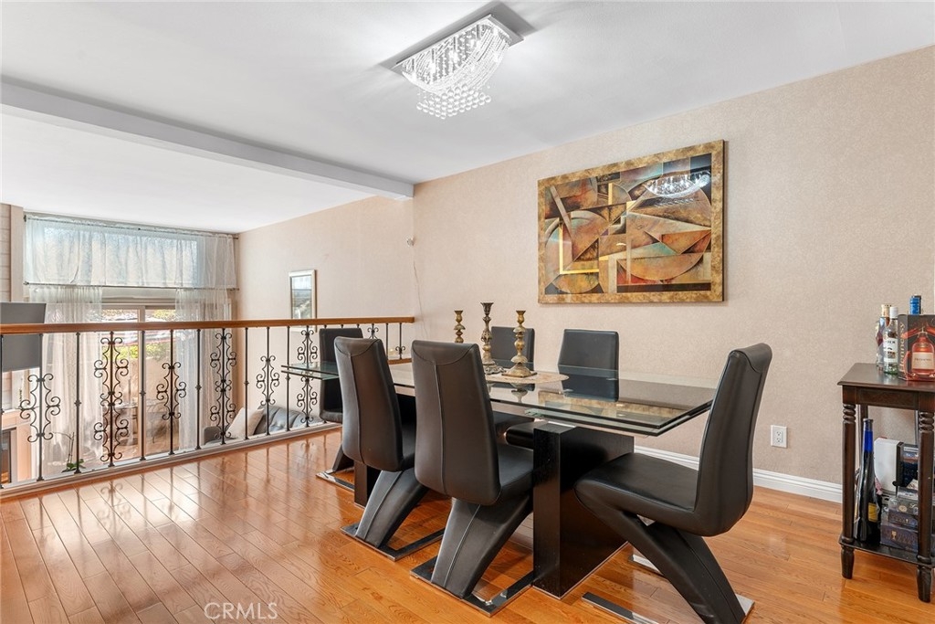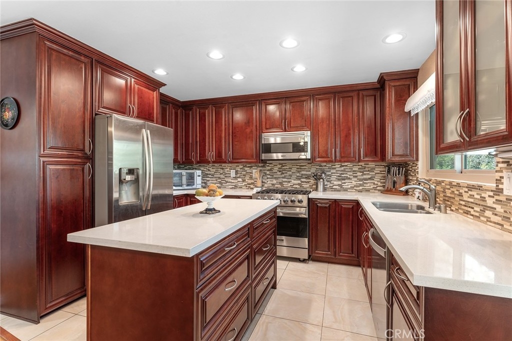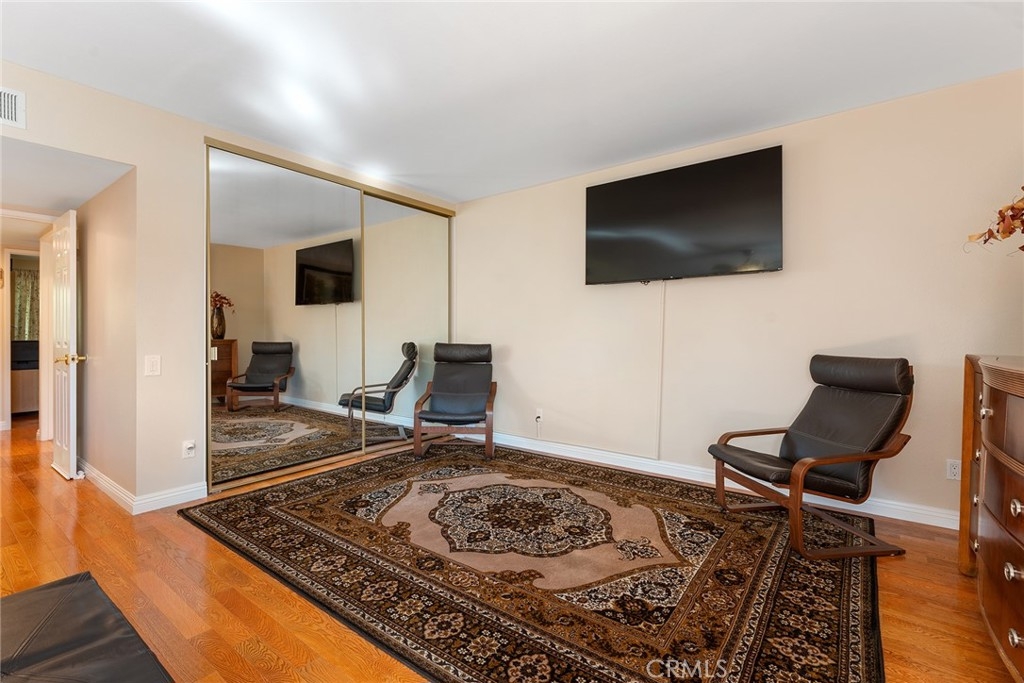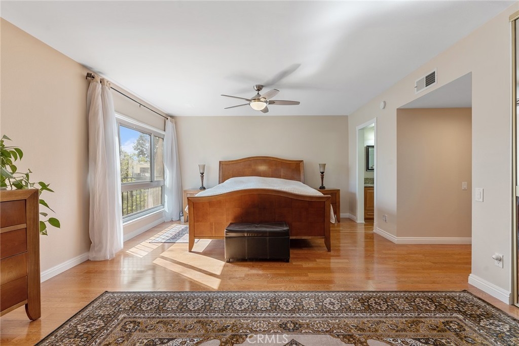 Rare upgraded townhome in the beautiful community of Dove Creek with private patio and attached 2-car garage with direct access! The unit is the largest model in the community featuring 3 bedrooms, 2.5 bathrooms and is privately situated in the very back of the complex making it the ideal quiet location away from any street noise. The unit boats a gated front patio perfect for outdoor dining and entertaining. Step inside to find an entry foyer that opens to the spacious sunlit living room featuring high soaring ceilings, upgraded wood mantled fireplace with stone hearth, sliding glass door that opens to the front patio for great indoor/outdoor flow, and hardwood floors found throughout. The separate formal dining room overlooks the living room and has a remodeled wet bar with quartz counter, sink, and cabinetry with wine storage. The chef’s remodeled kitchen boasts center island, quartz counters with tiled backsplash, Viking stainless appliances including 5-burner range with overhead built-in microwave, fridge, dishwasher, and separate breakfast room with abundant pantry storage. There is a convenient powder bathroom for guests and coat closet. Upstairs you will find three bedrooms including the oversized primary featuring a grand double door entry, large sitting room area, 2 wardrobe closets with built-ins, and private en-suite bathroom with large vanity, granite counters, and separate toilet room with walk-in shower and skylight. The second and third bedrooms each have closets with custom built-ins and share a hall bathroom with bath tub and shower. There is direct access to the 2-car garage where you will find the laundry area with storage. Community amenities include a heated swimming pool, multiple spas, tennis courts, and manicured walking paths. System upgrades per seller: newer water heater, newer electrical panel, and newer dual paned windows and patio sliding glass door. HOA also covers fire and earthquake insurance as well as water and trash costs. Adjacent to Westfield Topanga Mall & Village, Calabasas Commons, and Warner Center.