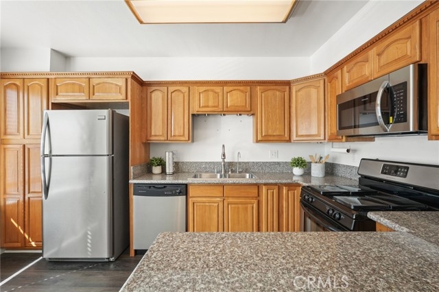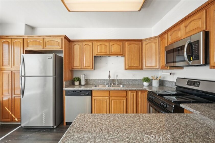 Welcome to this spacious two-story condo in the heart of Woodland Hills. With a practical layout and new vinyl flooring throughout, this home offers comfort, functionality, and room to make it your own. The main level features two separate dining areas, a generously sized kitchen with ample counter space and modern appliances, and a cozy living room with a fireplace — perfect for relaxing evenings at home. Just off the living area, sliding glass doors open to a private enclosed patio, ideal for enjoying your morning coffee, entertaining guests, or getting some fresh air. Upstairs, you’ll find two well-sized bedrooms, each with its own walk-in closet. One bedroom includes an ensuite bathroom, offering privacy and convenience. The laundry area is tucked into a hallway closet with hookups for a side-by-side washer and dryer. Additional highlights include central air and heat, and two assigned parking spots in a gated garage. The community features a pool, spa, and landscaped courtyards, all within a secure and well-maintained complex. Conveniently located near Warner Center, Westfield Topanga, The Village, restaurants, cafes, and with easy access to the 101 and 118 freeways — this condo offers space, comfort, and a great Woodland Hills location.