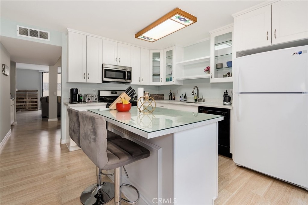 A delightful two-story condo residing in the sought-after city of Woodland Hills! Behind the gates of this secured complete is the perfectly airy unit 218, featuring a marvelous 1,362-sqft of space detailed with beautiful laminate flooring installed throughout and sizable windows that effortlessly stream in natural sunlight. An entryway opens into a stylish living room which enjoys sliding door access to a private front patio and a cozy fireplace to enrich the pleasant atmosphere with some warming notes. Enjoy a scrumptious meal in the large formal dining room or in the causal breakfast nook of the kitchen. Neat cabinets are adorned with simple stone countertops in this open kitchen offering display cabinetry, built-in appliances, and a center island with a glass top breakfast bar. Venture upstairs to find spacious bedrooms complete with center ceiling fans, plush carpet flooring, and generous closet space while the primary bedroom includes a private bathroom with double sinks. The main bathroom has a split layout which includes a shower/tub combination. As part of an HOA, residents are provided with tandem parking in the underground community garage and are welcome to enjoy the glittering waters of a relaxing community pool. Located only minutes away from Westfield Topanga & The Village, Canoga Park High School, Fallbrook Center, Shadow Ranch Park, the Warner Center, Pierce College, easy 101 Freeway access, and so much more! Come enjoy all that Woodland Hills has to offer!