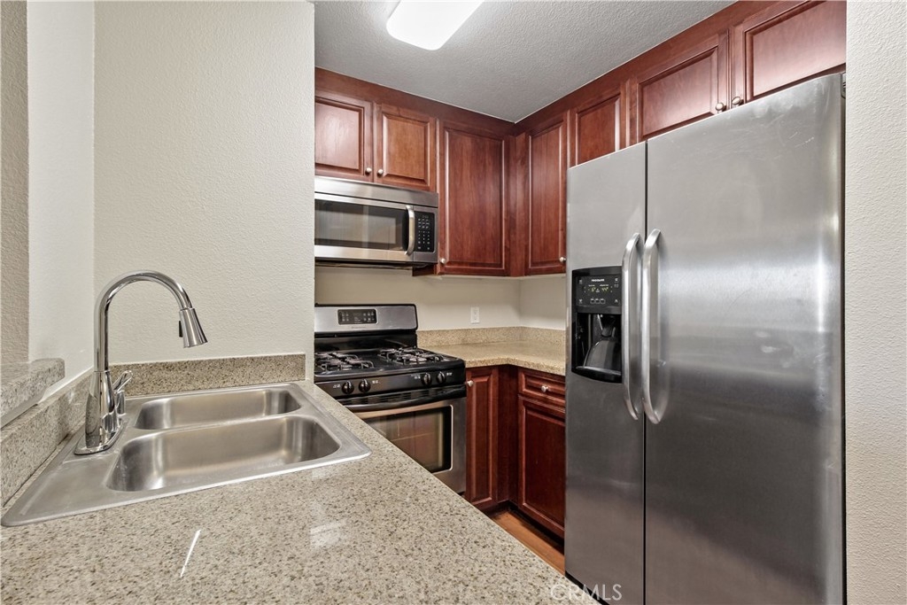 Located on the second floor, this 1 bedroom/1 bathroom charming corner unit features tons of natural lights, a balcony, open views, and a fireplace in the living room. Kitchen features cherry wood cabinets, granite counter tops and stainless steel appliances. The unit has brand new carpet throughout and has been fully repainted. There are designated Community laundry rooms in each building. The Met is a guard gated community that offers onsite security, elevators in all buildings, four swimming pools, six night lighted tennis courts, full fitness center, racquetball and basketball courts and multiple spas. All this located within short distance to The Village and all the dining, shopping & entertainment Warner Center has to offer.