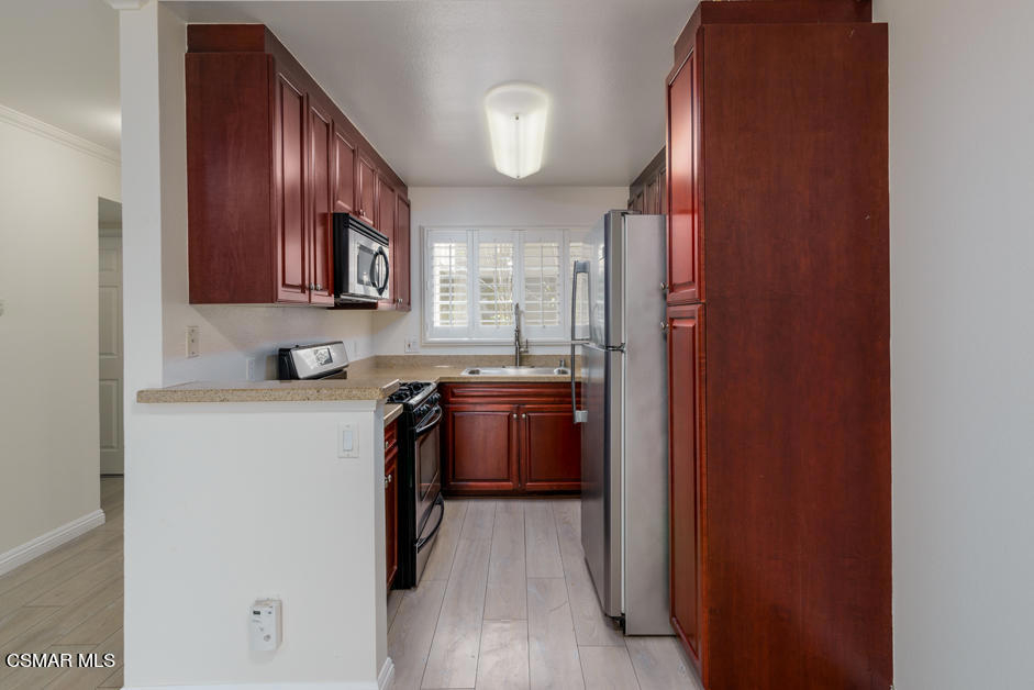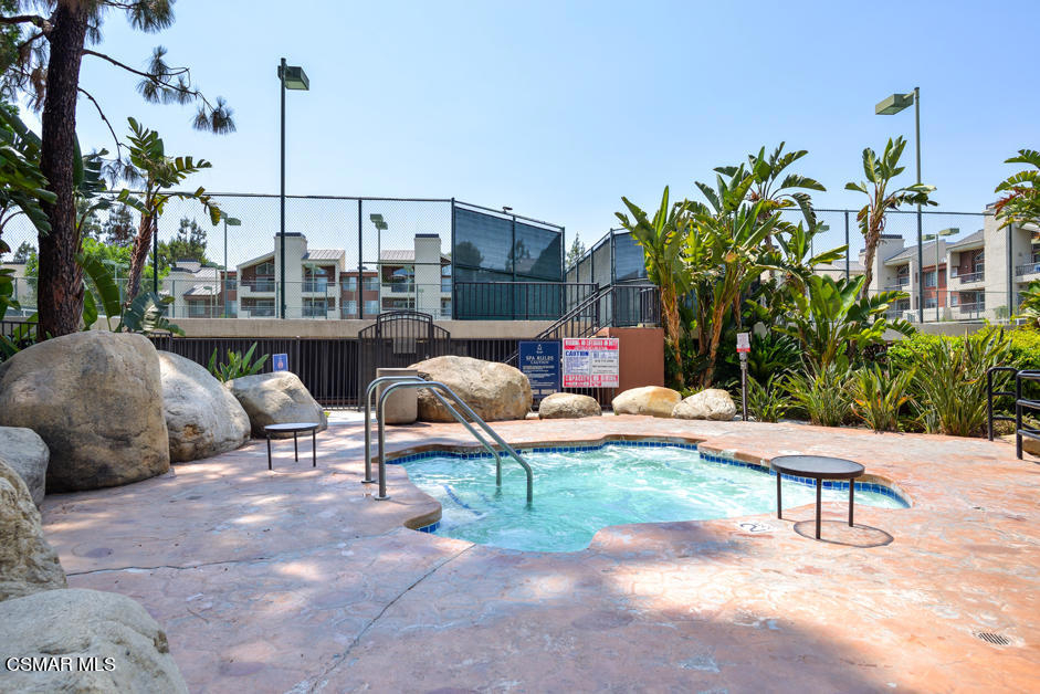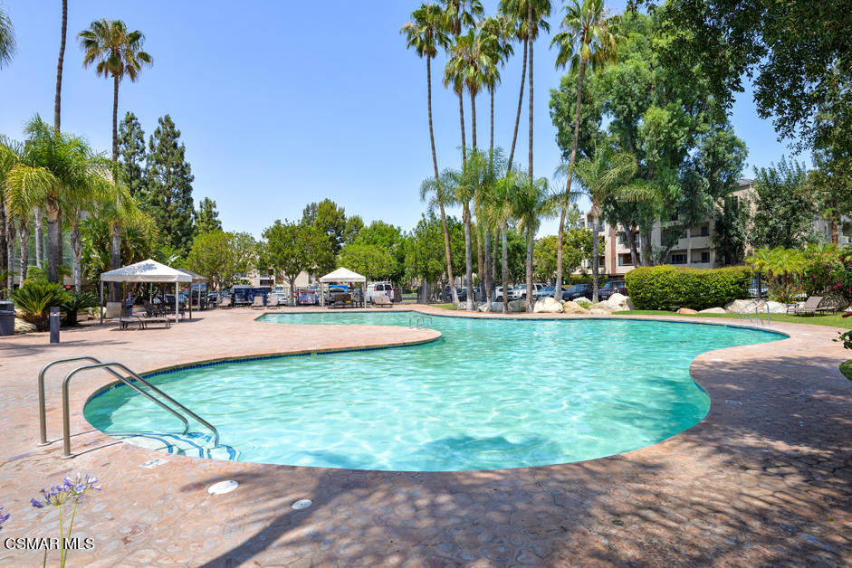 Welcome to the Met! A first level end-unit with mountain views featuring 2 bedrooms & 2 full bathrooms awaits you.The pride of ownership is evident as soon as you walk in the home. From the beautiful laminate wood floors to the granite counters and stainless steel appliances in the kitchen and the plantation shutters on the windows, you can tell this home has been lovingly cared for. Not only is the unit light and bright, it is a first floor end unit with one common wall and a surprisingly nice view of Oat Mountain in the distance over the Warner Center skyline from the balcony. The inside laundry includes a stacked washer/dryer and for parking you have a major bonus as you will have two dedicated spaces in the underground garage that are close to the elevator and the unit itself is only a few steps from the elevator. No longs hauls with groceries for the owner of this great condo.The Met's reputation for resort-style living is well deserved. With 6 Tennis Courts, a well-kept playground for the kids, an indoor Basketball Court, 4 Pools, 4 Spas and a fully equipped gym. While many complexes claim to have resort-style amenities, The Met truly delivers it. You really need to see this one, it's not over-hyped. The Met is located in Woodland Hills near the Topanga mall and other shopping centers, the 101 freeway, and Warner Center Park.