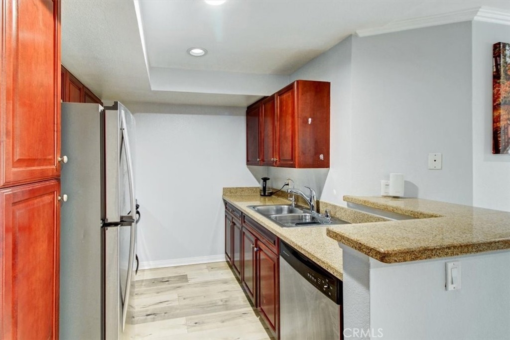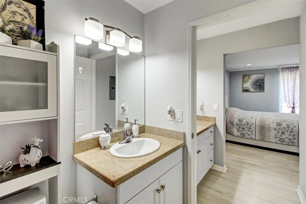This 2 bedroom/ 2 bathroom modern-chic apartment has a stylish open floor plan for the kitchen, dining room, and living room, which is complete with a fireplace and exit to a spacious balcony overlooking the inner courtyard. The kitchen has abundant cabinets and countertop space for cooking, storing, and entertaining. The living room introduces two master bedrooms on either side of it, both of which offer ample space and light. Both bedrooms also include their own bathroom and plenty of closet space. And for your convenience, this homey apartment has recessed lighting and an in-unit laundry closet. In addition to the apartment's enticing features, the gated complex within which is it located presents several pools, tennis courts, a gym, and lounging areas for your enjoyment and leisure. And when you feel like stepping outside the gates, you'll find the complex conveniently located in Woodland Hills near the Topanga mall and other shopping centers, the 101 freeway, and Warner Center Park. Simplicity, convenience, and luxury all rolled into one!