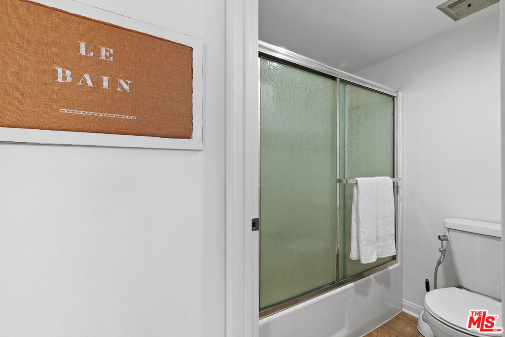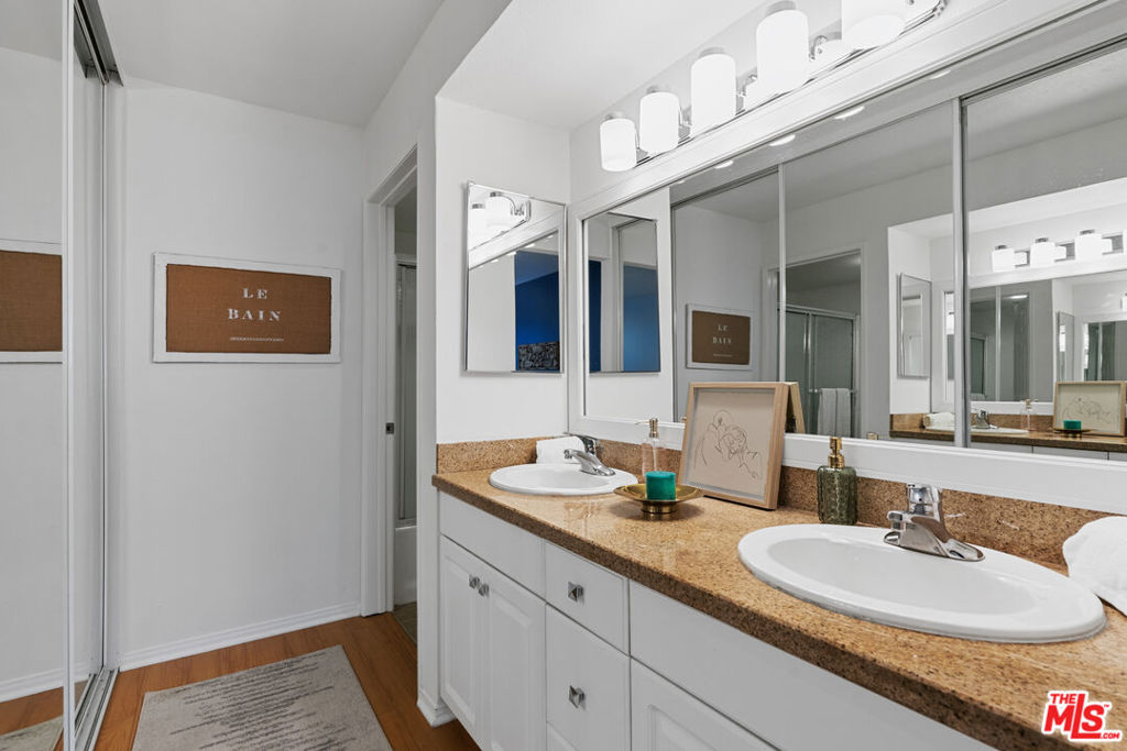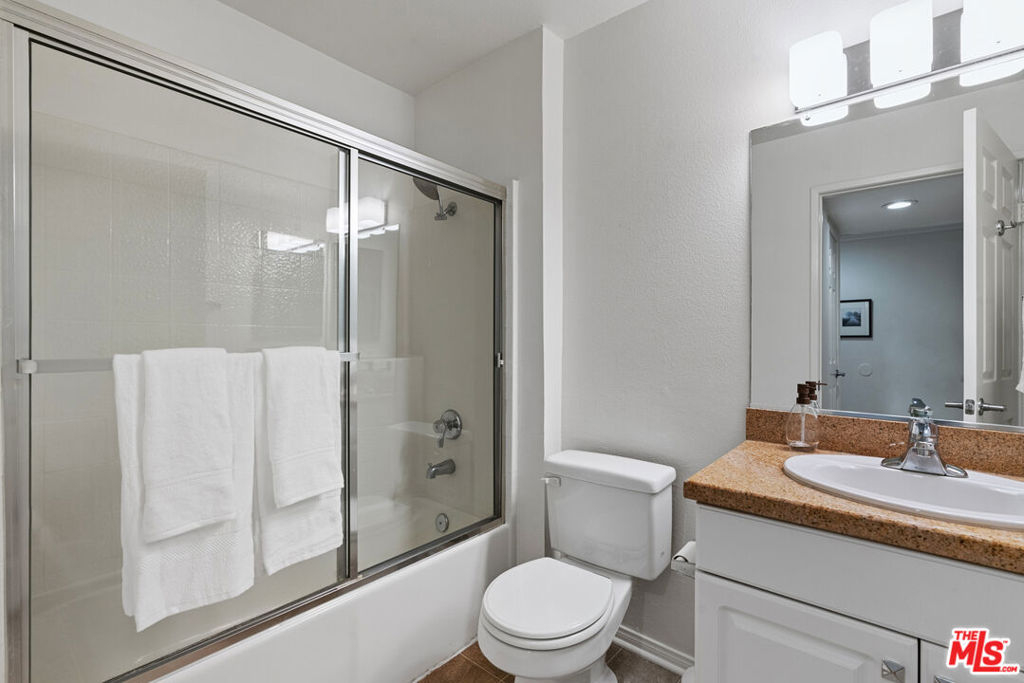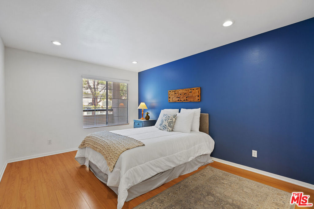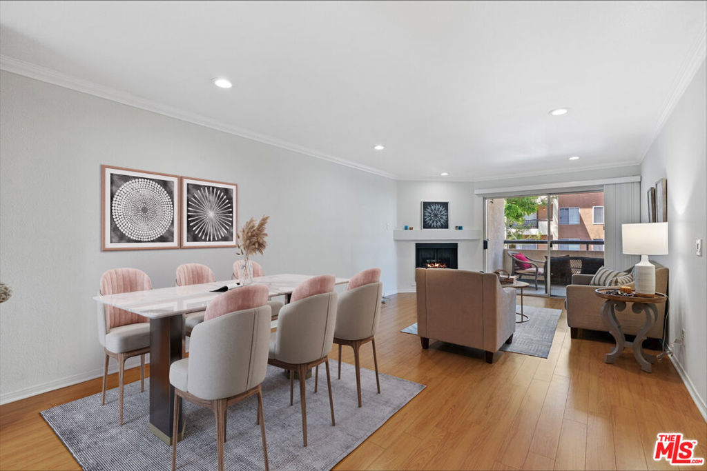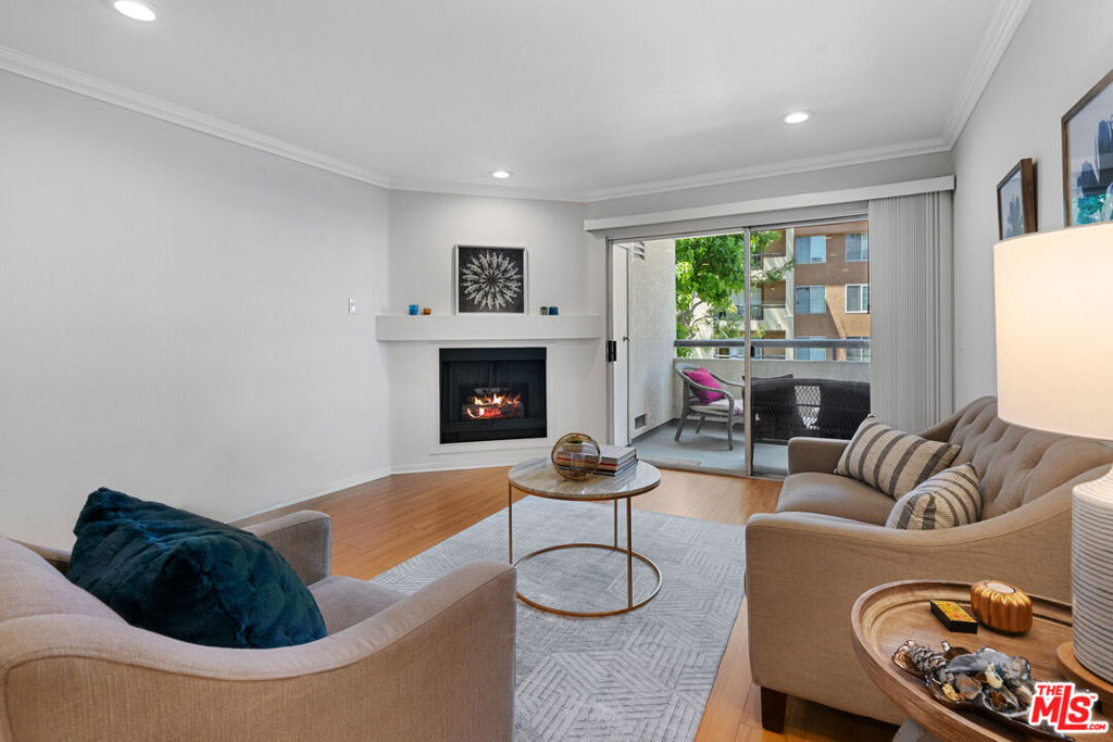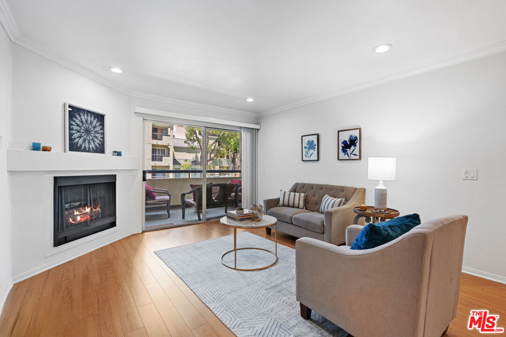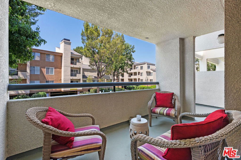 This quiet first-floor condo at the Met checks all the boxes, starting with a great layout on the best side of the building. The living area is light and bright with a gas fireplace and slider doors that lead out to a generous balcony space with ample room for seating, grilling, and extra storage closet. The large primary bedroom features plenty of closets and en suite bath with double sinks. Hardwood style flooring and recessed lighting run throughout the 2 bed, 2 bath space. Other features you'll appreciate here are the private-feeling second bedroom, updated kitchen, and in-unit laundry. Very recent upgrades include fresh paint, blinds, light fixtures, and hardware. Unit comes with 2 tandem parking spots that are conveniently located by the lobby elevators. The secure and well-cared for gated community has 4 pools, several tennis, racquet and basketball courts, as well as a fitness center, sauna, and children's playground, and visitor parking. Complex is so convenient to freeways as well as parks, restaurants, and shopping like Whole Foods and the Topanga Mall.