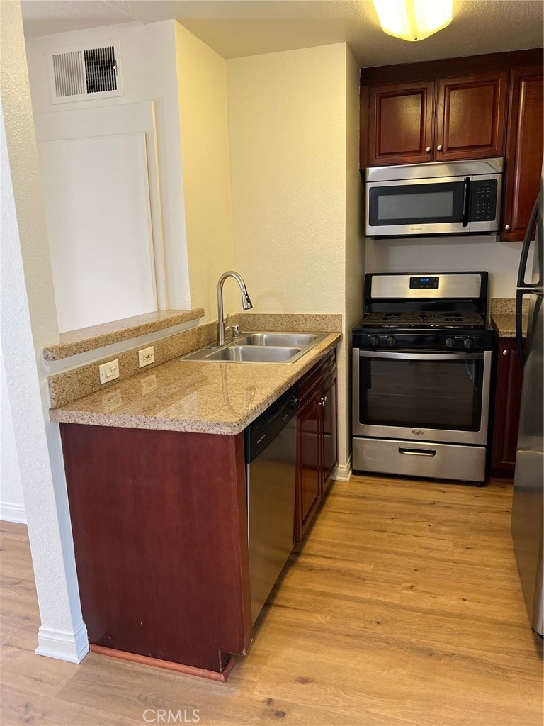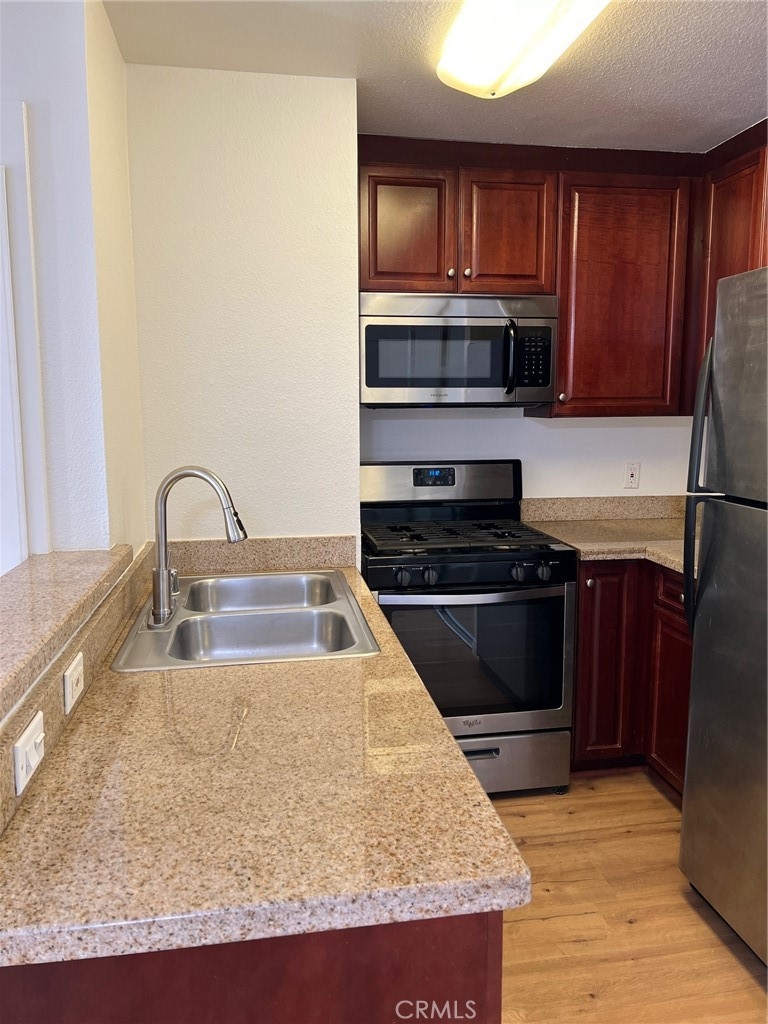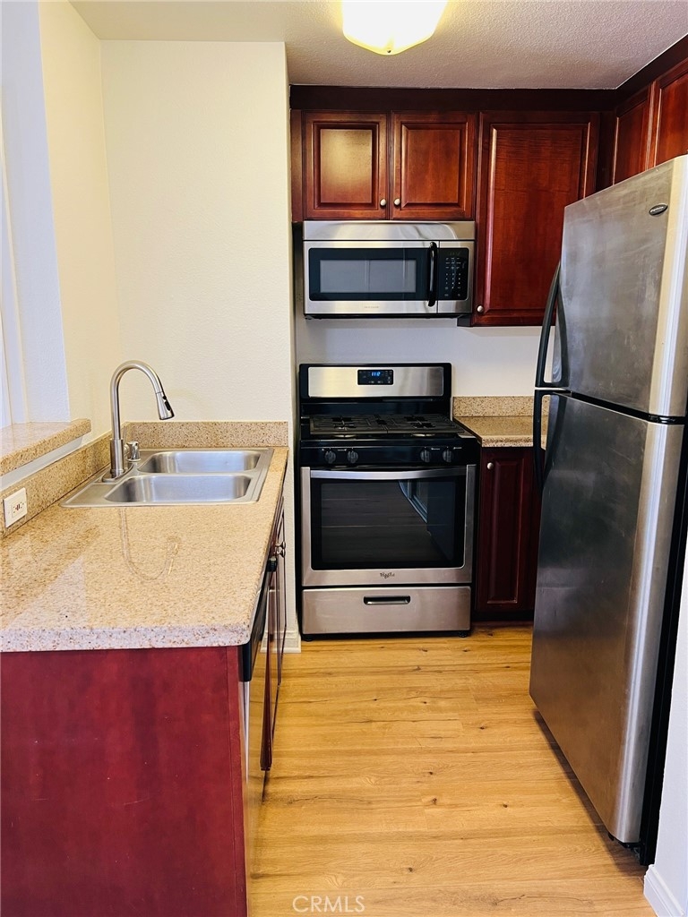 Experience the epitome of urban living with this exquisitely renovated corner unit, nestled in the heart of Woodland Hills within the prestigious Warner Center area. This 1-bedroom, 1-bath residence, situated in the guard-gated Met community, combines luxury with unparalleled convenience. Delight in the modern, open-plan interior, boasting new flooring, fresh paint, and elegant upgrades, including granite countertops in the kitchen and bathroom. The kitchen opens into a light and bright spacious living room which seamlessly flows to the large balcony, perfect for relaxation or entertaining. Embrace an active lifestyle with the full array of resort-style amenities at your disposal. Multiple sparkling pools, spas, patios, tennis courts, and a state-of-the-art gym cater to all your fitness and leisure needs. Enjoy added benefits like an indoor basketball/racquetball court, spa, sauna, and a children's play area. Security and convenience are paramount here, with 24-hour patrolling security and a full-time on-site maintenance department, ensuring peace of mind. The unit includes two tandem parking spots, strategically located for easy access. This prime location places you at the center of Woodland Hills' vibrant lifestyle. Step outside to discover new retail shops, restaurants, and essential establishments like Whole Foods, Target, The Village, and Westfield Topanga Mall. Enjoy quick access to the freeway and proximity to the upcoming Rams Sports Complex, providing endless opportunities for dining, shopping, and recreation. Whether as a chic starter home or a savvy investment property, this turn-key condo is ready for immediate occupancy. Don't miss the chance to own a piece of the Warner Center's dynamic community, where luxury meets convenience in one perfect package.