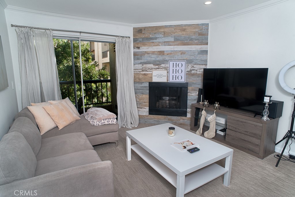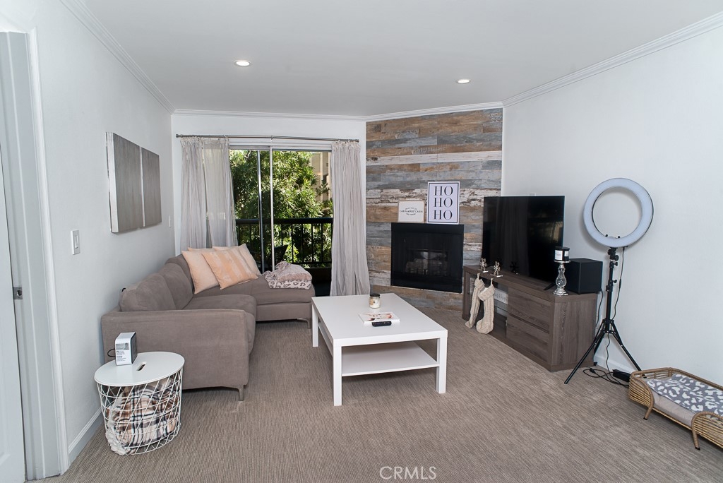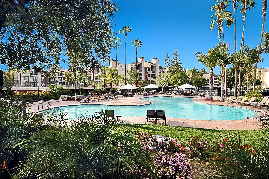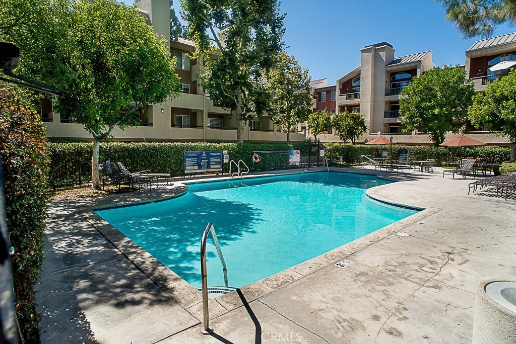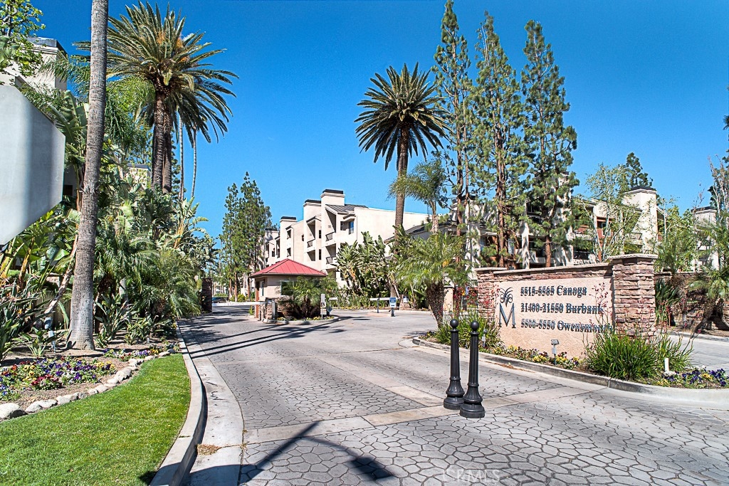 VACANT UNIT! Great investment opportunity or a place to call home. This uniquely remodeled 1 bedroom condo is a delightful blend of modern luxury and timeless charm and will be sold with furniture included. Nestled in a quiet pocket of the building, this unit stands out as a true gem. Once inside this cozy retreat you'll notice the neutral patterned carpet that flows throughout the home, recessed lighting, and the nearby kitchen boasting new stainless steel appliances integrated within the custom cabinetry. Just off the kitchen leads you from the dining to the living room which showcases a beautiful wooded mosaic around the fireplace. The bedroom is a cozy retreat, featuring large windows that bathe the room in natural light and offer a view of the surrounding greenery. The remodeled bathroom is a spa-like haven, adorned with a contemporary vanity and modern fixtures that elevate your daily routine. Outside, a private balcony provides a tranquil space to unwind and enjoy the fresh air. The Met, situated in the highly prestigious Warner Center, is an exclusive, guard-gated community spread across 26 acres of verdant grounds. The community consists of resort-style amenities including four pools, state of the art fitness center, six tennis courts, children's playground, expansive poolside deck, indoor basketball court and racquetball court all while being minutes to local shopping, dining and entertainment in the heart of Warner Center.