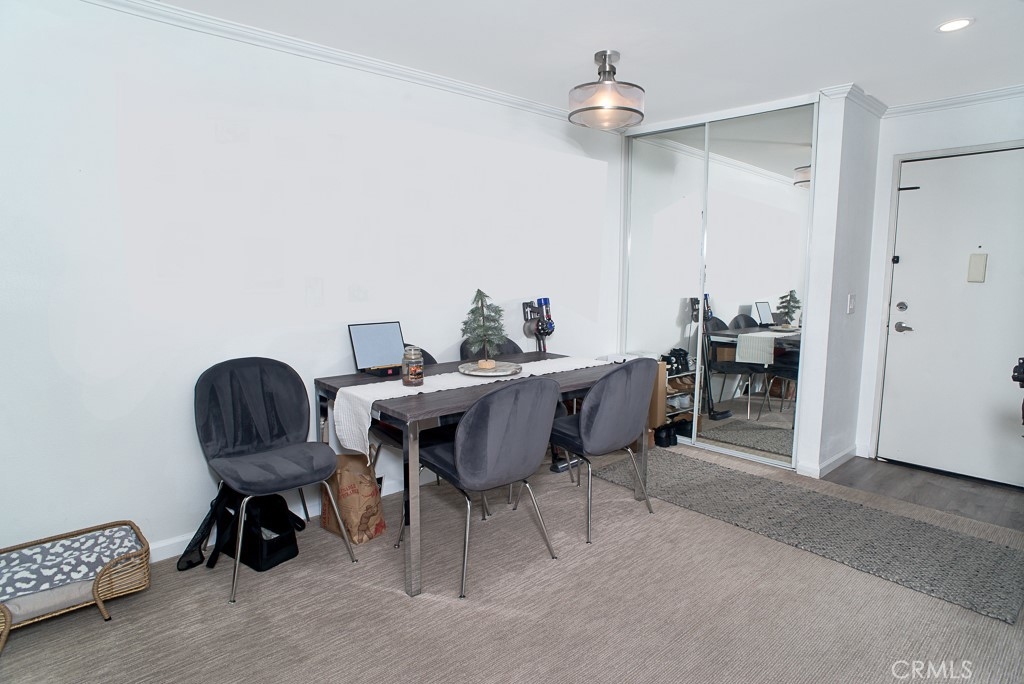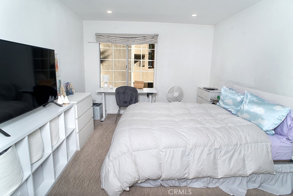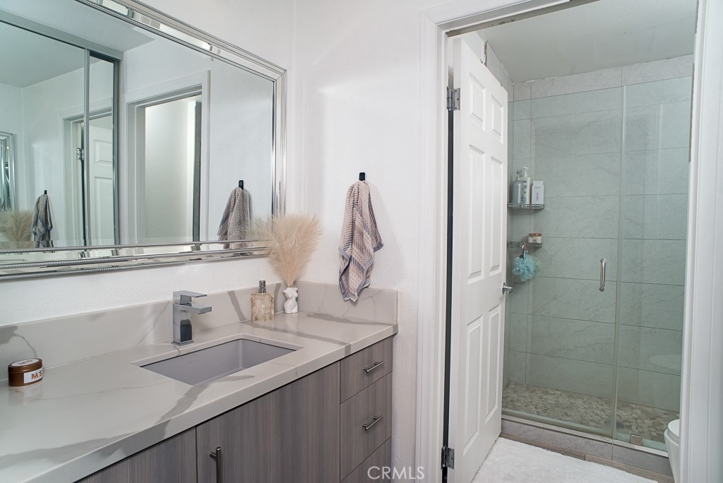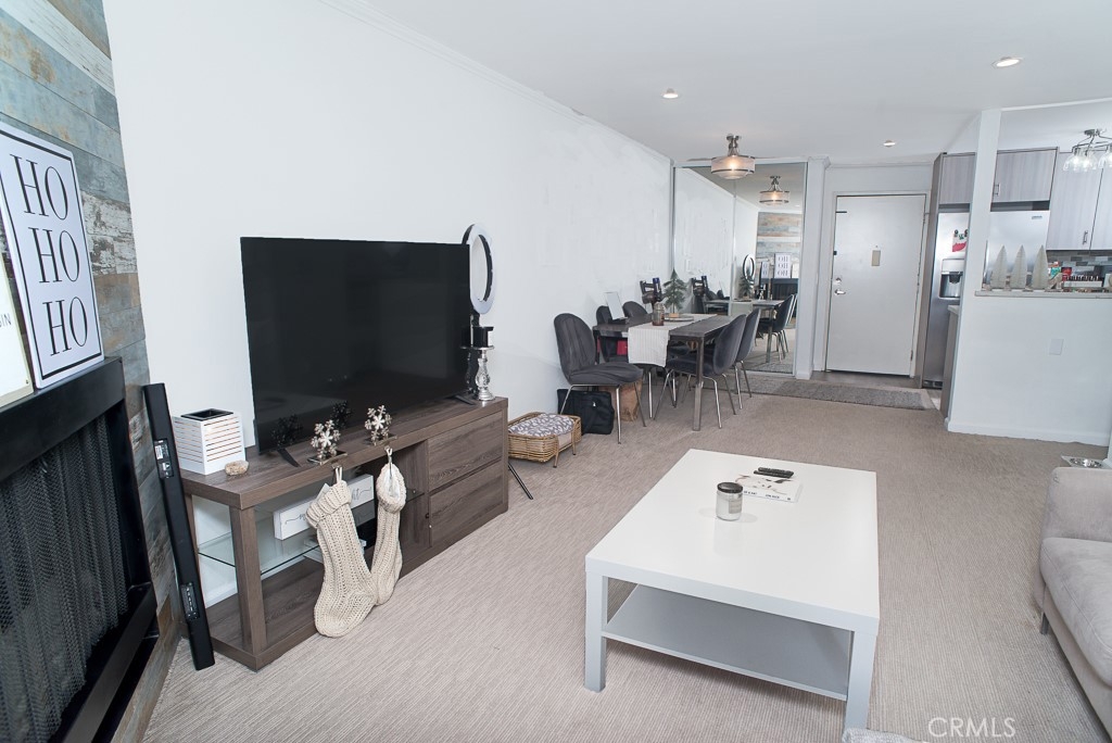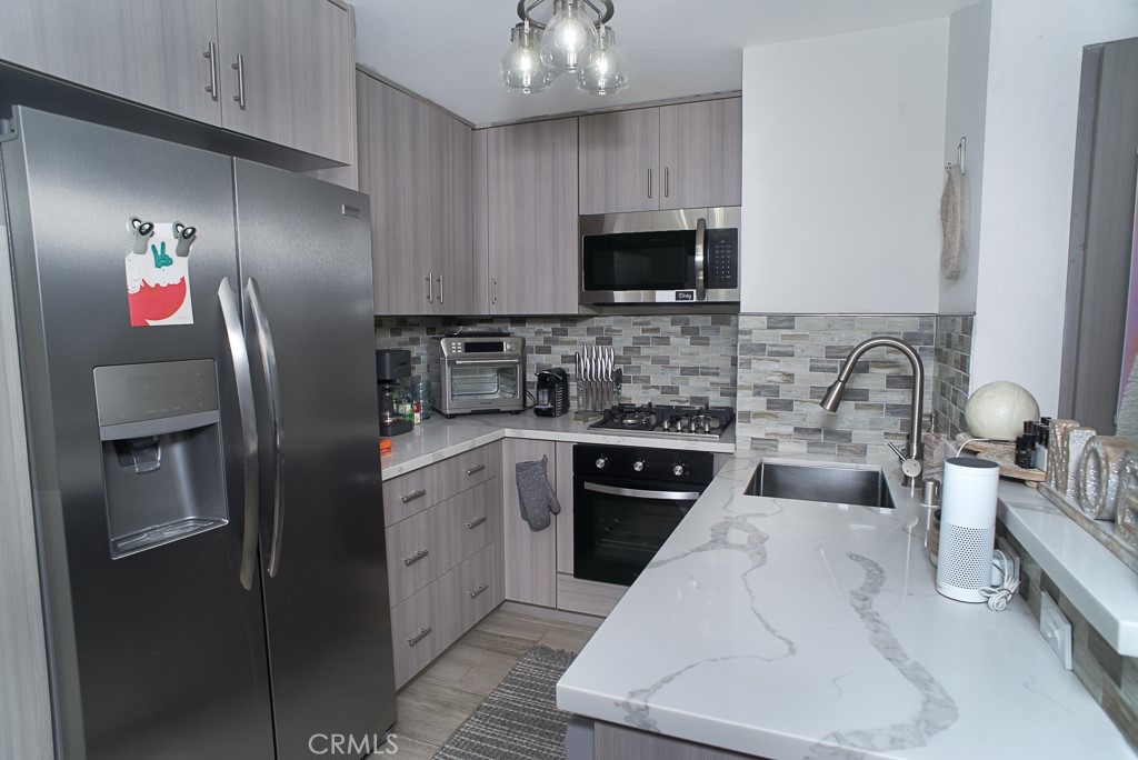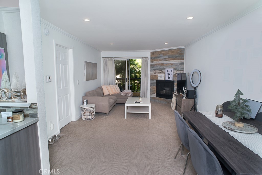 VACANT UNIT! Great investment opportunity or a place to call home. This uniquely remodeled 1 bedroom condo is a delightful blend of modern luxury and timeless charm and will be sold with furniture included. Nestled in a quiet pocket of the building, this unit stands out as a true gem. Once inside this cozy retreat you'll notice the neutral patterned carpet that flows throughout the home, recessed lighting, and the nearby kitchen boasting new stainless steel appliances integrated within the custom cabinetry. Just off the kitchen leads you from the dining to the living room which showcases a beautiful wooded mosaic around the fireplace. The bedroom is a cozy retreat, featuring large windows that bathe the room in natural light and offer a view of the surrounding greenery. The remodeled bathroom is a spa-like haven, adorned with a contemporary vanity and modern fixtures that elevate your daily routine. Outside, a private balcony provides a tranquil space to unwind and enjoy the fresh air. The Met, situated in the highly prestigious Warner Center, is an exclusive, guard-gated community spread across 26 acres of verdant grounds. The community consists of resort-style amenities including four pools, state of the art fitness center, six tennis courts, children's playground, expansive poolside deck, indoor basketball court and racquetball court all while being minutes to local shopping, dining and entertainment in the heart of Warner Center.
