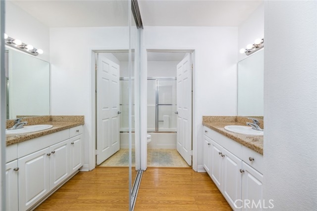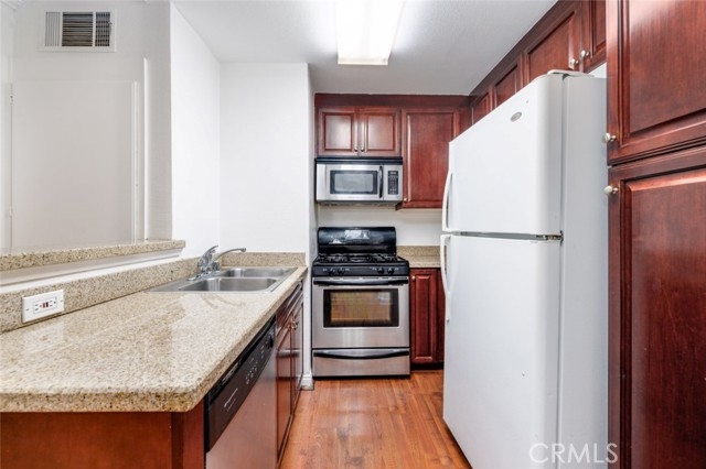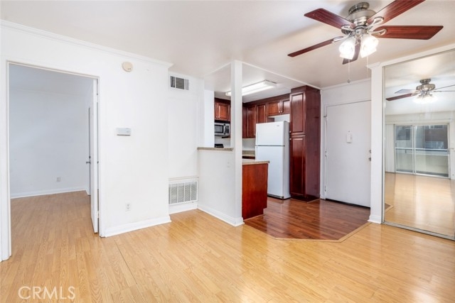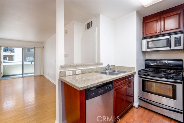 Discover comfortable living at The Met at Warner Center in Woodland Hills, where this 1-bedroom, 1-bathroom condo awaits. Step into a charming dining room and living room combo featuring crown molding, a corner gas fireplace, and sliding glass doors leading to a private balcony with storage. The dining room has a ceiling fan and offers extra storage with a spacious closet/pantry. A galley-style kitchen boasts granite countertops and a peek-a-boo passthrough to the living room. The bedroom offers dual closets, along with a full en-suite bathroom boasting a separate granite top vanity. The community offers resort-style amenities including four pools, four spas, fitness center with saunas, six tennis courts, basketball court, racquetball, and 24-hour security. Monthly dues include water and trash. Conveniently located near shopping & dining, including Westfield Topanga, outdoor recreation, and nearby access to the 101 freeway. This condo is move-in-ready with opportunities to add your own style and design. Don't miss your chance to experience convenient, luxury living!