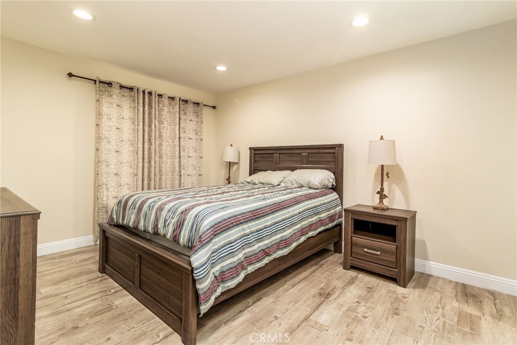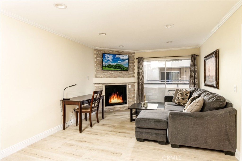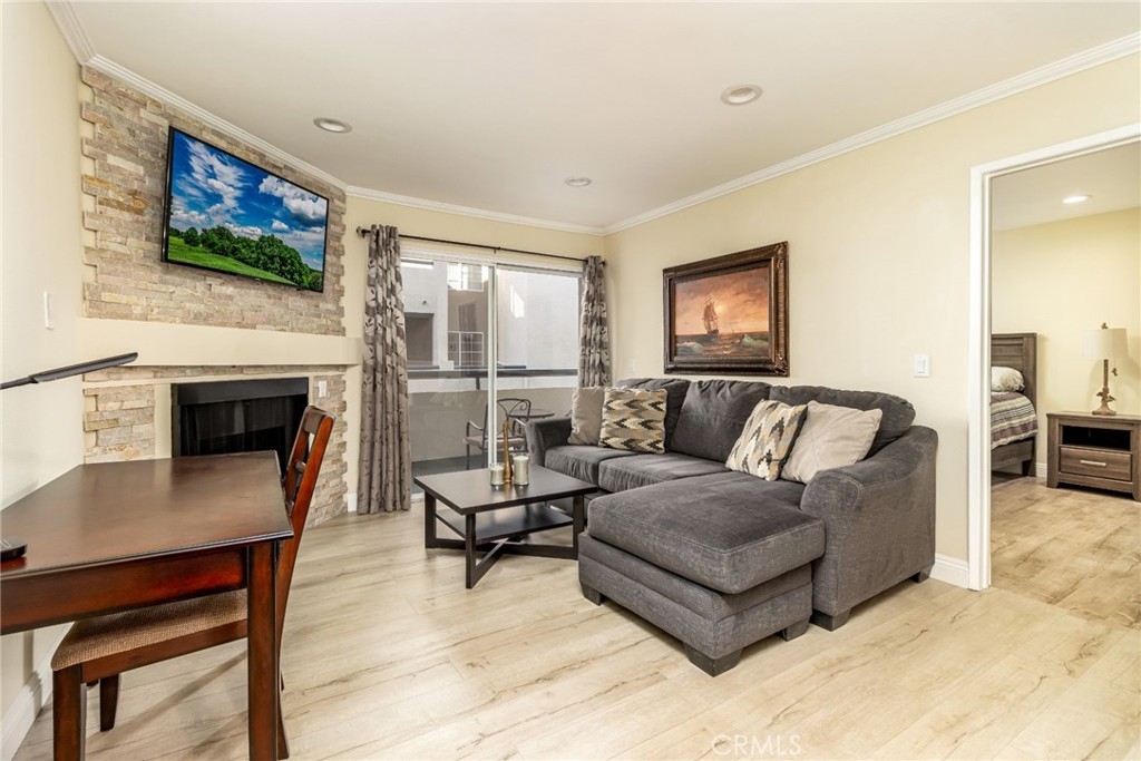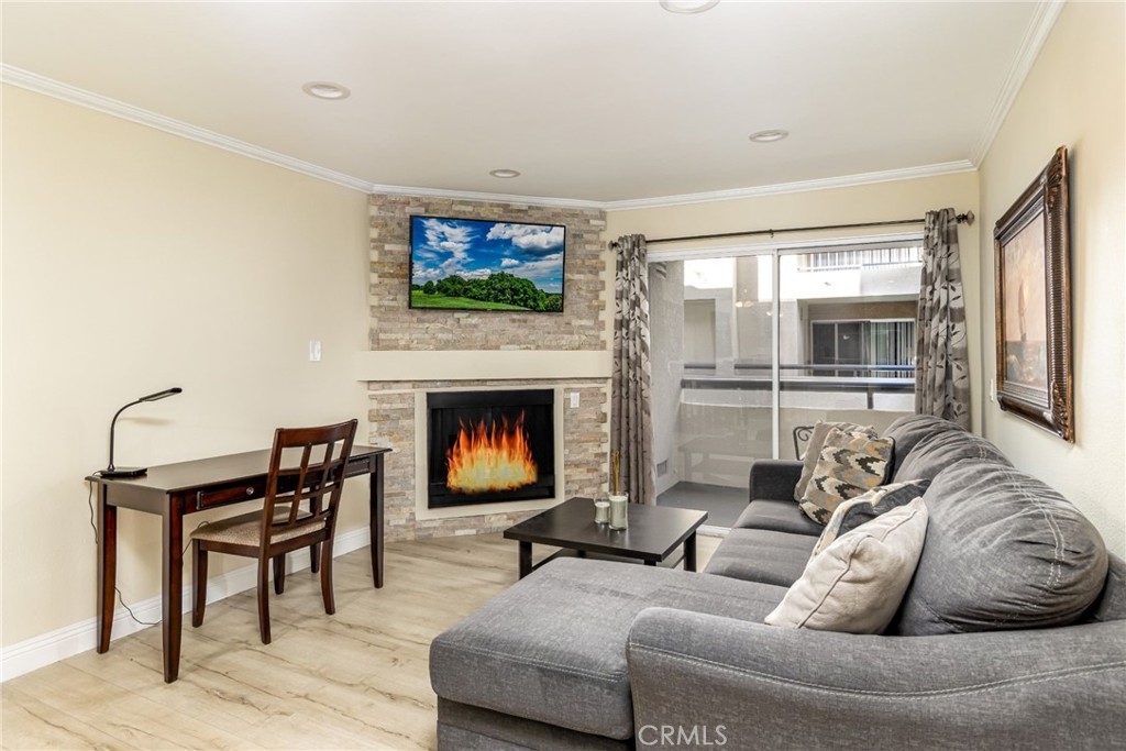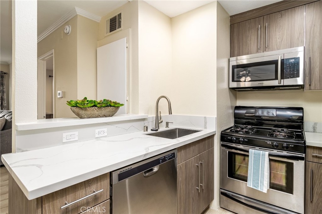Totally redone, newly remodeled modern kitchen and bathroom. 1 bed/1 bath, first level unit at highly desirable “The Met” community in Woodland Hills. Courtyard facing on north side of building, this beautifully upgraded condo opens to the kitchen and dining area expanding into the living room with a stone facade corner fireplace and access to the private patio with sliding glass doors. The brand new kitchen features breakfast bar, stainless steel appliances, quartz counters and custom cabinets with ample storage. En-suite bedroom with brand new custom bathroom, new custom vanity, quartz counter. Custom grey subway tiled shower/tub. Additional features include new paint, wide plank laminate wood flooring throughout, crown molding, smooth ceilings, recessed lighting. Private balcony. The Met provides resort style living at its finest with community amenities that include on-site laundry, 4 pools & spas, 6 lighted tennis courts, racquet ball courts, club house, state of the art fitness center, indoor basketball courts and subterranean secured parking with plenty of guest parking as well as 24 Hour security. Prime location - centrally located to warner center, The Village, shopping, theaters bars and restaurants. Don’t miss your opportunity to see this one!
