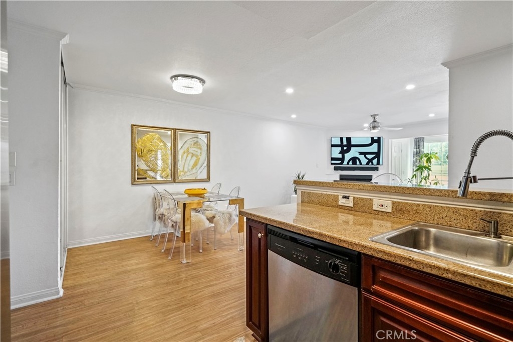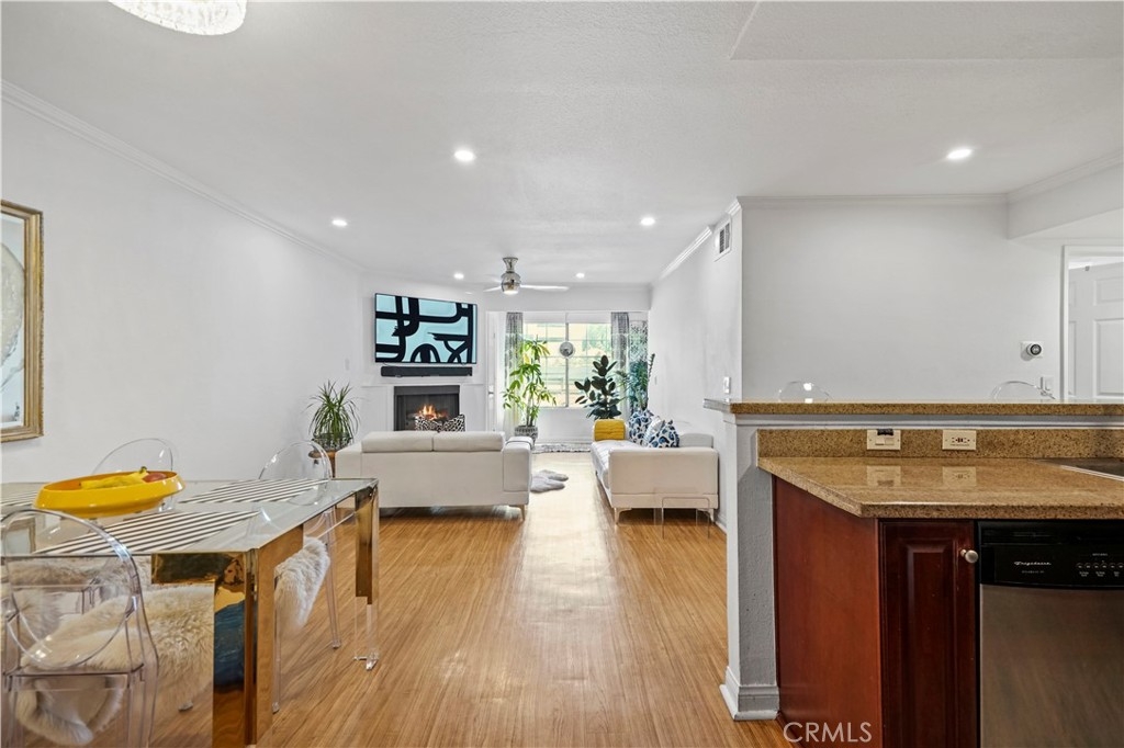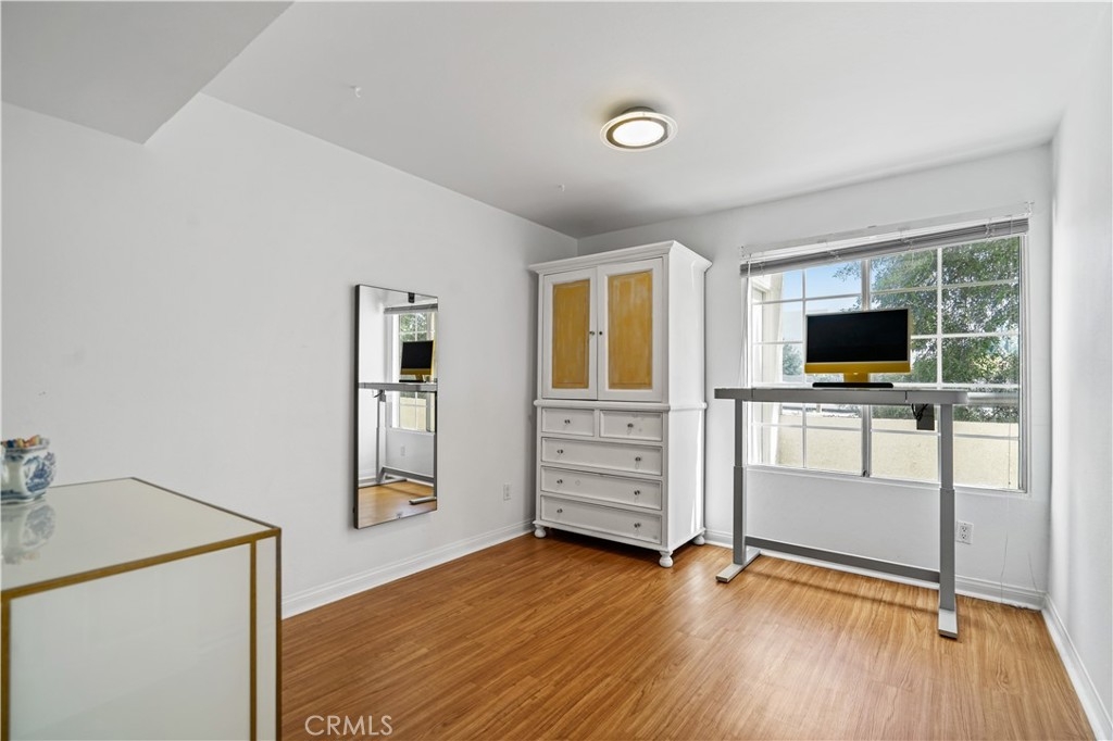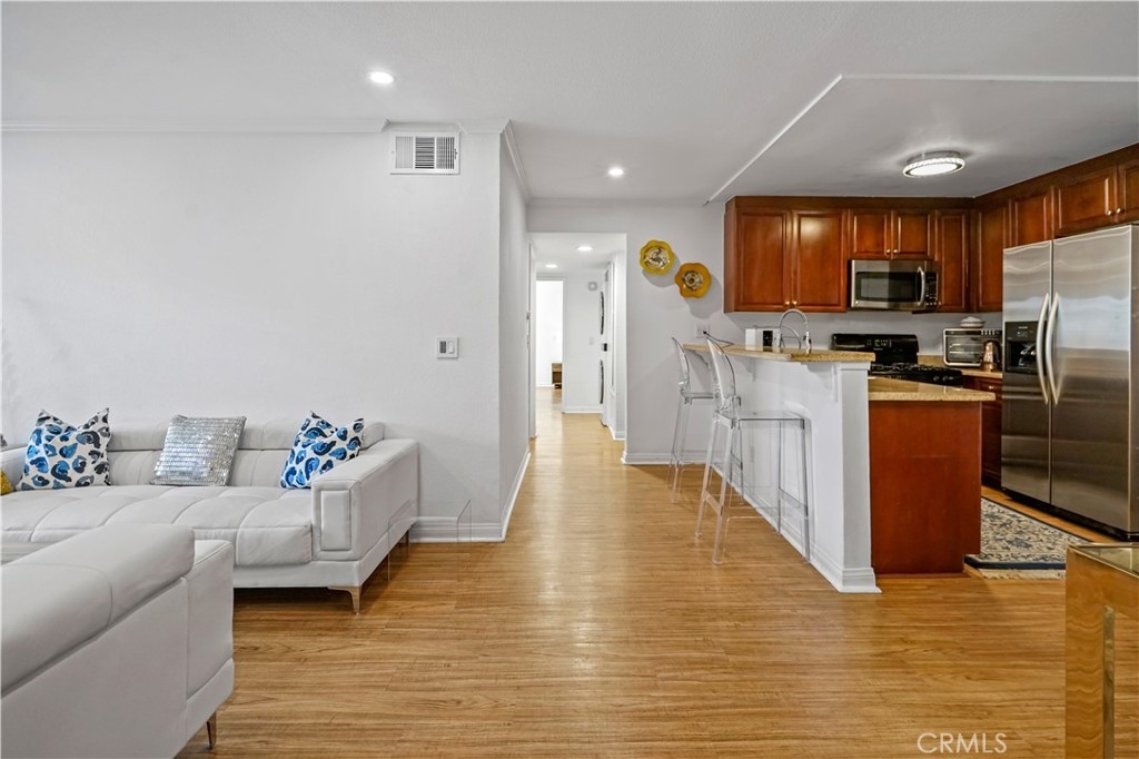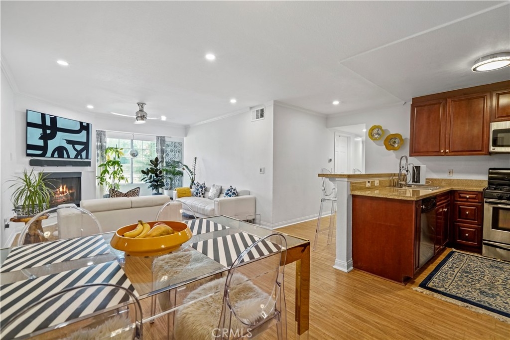 A truly rare offering of the highly sought after upgraded 3 Bedroom model showcasing an end unit location, updated finishes and large balcony. This wonderful home features an entertainer's floor plan which utilizes an open concept to provide both privacy and functionality. From the moment you enter, you will notice the abundance of natural light and storage offered by this floor plan. Upgraded finishes include: wood flooring, recessed lighting, recent painting, updated light fixtures, designer ceiling fans, Nest smart home equipment, stainless steel appliances, private washer/dryer and assigned 2 car covered parking for added convenience. The large private balcony offers the perfect space to play with your pet while basking in the beautiful year-round weather that Woodland Hills has to offer. HOA dues include water, sewer, trash, earthquake insurance, use of resort style amenities and 24 hour guard. The Met, situated in the highly prestigious Warner Center, is an exclusive, guard-gated community spread across 26 acres of verdant grounds. The community consists of resort-style amenities including four pools, state of the art fitness center, six fully lit North/South tennis courts, children's playground, expansive poolside deck, indoor basketball court and racquetball court all while being minutes to local shopping, dining and entertainment in the heart of the San Fernando Valley. A true getaway that you can call home.