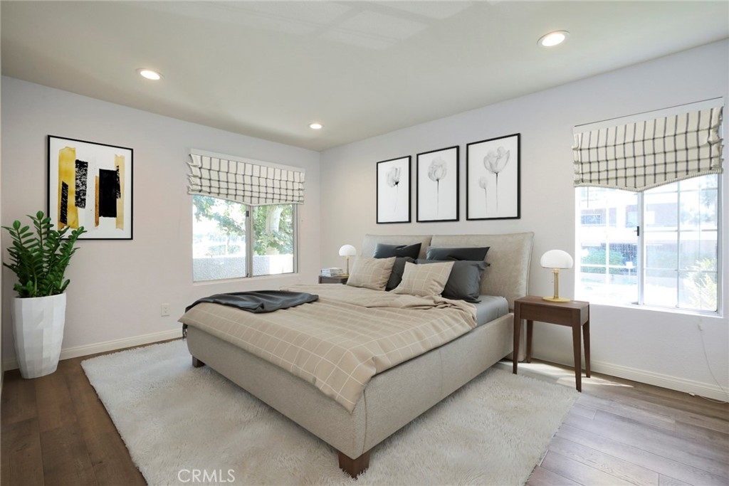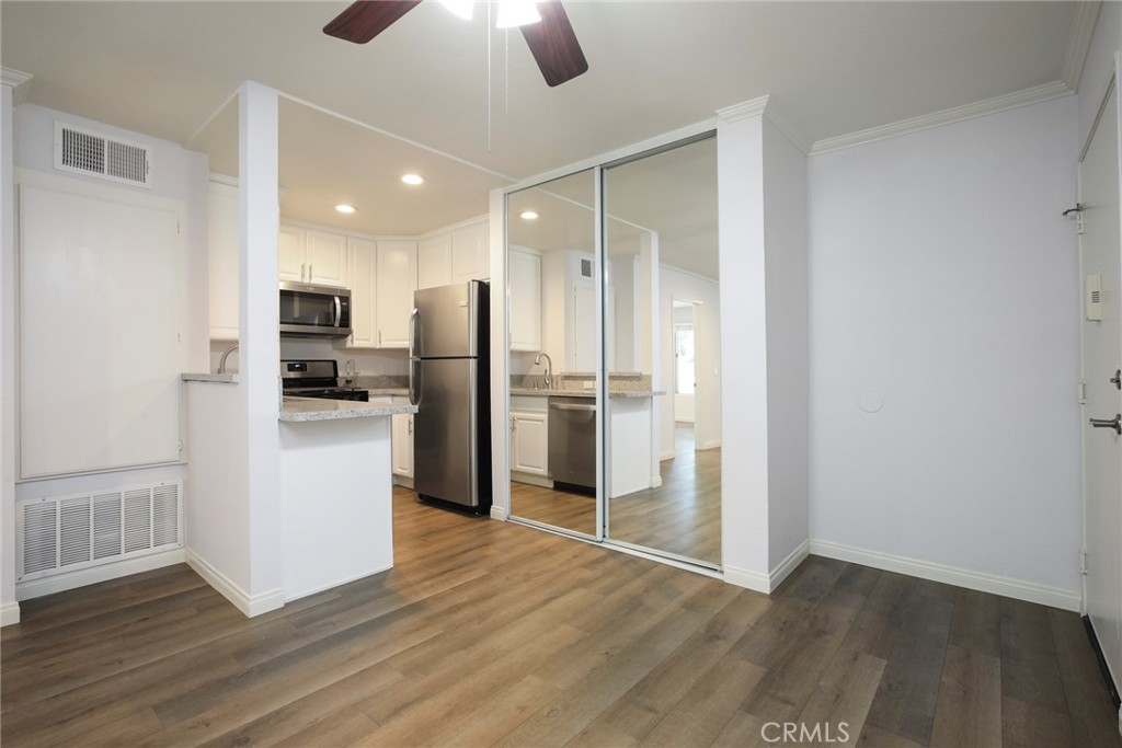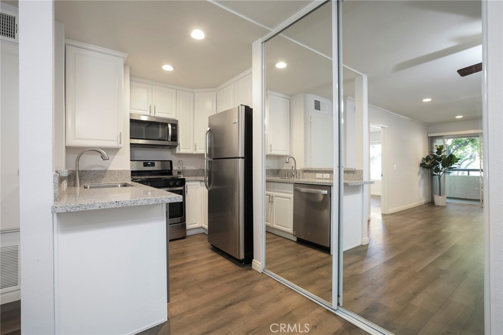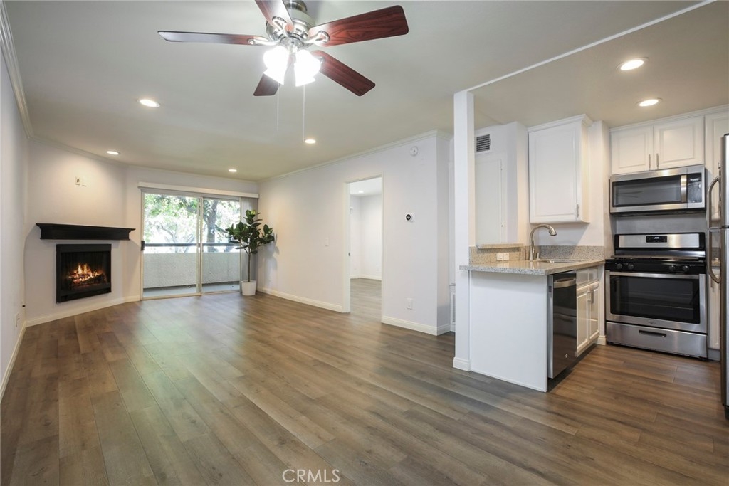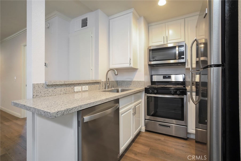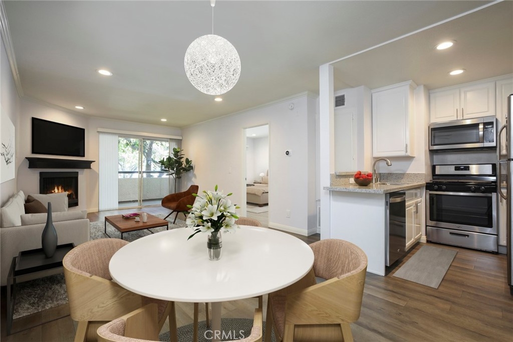 Welcome to The Met in Warner Center, Woodland Hills. FHA approved! This beautiful remodeled one bedroom, one bathroom corner unit has a spacious private balcony. Home also features renovated kitchen and bath, newer laminate flooring, recessed lighting, fireplace mantel, paint color scheme, appliances and Nest thermostat. One of the best locations within the community adjacent to the main pool, tennis courts, and gym. 2 car tandem parking spaces are assigned to this unit. The Met is a pet-friendly, guard-gated, resort-style community that offers 24-hour security. Amenities include 4 swimming pools, spas, tennis, basketball, and racquetball courts, a fitness center, sauna, playground, and a clubhouse. Prime location in Warner Center; the West San Fernando Valley's premier employment, luxury shopping, entertainment, and lifestyle destination. There is so much value and upside due to multi-billion dollars in development plans in accordance with the Warner Center 2035 Specific Plan approved by the City of Los Angeles. Adjacent to the Westfield Promenade 2035 work/live/retail development. *Living, dining, and bedroom photos have been virtually staged.