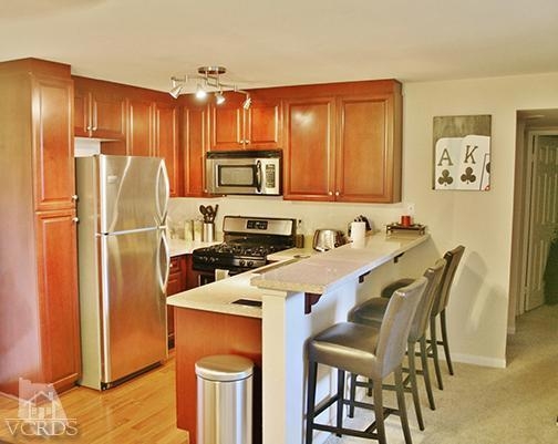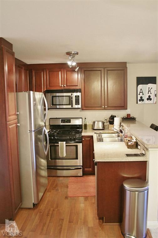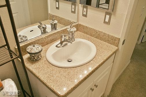 MOVE IN READY! One of the rarest and most private units in The Met! This premiere 2 bed 2 bath 3rd story end unit has desirable vaulted ceilings and an open floor plan great for entertaining. Kitchen is beautifully remodeled with granite counter tops,breakfast bar, modern lighting, cherry cabinets, wood like floors and newer stainless steel appliances which all come with the sale including washer/dryer and refrigerator. Living room includes an intimate fireplace for the cold nights and wall length windows to make it light and bright on the sunny days. Bathrooms are elegantly remodeled with granite counters and newer fixtures. Small building located on quiet cul-de-sac with private gated entrance so no need to drive through the entire complex. 24 Hr Security, Elevators, Clubhouse, 4 Resort Style Pools, 6 Lighted Tennis Courts, Racquetball Court, Basketball Courts,24 Hr fitness gym with sauna and steam showers. Close to all Warner Center Shopping and Businesses,Restaurants,Parks & more!