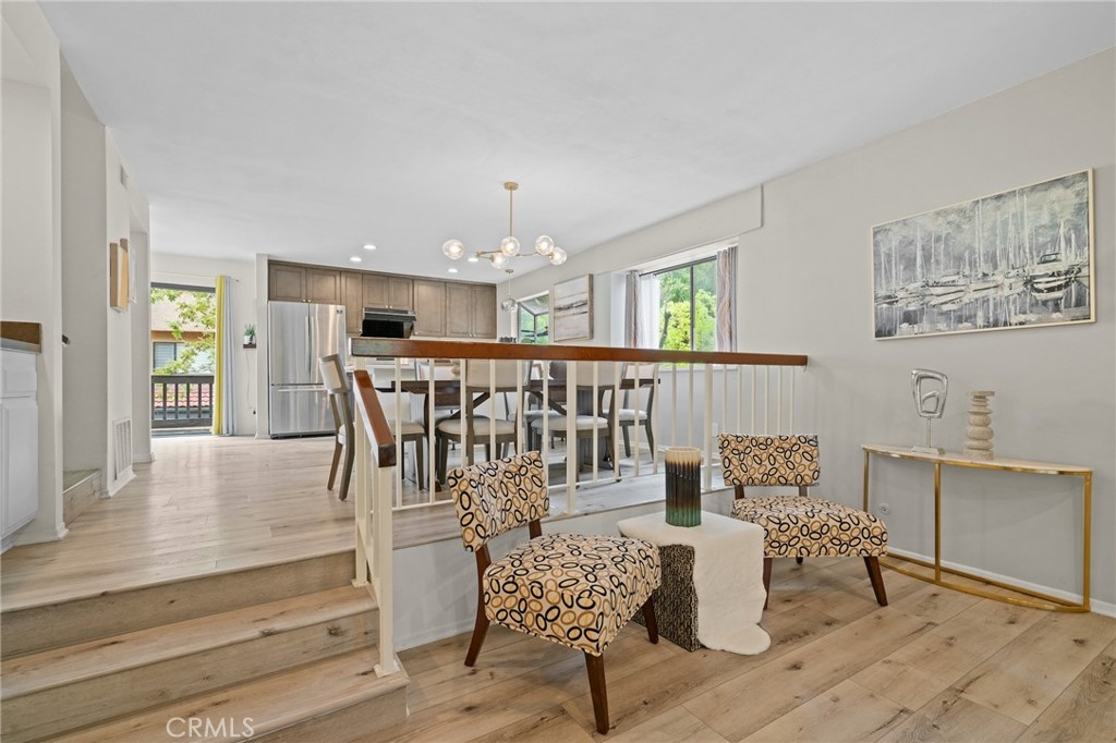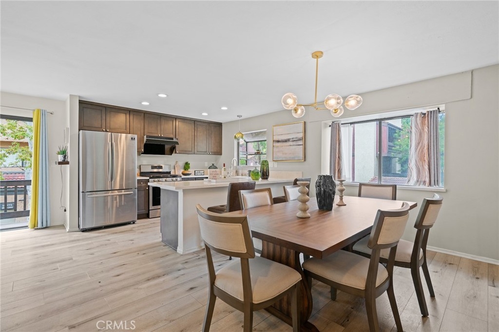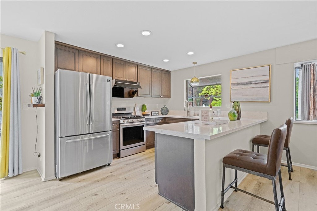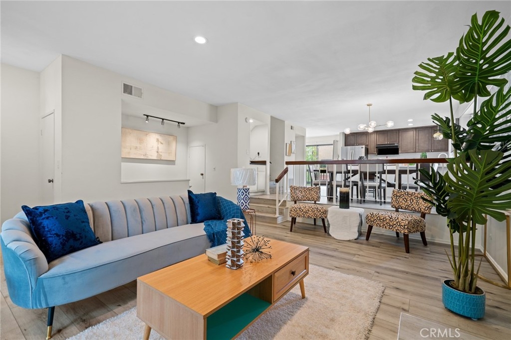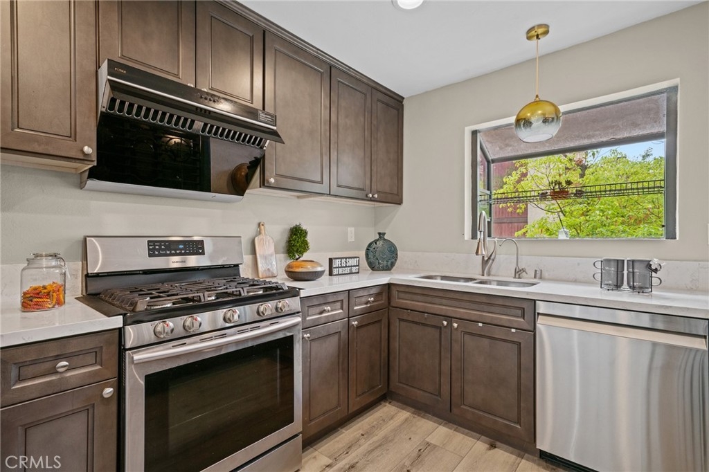 Wonderful opportunity to enjoy a beautiful end unit and recently remodeled townhouse. Best location in in resort-style Woodland Hills Warner Village III : quiet end-unit, off-street, close to the mail box, serene and foliage views. At an abundant 1,631 sq ft, it offers 3 beds + 2.5 baths + a downstairs bonus room + direct-access to the garage with two premium spaces. This home is equipped with a smart thermostat, and an EV charger in the garage. No detail was overlooked in appointing this home with the finest features. An open floor plan welcomes you into a bright, spacious living room with two additional end-unit windows, fully upgraded laminate floor, unique designer ceiling/wall lighting, freshly painted eggshell wall, and a generous balcony. The kitchen is outfitted with an open design, featuring a quartz counter top, custom cabinetry, pull-out drawers, stainless steel appliances, and a water filtration system. Upstairs two comfortably-sized guest rooms with vaulted ceilings, a contemporary full bathroom, and a spacious ensuite master bedroom. The master room also has vaulted ceilings, with a full walk-in closet with custom shelving and a large balcony perfect for your morning coffee. Bathroom in the master room is upgraded with wood cabinet, quartz counter top, new bathroom vanity. There is a bonus room downstairs (extra 300 sq ft) with bright light from end-unit windows. Perfect as an office, screening room, play room or home gym, etc. Don’t miss this opportunity before it's gone!