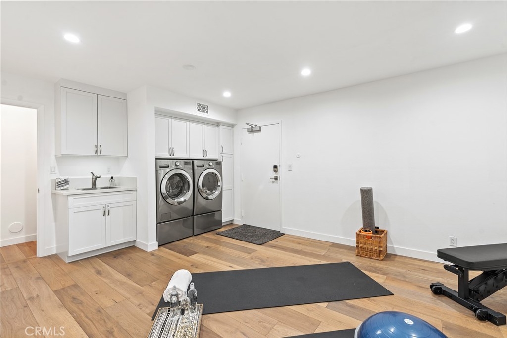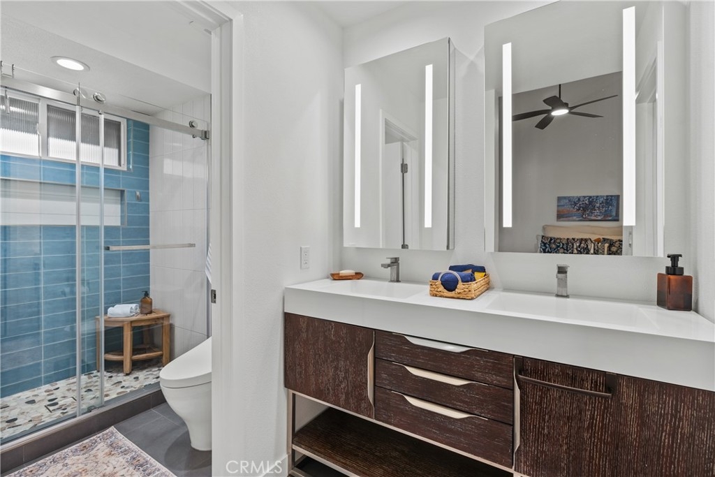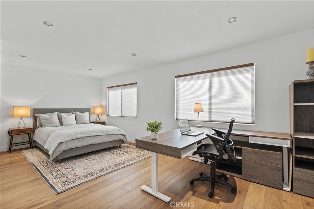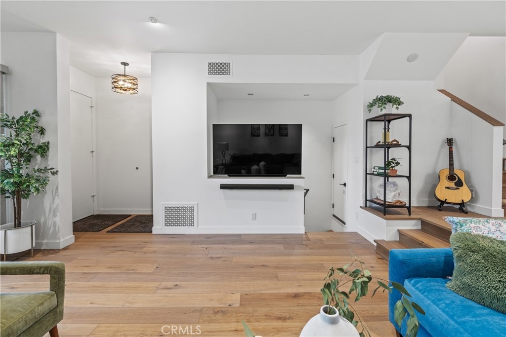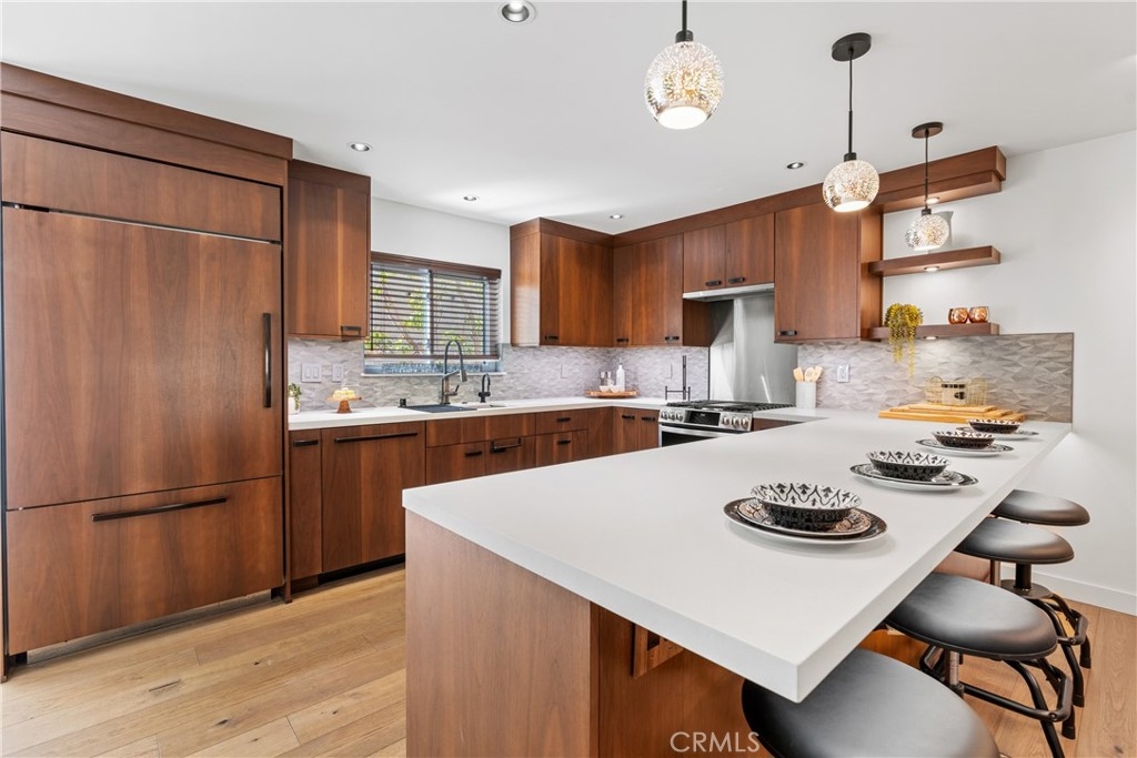 LUXURY NEW YORK LOFT EXPERIENCE IN THE HEART OF WARNER CENTER Discover a rare blend of sophisticated design and top-tier finishes in this meticulously remodeled, one of a kind townhome. Open-concept kitchen enhances the living space, combining elegance with comfort. Wide-plank Renew engineered wood floors, skim-coated walls and top level recessed lighting throughout the home. Chef-inspired Kitchen appointed with Custom Walnut Omega cabinetry, expansive CaesarStone counter for prep and seating. GE Monogram refrigerator and Bosch dishwasher are paneled and counter depth. Zephyr retractable stove fan, and large capacity sink with touch-activated faucet. Dining area steps down to living room which features elegant CaesarStone fireplace. Large sliding glass door opens to private deck, overlooking lush landscaping replete with trees, meandering streams and bridges. Primary bedroom serves as tranquil retreat, with soaring ceiling, generous closet space, and direct access to private balcony. Spa-inspired primary bathroom features large stone mosaic-tiled shower, James Martin vanity and Robern mirror with integrated lighting. Spacious second bedroom can easily be converted to 2 bedrooms. Hall bath with high end fixtures and opulent Hydro Systems tub. Exercise/play room features Omega laundry cabinet system. Clean, spacious 2 car garage equipped with 220v outlet for EV charging. Quiet and secluded townhome community offers resort-level amenities, including three swimming pools with spas, a tennis court, racquetball court, and sauna. Warner Center park is adjacent for play, walking and summer evening concerts. Minutes from Topanga Village, Ventura Blvd. and convenient freeway access. Effortless access to outstanding dining, shopping, and entertainment. Furnishings may be purchased outside of escrow.