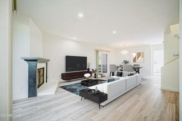 This stunning end-unit, tri-level townhome is located in the highly desirable Warner Woods in the heart of Woodland Hills. Freshly painted with beautiful waterproof flooring throughout, from the moment you enter the sun filled living room with cozy fireplace, a convenient wet bar and private patio, you will feel right at home. The formal dining area is open to the living room and its own balcony and there's also a half guest bath on this level. The kitchen was recently remodeled with quartz counter tops and stainless steel appliances and has a perfect kitchen nook to enjoy your morning coffee. Upstairs you will find the large primary suite complete with high vaulted ceilings, a wall-to-wall closets plus a walk-in closet, an en-suite bath and a private balcony. The spacious secondary bedrooms also have high vaulted ceilings and share a full bath. Downstairs you will find a versatile bonus room perfect for a home gym, an office or even an extra bedroom, the laundry area and access to your 2 car attached garage with tons of storage. Warner Woods offers lush landscaping with picturesque streams and waterfalls as well as 2 community pools and spas and a clubhouse. This prime location is across the street from Warner Center Park, is close to ''The Village'' and so many other shops and restaurants. Come call it your home sweet home!