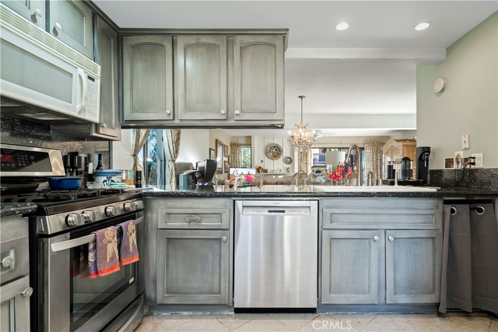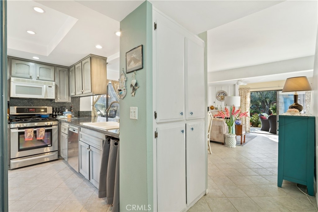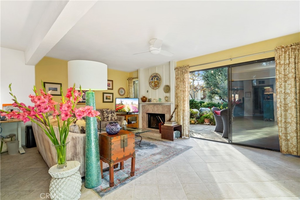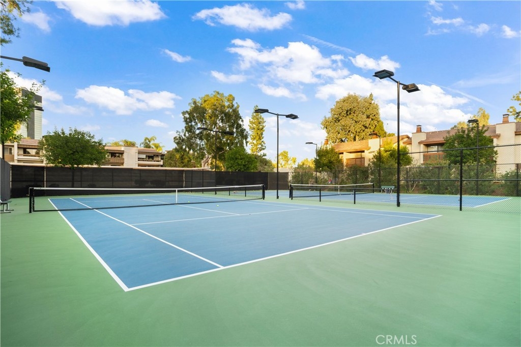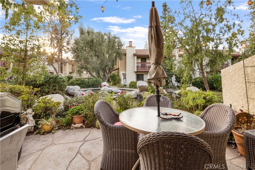 With scenic views of babbling brooks and trees from almost every room, this charming townhome is your own piece of paradise in the city! Tastefully updated, this 2-story end-unit offers a delightful floor plan perfect for modern-day living. Downstairs you'll find a well-appointed kitchen with granite counters and stainless steel appliances, open to a roomy dining area and spacious living room with cozy fireplace. A convenient powder room with granite counters, plenty of cabinetry for storage, and a serene waterfront patio perfect for enjoying the outdoors round out the main floor. In the privacy of the upstairs, you'll find a wonderfully handy office area with built-in desk, a comfortable guest bedroom with views of the greenbelt and streams, a full guest bath with new vanity mirror, and newer stacked washer and dryer. The beautiful primary bedroom suite offers soaring high ceilings, a balcony overlooking the water, and a private en-suite bath with quartz counters and new vanity mirror. Plus, a private detached 2-car garage, fantastic HOA amenities including a pool, spa, tennis courts, and sauna, and prime Warner Center location within ±1 mile of The Village and Warner Park make this home the perfect place to live, work, and play!