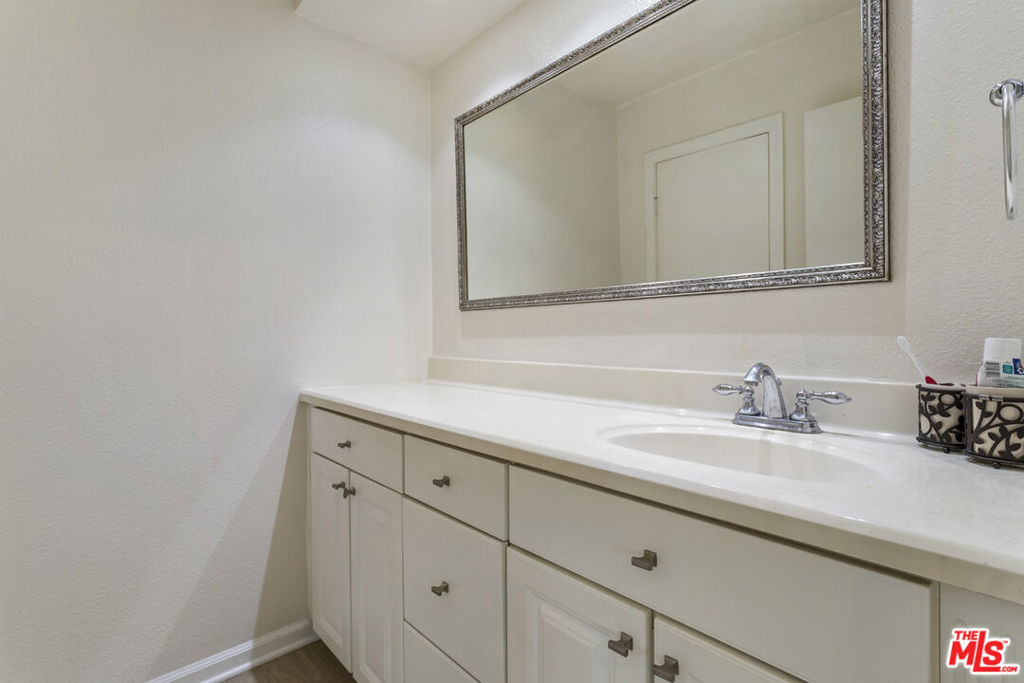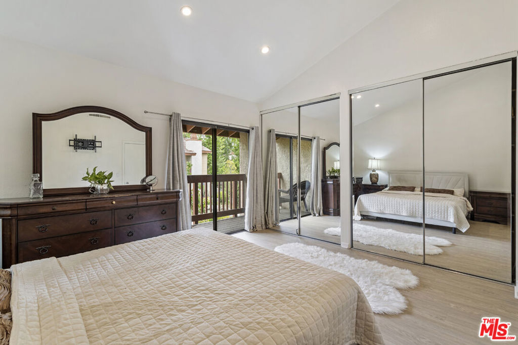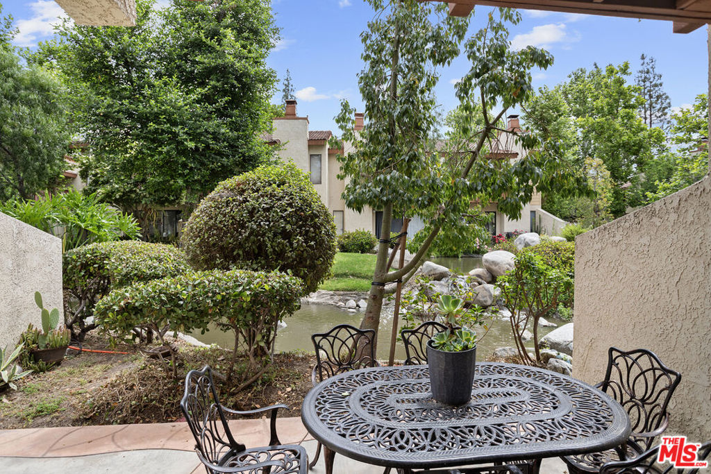 Move-in-ready townhome located in the highly desirable Warner Center of Woodland Hills. A peaceful retreat surrounded by lush landscaping, ponds, and mature trees, this home blends modern design with serene living. An updated kitchen with stainless steel appliances opens to the living room with a cozy fireplace and sliding doors leading to a private patio overlooking tranquil water features- the perfect spot to unwind to the sound of flowing water. A guest powder room adds convenience on the main level. Upstairs features two bedrooms and a full bathroom with a shower. The primary suite offers vaulted ceilings, a private balcony, and a separate vanity with sink for added comfort. Additional features include in-unit stackable laundry, central heat and air, and beautiful flooring throughout. Parking includes one shared garage space, an assigned spot in front of the unit, and ample guest parking. The Warner Woodlands community offers resort-style amenities with a pool, spa, sauna, two tennis courts, and tranquil walking paths surrounded by water features and greenery. A perfect blend of calm and convenience in the heart of Warner Center.