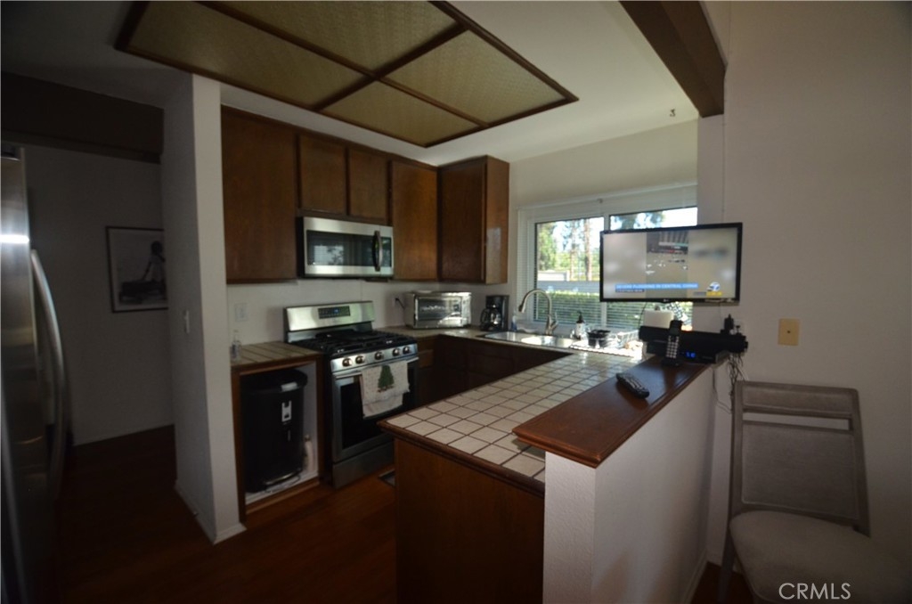 You know that old chestnut, Location, Location, Location? Well, this one has it in spades! So close to Pierce College, this would be a great unit to be in if your high-schooler is planning on attending there! Or maybe you already have children going there & want to provide them housing & pick up a great investment at the same time! Or maybe you want to be near Warner Center with its many shopping, entertainment & fine dining offerings to be found at The Village, Costco, & Topanga Mall! So close to Warner park & the frequent events they have there! Easy access to 101 freeway! And if that wasn't enough, look at what this wonderful townhouse offers you! End unit, only one shared wall, with no one above you, & no one below you! Private two car garage with LOADS of storage space, direct access to the unit. Nice split level unit, so for those concerned with stairs, there's no need to go up more than a half flight of stairs at any one time! On the split level, ya got the kitchen, dining & living room. On the top floor, the bedrooms & bathrooms. Plus new high quality dual paned windows & Sliding Doors! If you got a little Edith Kravitz in ya, the front kitchen window looks out onto the guest parking & entry gate...Keep an eye out on the comings & goings of your neighbours & guests! ;-) Wonderful cozy kitchen, adjacent to a formal dining room! Private brick patio is enclosed by a stucco privacy wall, & can be accessed either via the dining room, or the spacious Living Room. Living room is the perfect place to hang out & entertain friends if there's a big sporting event going on, & it has a brick gas fireplace which is great for creating a romantic atmosphere if you've got an evening of chick-flicks on tap. The master bedroom is very large, with cathedral ceilings & can easily accommodate a king size bed, & a wardrobe/dresser set & some end tables, & have room left over! There is a good sized walk-in closet off the bathroom, and there is a privacy door that separates the sink/closet area from the toilet/shower/tub. There is also a second bedroom which would make a great home office, and the guest bathroom is also located on the top floor. Then, just look at the complex! The upscale Warner Woods is like a relaxing Oasis with lush landscaping, streams, fountains and ponds with a pool and spa and tennis court. It's like being on vacation in a Resort, only you live there! Man! Don't miss this or you'll be kicking yourself!