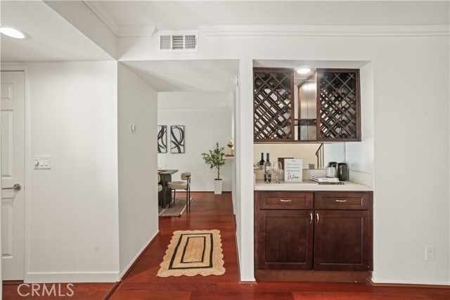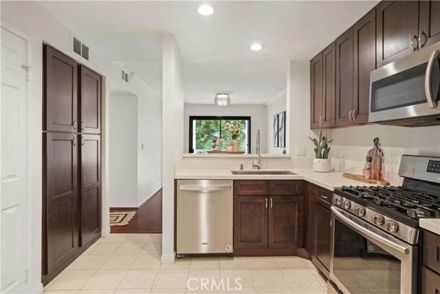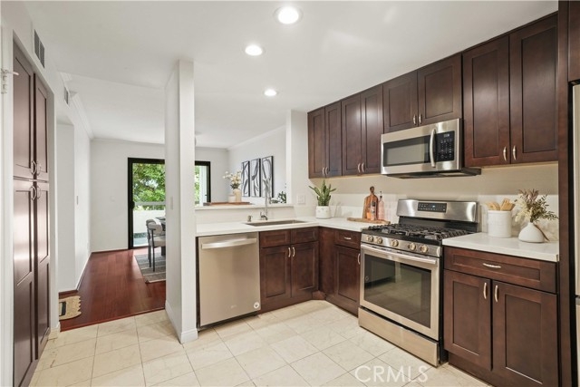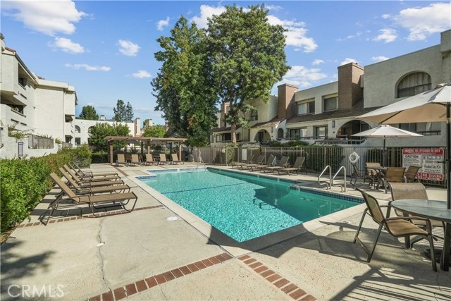 Beautifully Upgraded two story Townhouse in Woodland Oaks, Situated in the desirable Woodland Oaks gated community, this 2-bedroom, 3-bathroom townhouse has been tastefully upgraded throughout. The bright open floor plan features beautiful engineered wood flooring , recessed lighting, and a spacious living room with gas fireplace that opens to a private patio, perfect for entertaining.The remodeled kitchen includes quartz countertops, new cabinetry, stainless steel appliances, and a convenient laundry closet with full-size washer and dryer. The dining area opens seamlessly to the remodeled kitchen and extends to a second private patio, creating the perfect setting for indoor-outdoor entertaining. A powder room completes the main level. Upstairs offers two large ensuite bedrooms. The primary suite features dual closets, including a walk-in, and a brand new vanity and Brand new bathroom. The secondary suite also has its own private bath, brand new vanity and ample closet space. Additional highlights include a detached two-car garage, central HVAC, and thoughtful finishes throughout. Community amenities include a pool, spa, and recreation room, all within beautifully landscaped grounds. Prime location near shopping, dining, Costco, Topanga Mall, The Village, Calabasas Commons, freeway access,