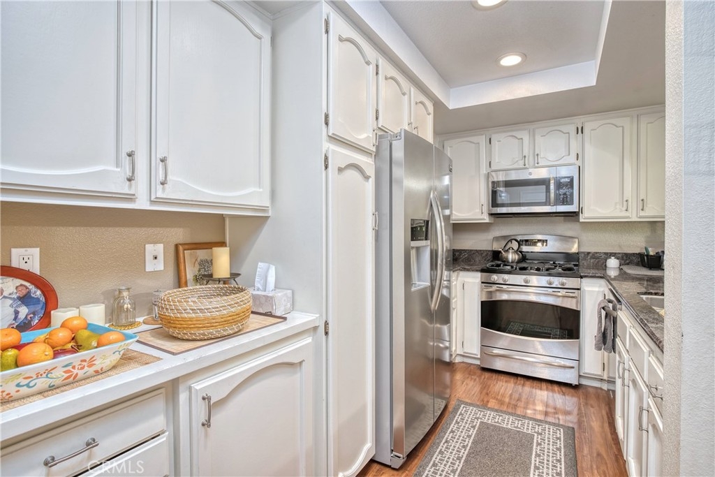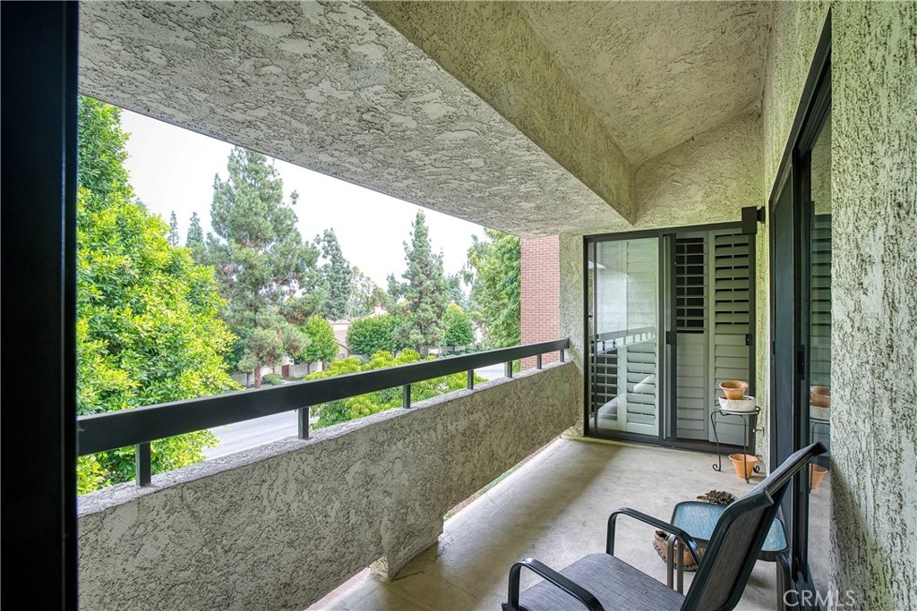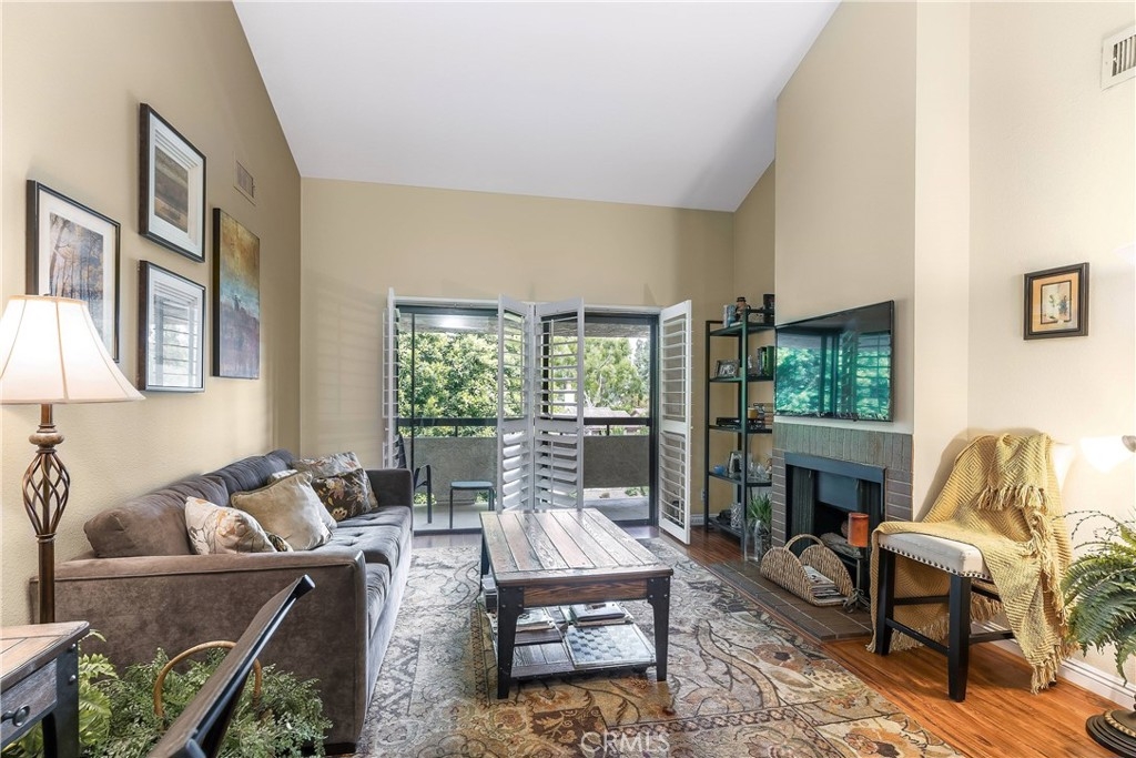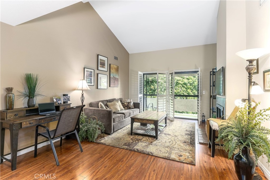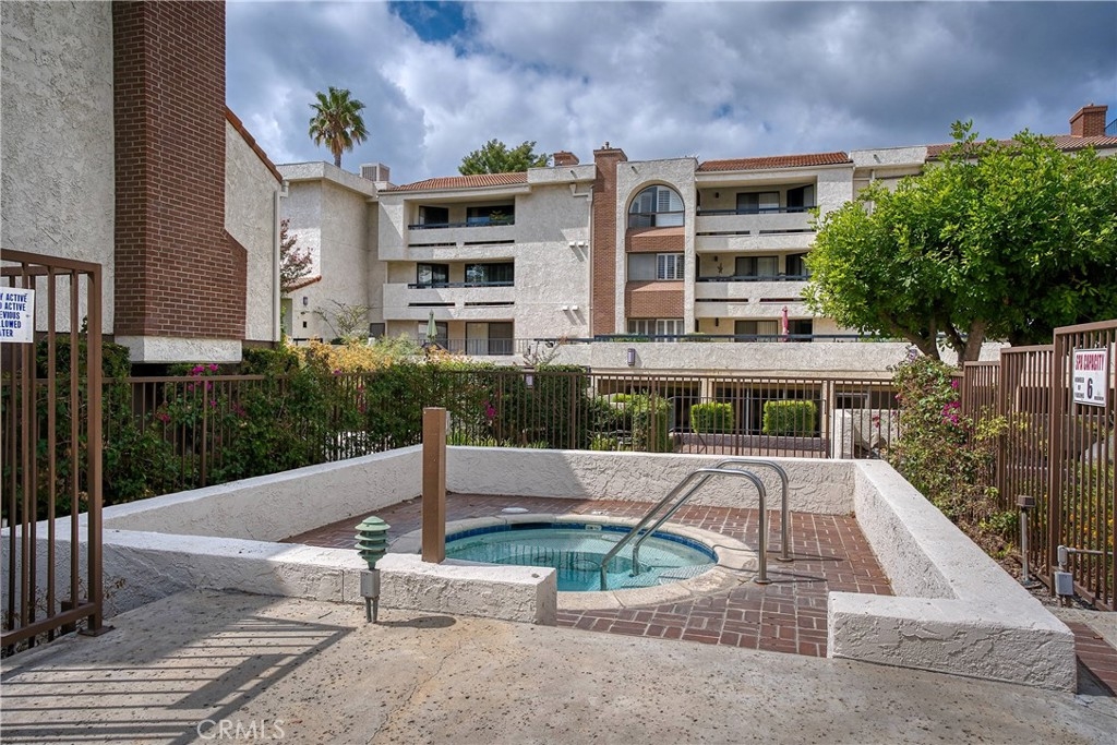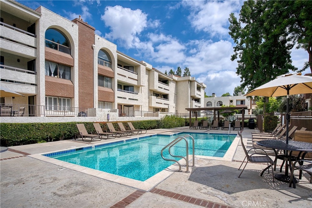 Desirable 2-bed, 2 bath, top floor single-level condo in the desirable Woodland Oaks complex. The open floorplan features a bright and airy living room with a gas fireplace, beautiful kitchen with granite counters and easily accessible appliances, a breakfast bar that opens to the dining area. The spacious primary bedroom features a vanity area with dual sinks, a private bathroom, walk-in closet as well a secondary closet. The second bedroom is on the opposite side of the living room, with an additional full bath in the hallway. Both bedrooms and the living room have access to a large balcony. A separate laundry room with a full-sized washer/dryer and ample storage is located just off the kitchen. The unit also comes with two tandem parking spots and an additional storage locker. The well-maintained complex includes private grounds with a heated pool, jacuzzi, gym, and large clubhouse. HOA includes water, trash, and EQ insurance. Great Warner Center location.