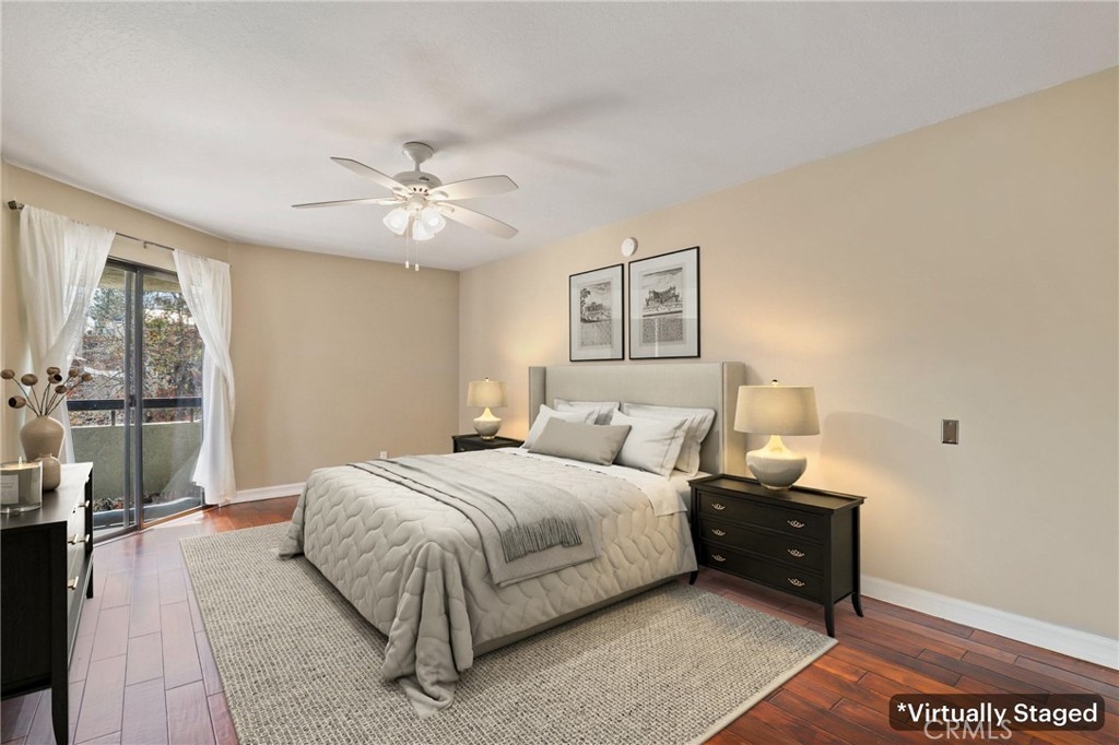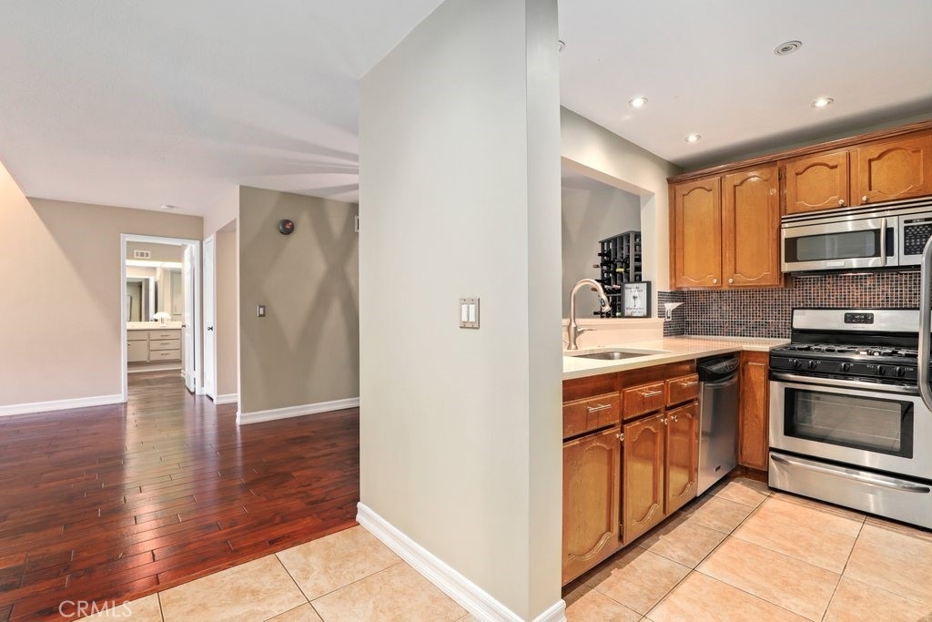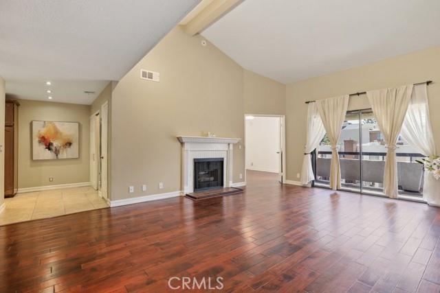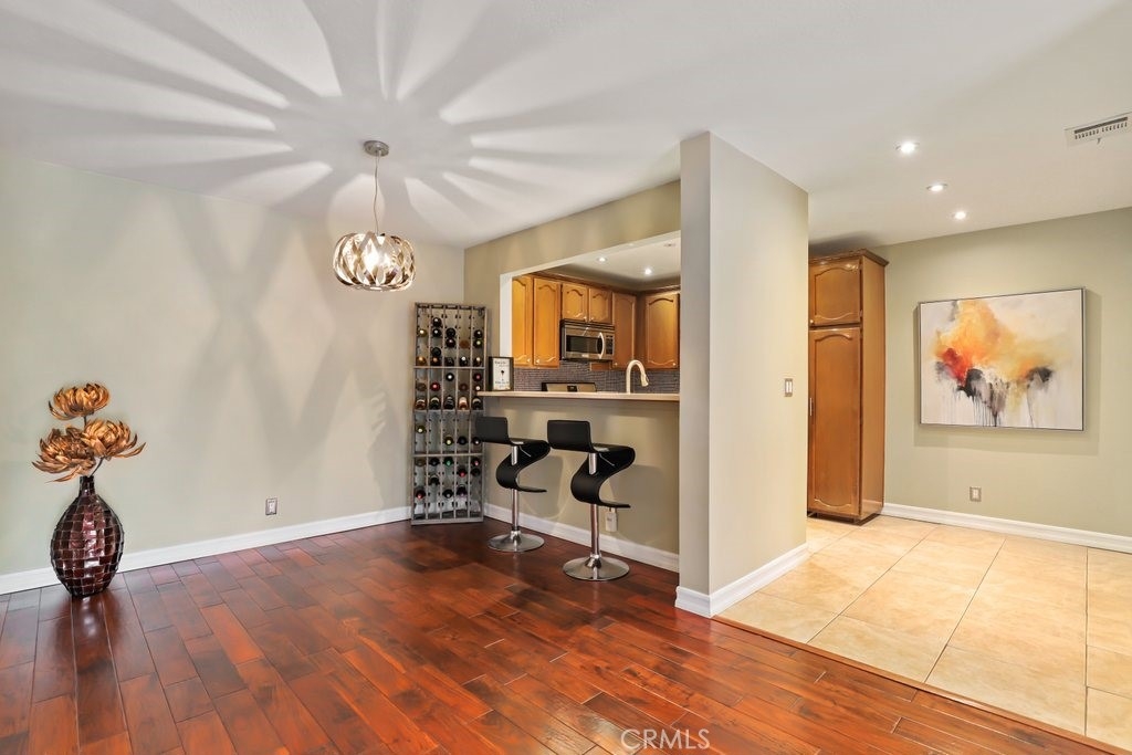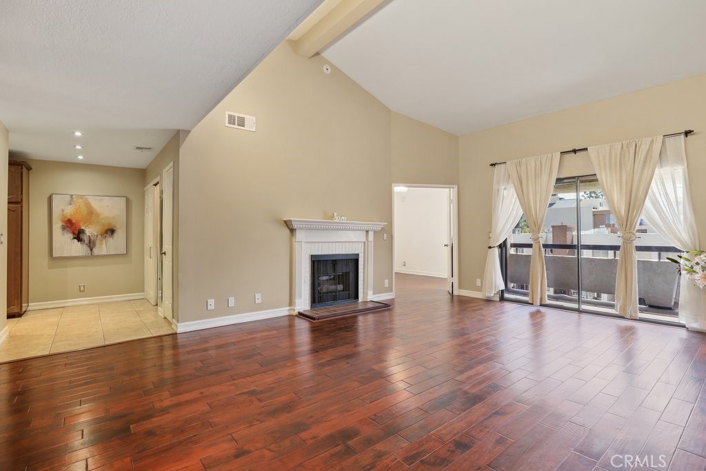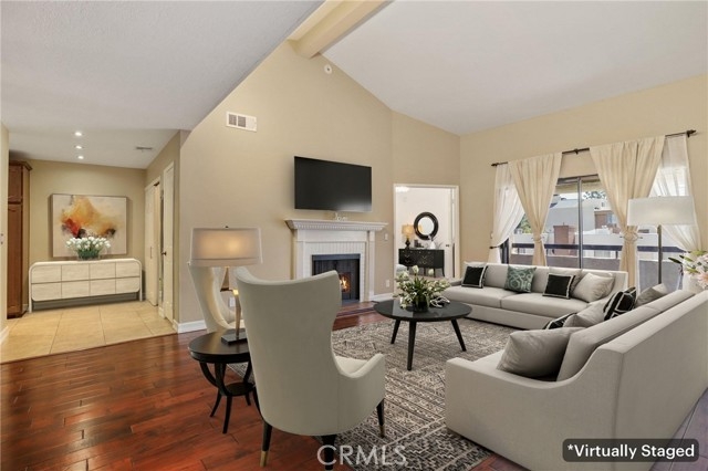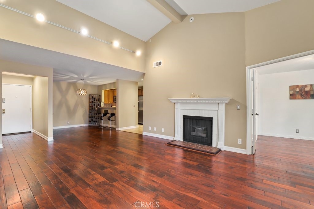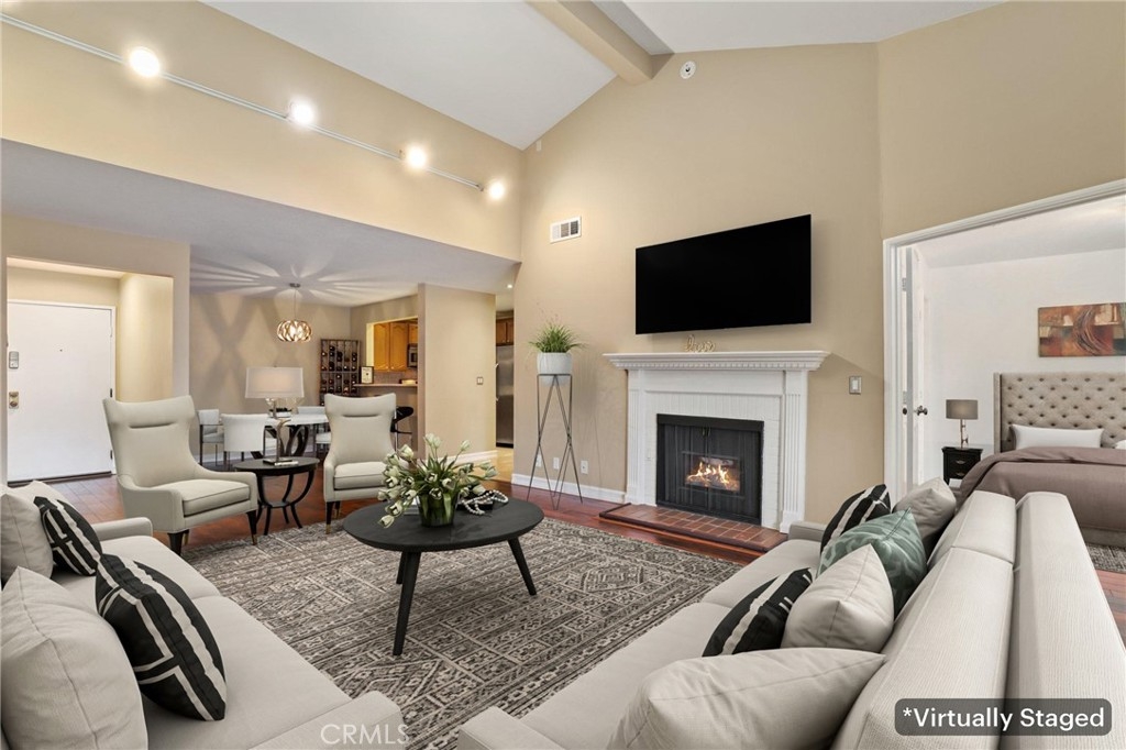 Upgraded top floor home! Come home to this beautifully cared for top floor home featuring vaulted ceilings, wood floors, upgraded kitchen and bathrooms, and brand new HVAC. Cooking in the spacious kitchen is a joy with new quartz counters, stainless steel appliances, and a large pantry. Rest in the spacious primary bedroom with a large walk-in closet and double-sink bathroom. Relax on the covered balcony which provides a peaceful greenbelt view with extra room for a BBQ. This gated community amendments include a heated pool, sauna, jacuzzi, gym, and large clubhouse, as well as plenty of guest parking. The unit itself comes with two reserved easy access garage parking spaces and additional storage space. HOA fees cover earthquake insurance, walls-in insurance, water, trash, and daily security patrol. This is a prime location close to shopping, restaurants, public transportation and entertainment!