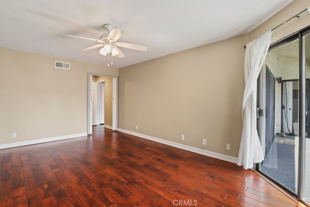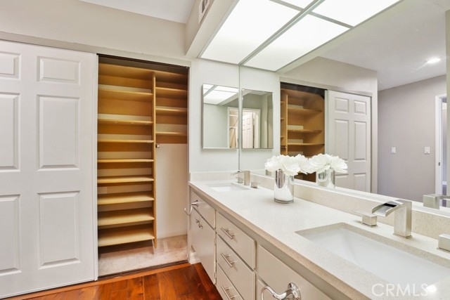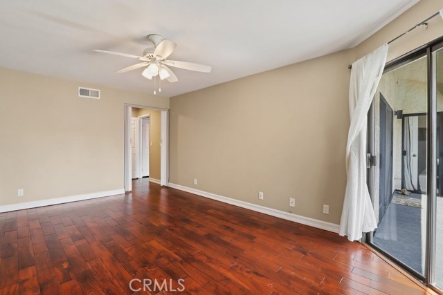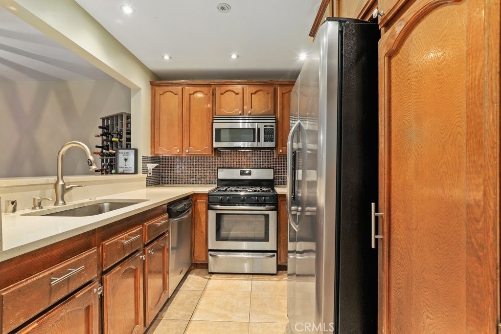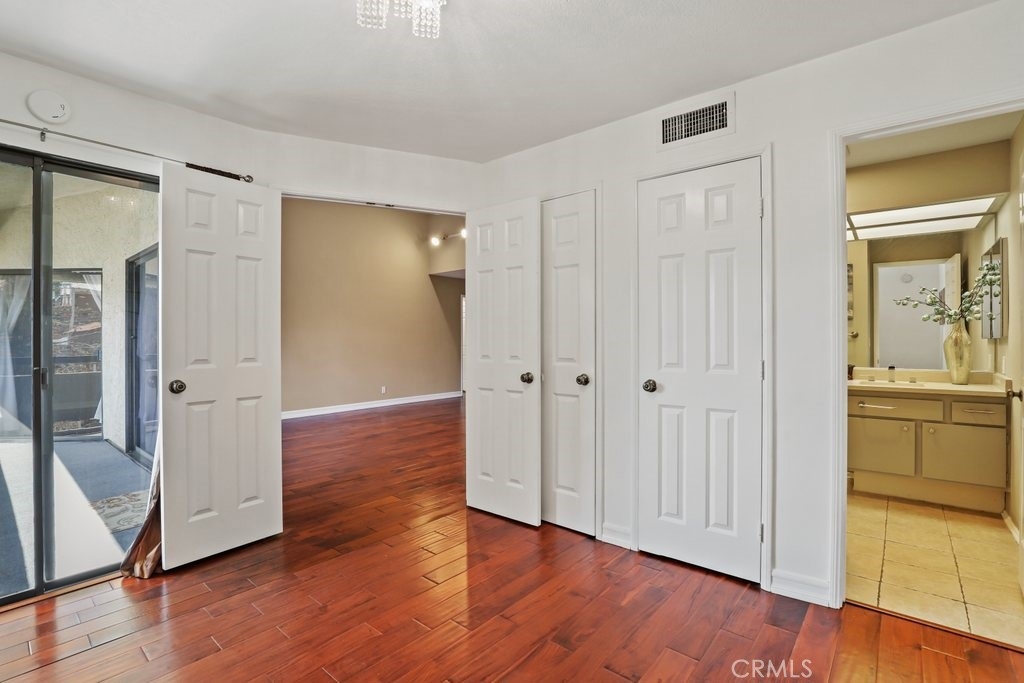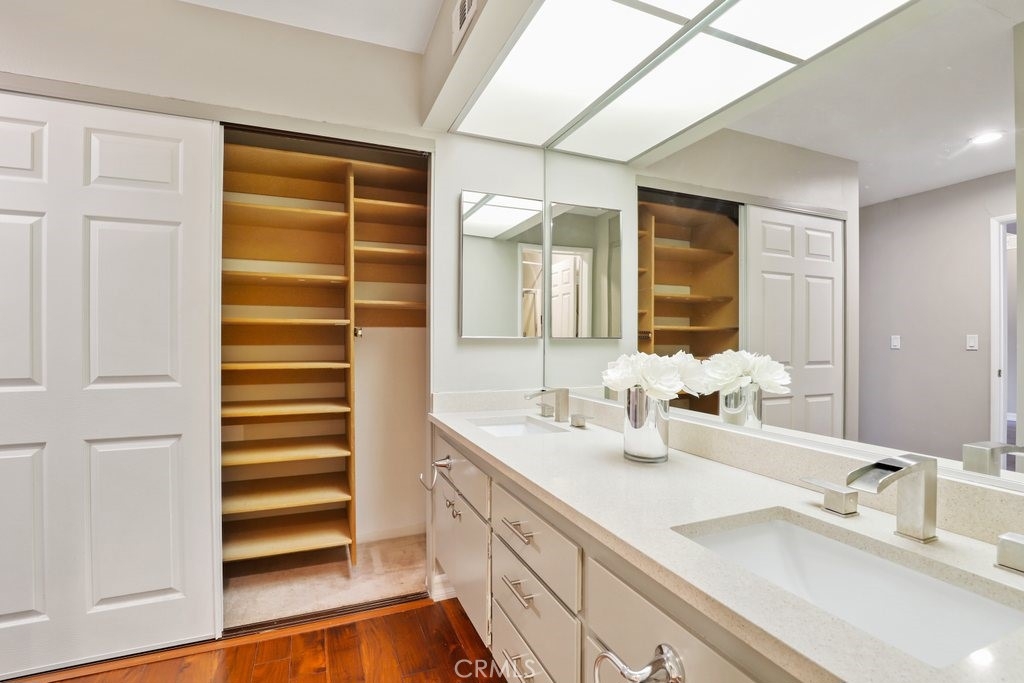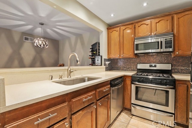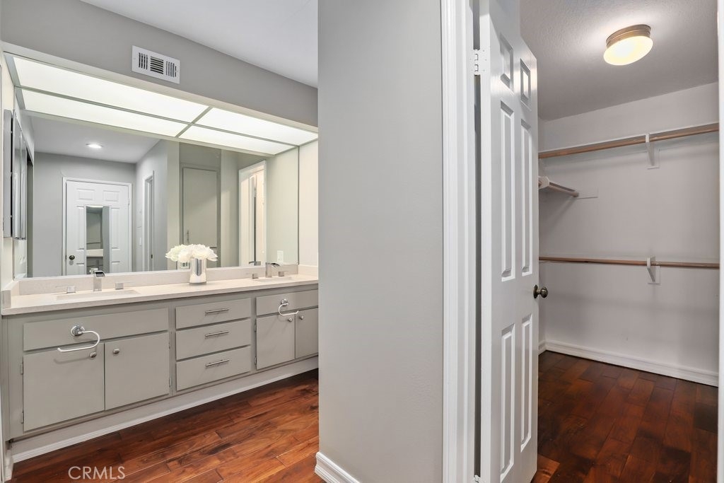 Upgraded top floor home! Come home to this beautifully cared for top floor home featuring vaulted ceilings, wood floors, upgraded kitchen and bathrooms, and brand new HVAC. Cooking in the spacious kitchen is a joy with new quartz counters, stainless steel appliances, and a large pantry. Rest in the spacious primary bedroom with a large walk-in closet and double-sink bathroom. Relax on the covered balcony which provides a peaceful greenbelt view with extra room for a BBQ. This gated community amendments include a heated pool, sauna, jacuzzi, gym, and large clubhouse, as well as plenty of guest parking. The unit itself comes with two reserved easy access garage parking spaces and additional storage space. HOA fees cover earthquake insurance, walls-in insurance, water, trash, and daily security patrol. This is a prime location close to shopping, restaurants, public transportation and entertainment!