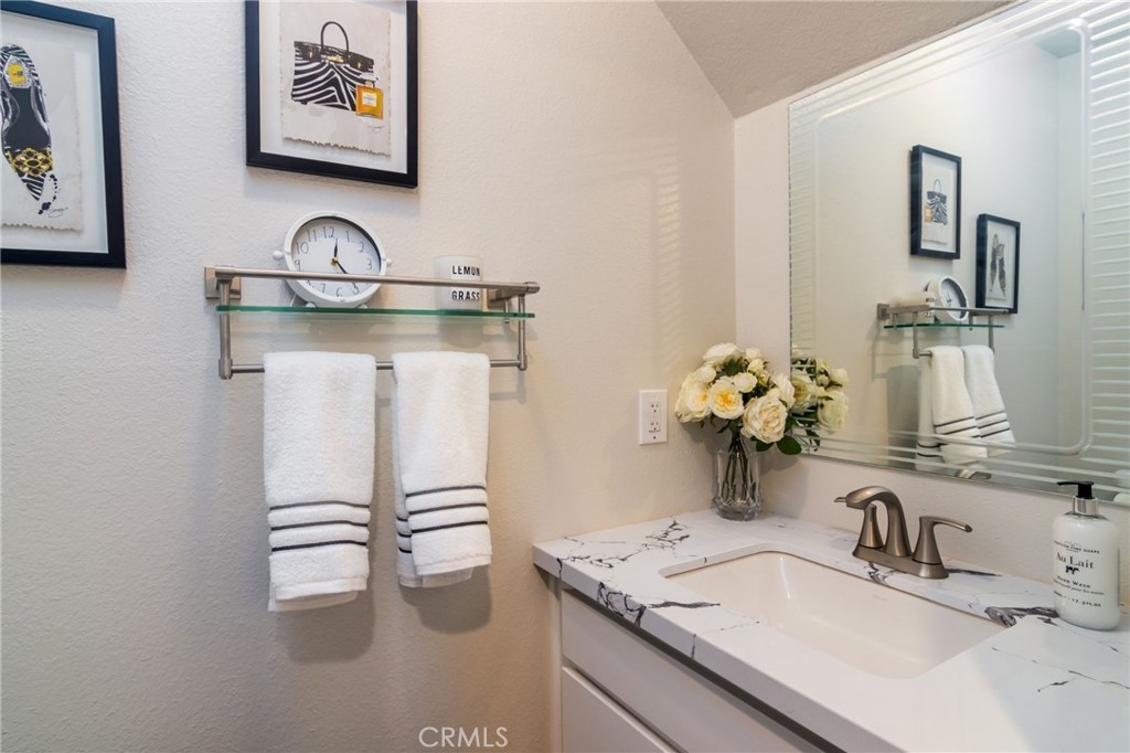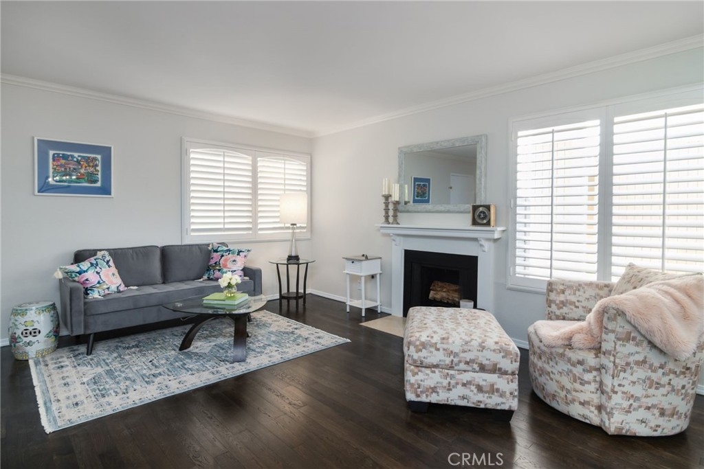 Stunning unit tucked in a quiet location toward the back of the Woodland Village Townhomes, redone and sharp. Enter into the bright living room with rich solid oak floors, gas fireplace, crown molding and dining area with sliding glass doors and plantation shutters that lead to large private yard/patio area and two car garage with direct access to patio. Remodeled kitchen with white shaker cabinets, sleek black handles and quartz counters. Indoor laundry area adjacent to kitchen. Downstairs powder bath updated with quartz counters and new fixtures. Upstairs you will find brand new carpet and two generous sized rooms. The bathroom has been completely remodeled with subway tile in the shower/tub combo, vanity boasts new quartz counters. All windows throughout have plantation shutters, HVAC has been replaced within the last 2 years and water heather replaced approximately 4 ½ years ago. Close proximity to the pool for convenience. HOA dues are $440 per month. Adjacent access to the 101 freeway, The Village shops and restaurants, Topanga Mall and trendy Ventura Blvd.