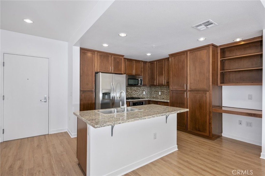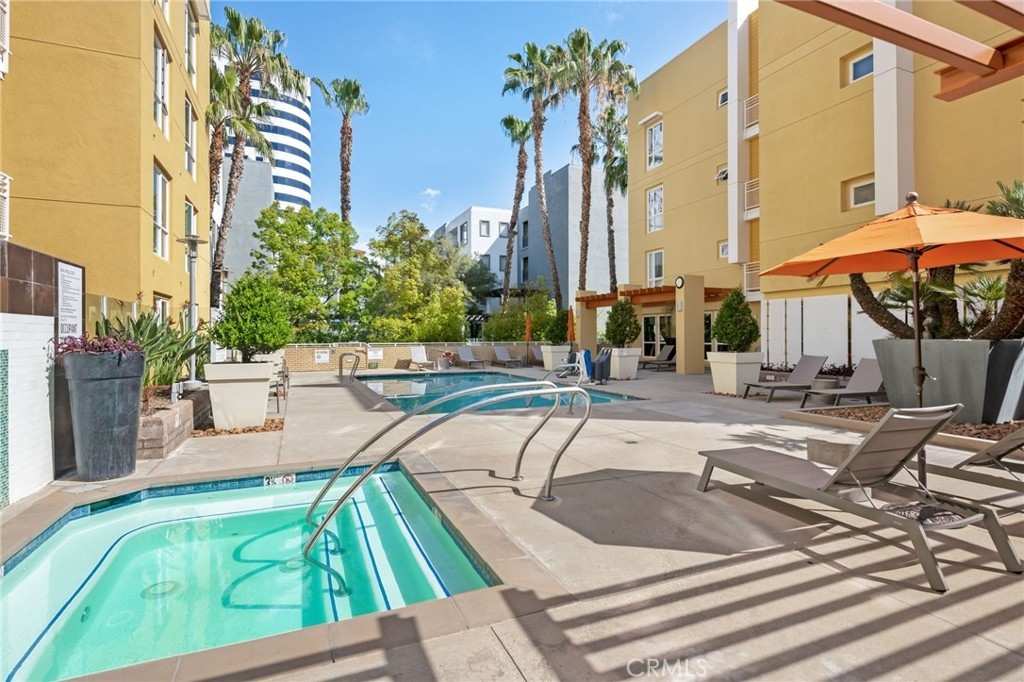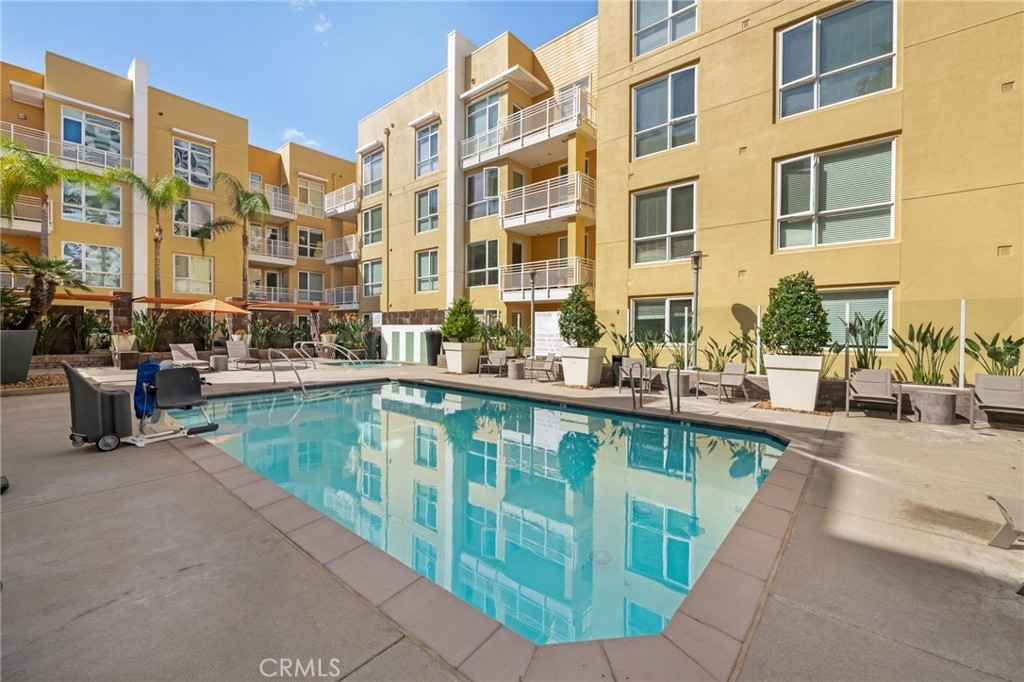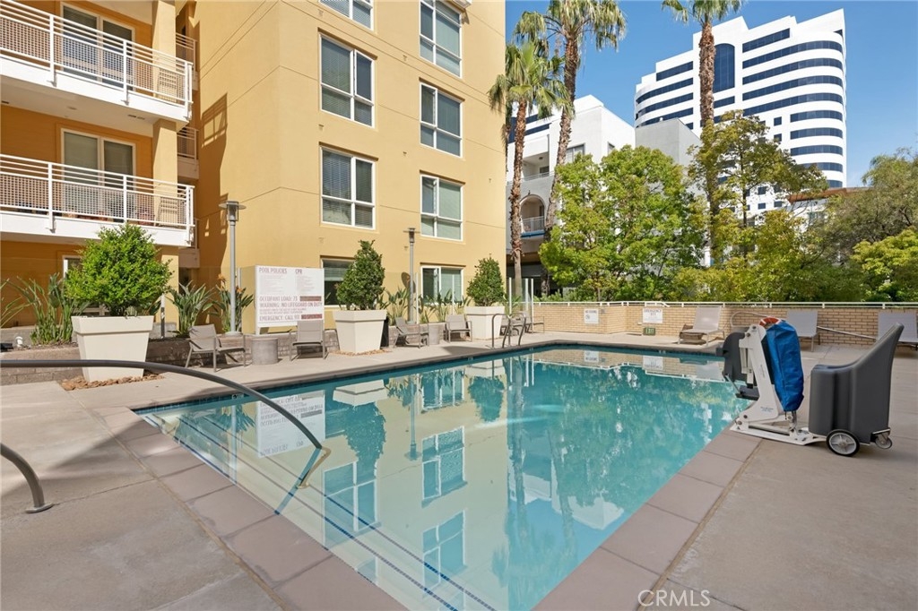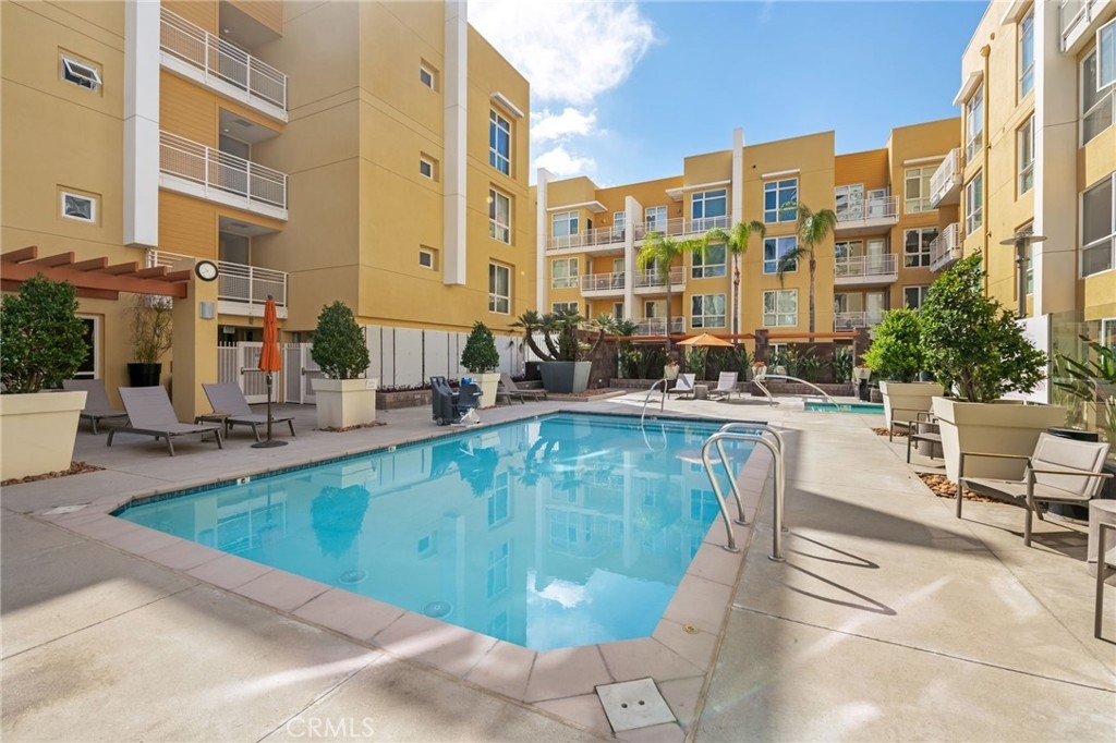 Experience unparalleled convenience at Ascent Warner Center in Woodland Hills, with walkable access to shops and restaurants. This well-appointed condo offers a lifestyle enriched by HOA amenities, including a pool, fitness center, and clubhouse, all secured by 24-hour surveillance. Inside, enjoy new carpet, fresh paint, laminated flooring throughout the living room and kitchen, a chef's kitchen with granite countertop, and a primary suite with walk-in closet and double vanity. In-unit laundry, two assigned parking spaces (#82 & #135), ample guest parking, secure mailboxes, and package lockers complete this desirable residence.