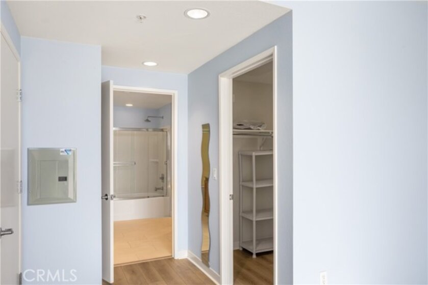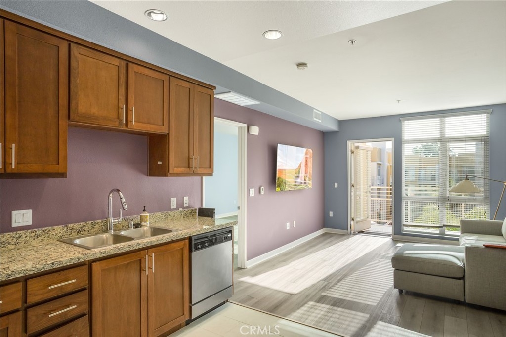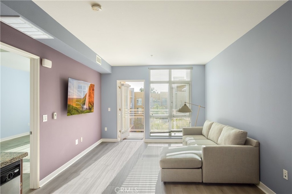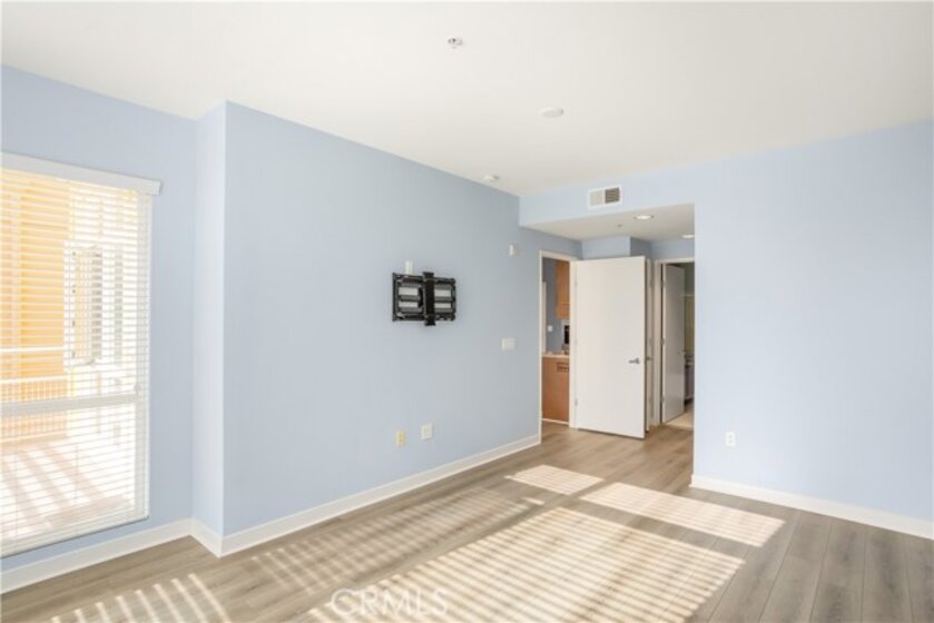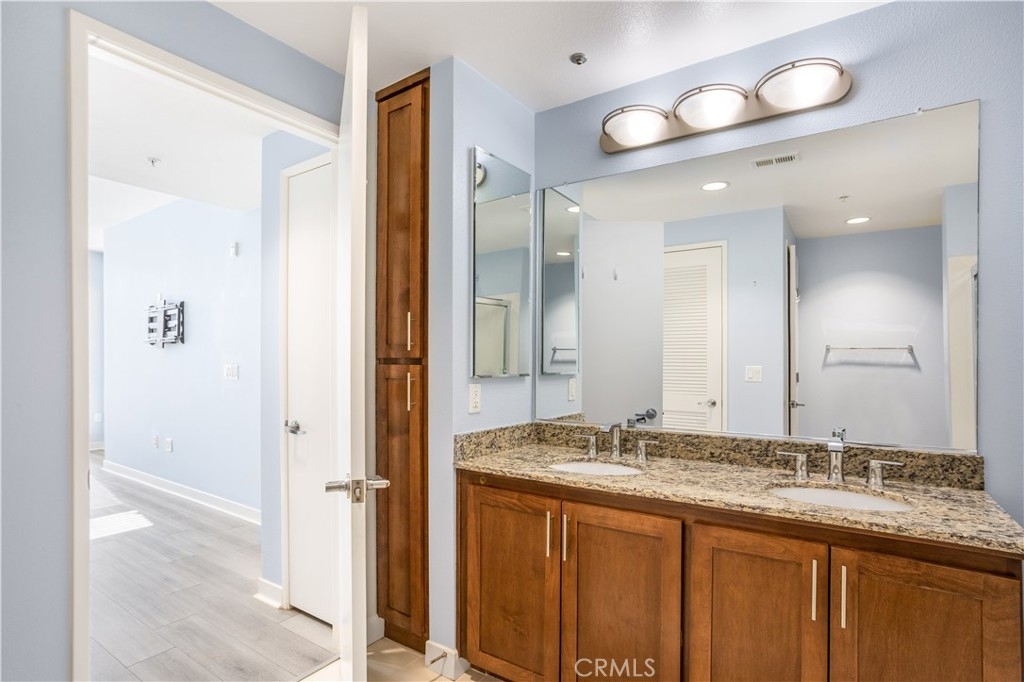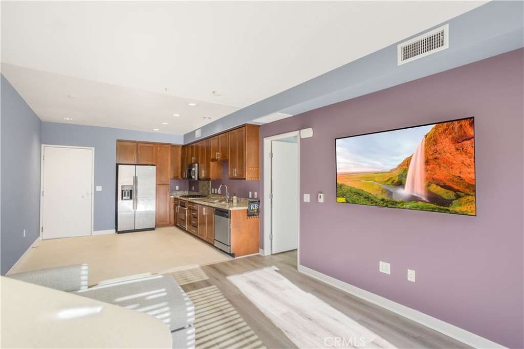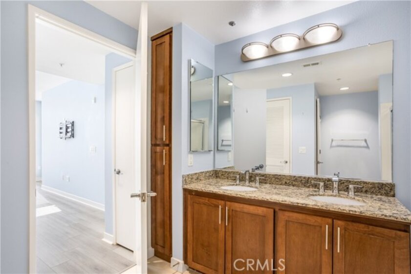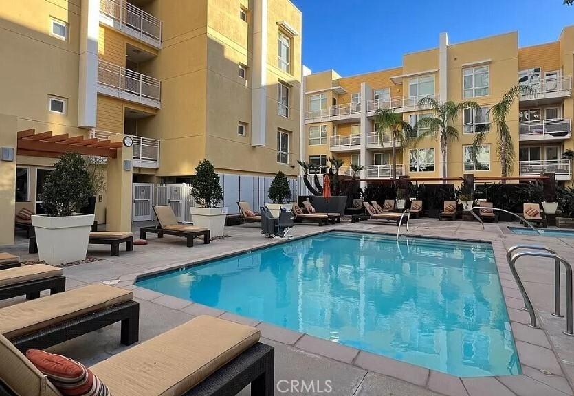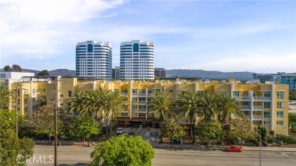 Welcome to Ascent at Warner Center, a modern full-service luxury community built in 2010 in the heart of Woodland Hills. This rare top-floor corner 1-bedroom condo offers approximately 740 sq ft—the largest 1-bedroom floor plan in the building—with no neighbors above and only one shared wall for added privacy and quiet. Enjoy a private balcony overlooking the pool courtyard and greenbelt, a premium view compared to units facing other buildings or parking structures. The open-concept layout is filled with natural light and features a spacious living area and a well-appointed kitchen with stainless steel appliances, maple cabinetry, and granite countertops. The generously sized bedroom includes a walk-in closet and an en-suite bathroom with double vanities and granite counters. Additional highlights include in-unit washer and dryer, central heat and air, recessed lighting, and ample storage. Recent upgrades include brand-new flooring throughout, updated plumbing with a new toilet, refreshed lighting, and a clean in-wall TV power setup. This unit also includes two side-by-side parking spaces (not tandem) conveniently located near the elevator, along with a large private storage unit in a secure room. Residents enjoy resort-style amenities including a pool, spa, cabanas, fitness center, clubhouse, game room, outdoor lounges, BBQ areas, fire pits, dog park, EV charging stations, guest parking, and multiple elevators. Ideally located just moments from The Village, Westfield Topanga, Warner Center Park, dining, entertainment, and major freeways.