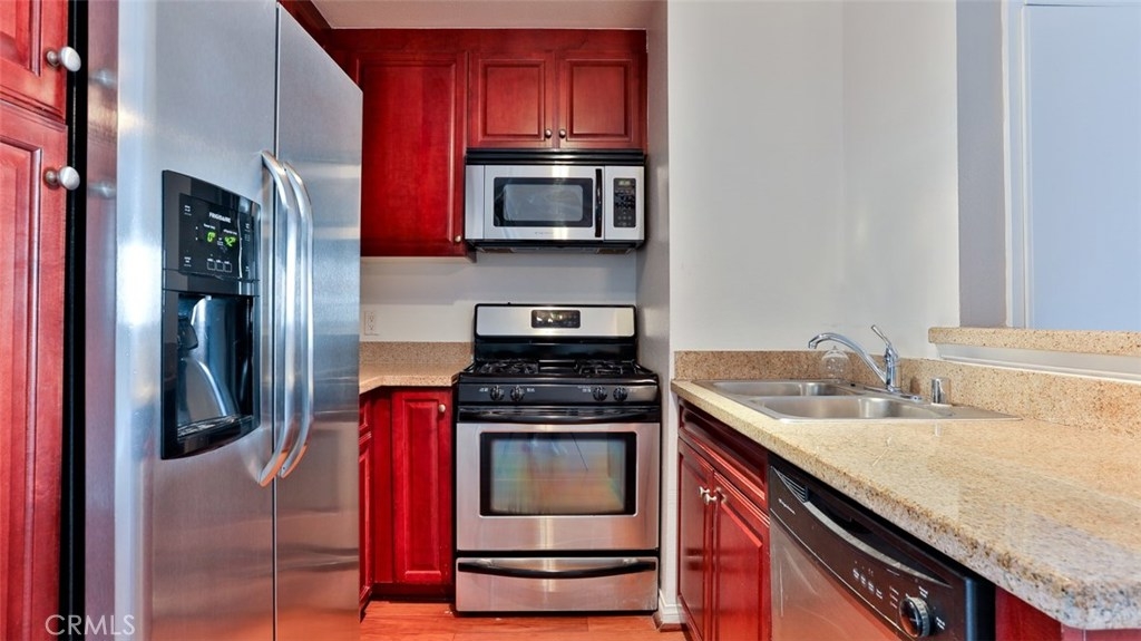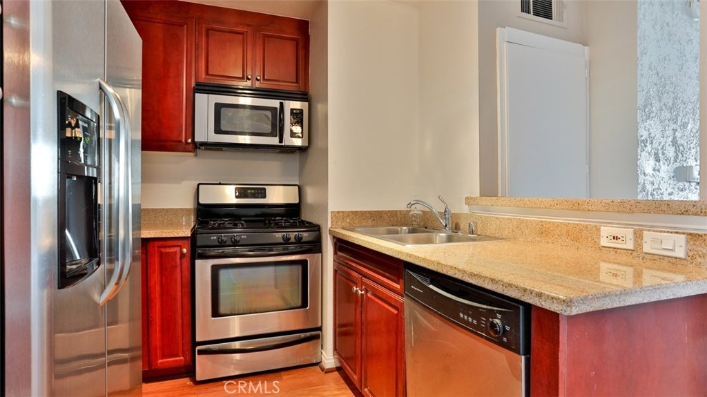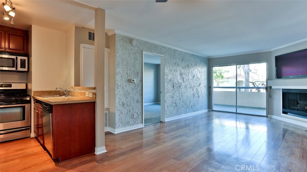 Corner unit 1 bedroom 1 bath + den, condo with large balcony and only 1 shared wall. BRAND NEW HVAC system installed July 2020. Enjoy all the benefits of living at the MET, gym with sauna, pools, hot tubs, tennis and racquetball courts . Balcony view looks out onto Juliana Pl. Laminate floors, new carpet, new paint, and crown molding throughout. 2 side by side, uncovered assigned parking spaces. 56" Samsung TV and wall mount included. Walking distance to Warner Center Park, minutes to Warner center and the Village.