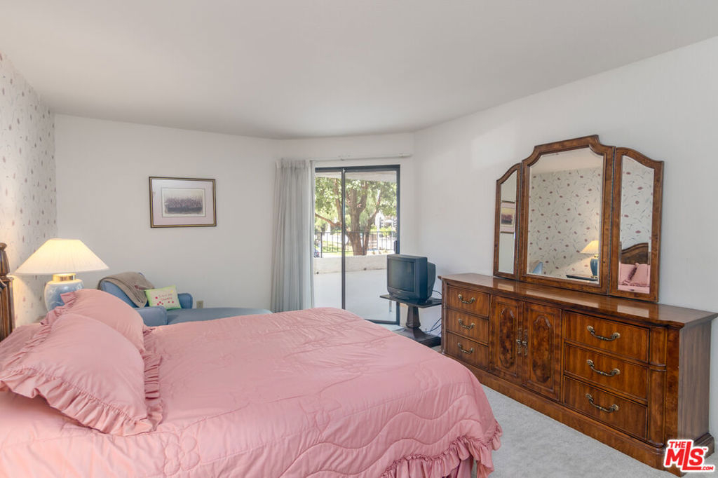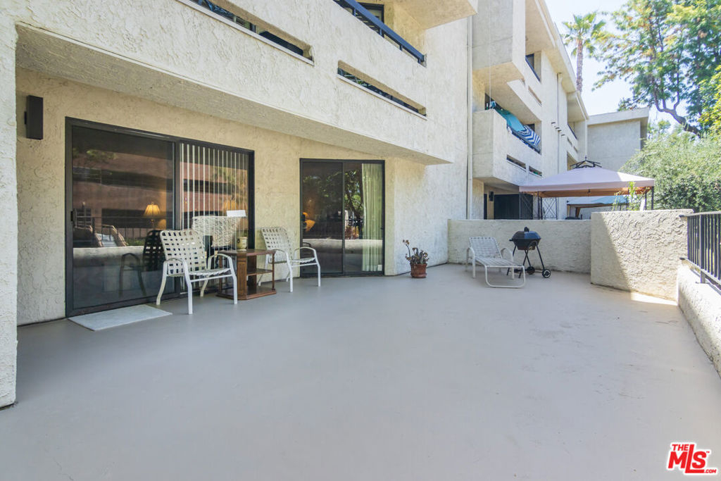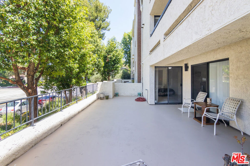 BOM! Outdoor entertaining at its finest! Move-in ready one-level condo with two bedrooms, two bathrooms and the biggest private patio ever (bigger than most backyards) at the popular Woodland Oaks complex! Complex also sports a fabulous POOL!!! Spacious living room features a brick fireplace and a full wall of glass doors offering access to the patio which spans the entire unit facing Owensmouth. Newer kitchen features maple cabinetry, blt-in desk and full-size laundry behind louver doors. Elegant Formal Dine has room for a hutch, with openable passing window to the kitchen. Spacious master/primary bedroom features a huge walk-in closet + another closet with mirrored doors, double vanity/dressing area, private bathroom, and additional patio access. Generously sized secondary bedroom also has glass doors to the patio. Two (2) assigned tandem parking spots (includes a storage locker in garage) plus lots of guest parking. Great location close to Westfield Topanga, The Village, and easy freeway access. Complex offers private grounds with a pool, jacuzzi, gym, and clubhouse, making this an ideal place to live! HOA includes water, trash and EQ insurance and a brand-new roof. This unit faces Owensmouth (a quiet cul-de-sac) and not Burbank. PRICED FOR MULTIPLE OFFERS - RUN DON'T WALK!