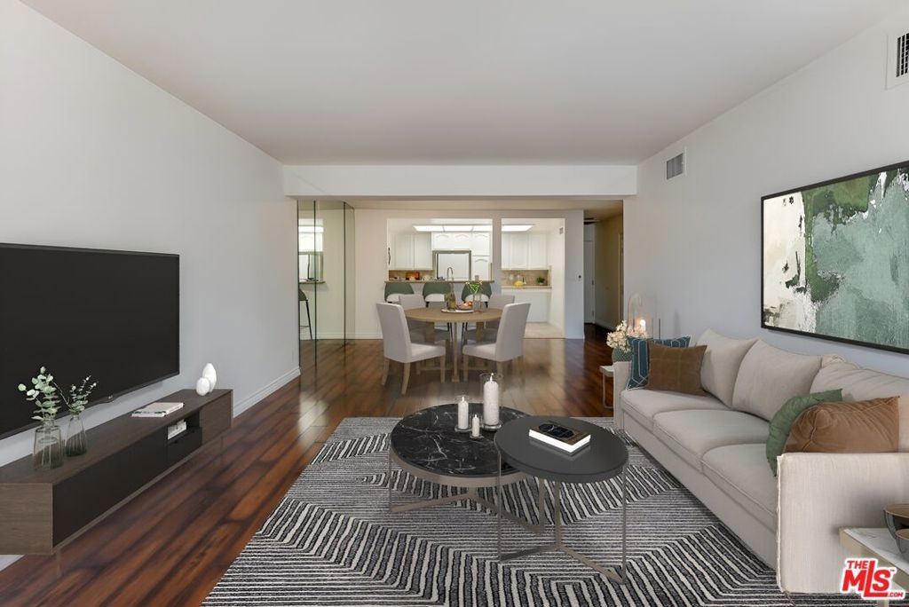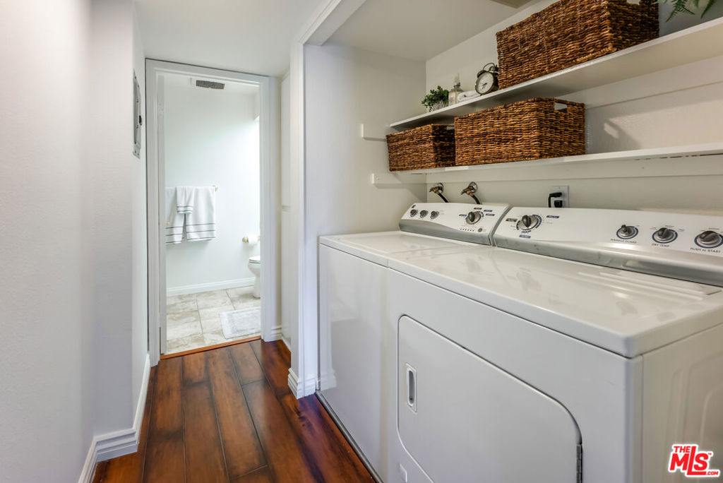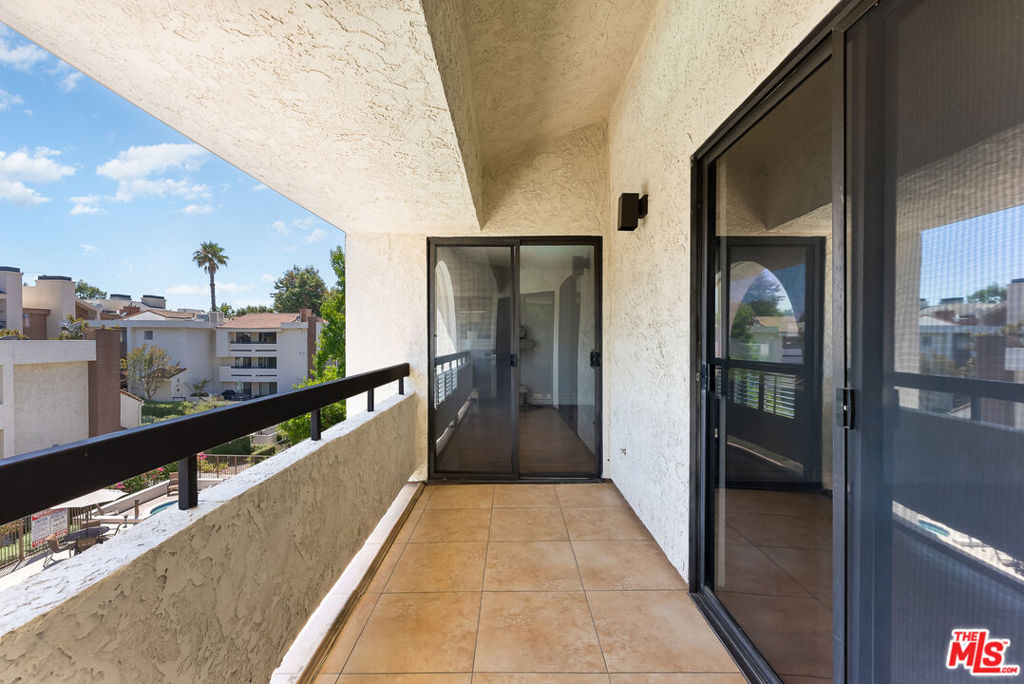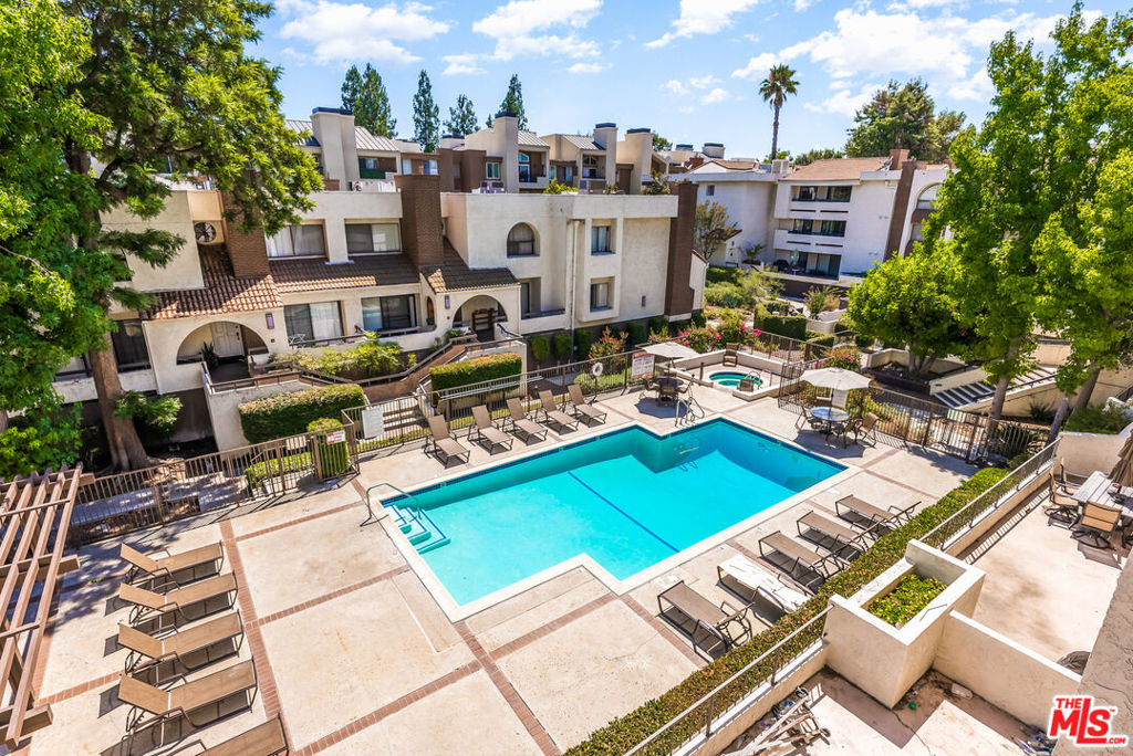 Top floor 2-bedroom, 2-bathroom, single-level condo in the desirable Woodland Oaks complex. This interior unit is in one of the best locations in the building, situated above the pool and courtyard. Immaculate and bright, it features engineered hardwood floors, smooth ceilings, an expansive balcony, gas fireplace, and kitchen with breakfast bar that opens to a dining area. Generously sized primary bedroom features fresh carpet, a dual vanity, separate bathroom with shower and a large walk-in closet. Secondary bedroom boasts vaulted ceilings and hardwood floors. The full-sized washer and dryer are located in their own closet and are included. The well-maintained complex, close to Westfield Topanga, The Village and with easy freeway access, offers private grounds with a pool, jacuzzi, gym, and rec room, making this an ideal place to live! Unit comes with two tandem parking spots, an additional storage locker and plenty of guest parking. HOA includes water, trash, and EQ insurance.