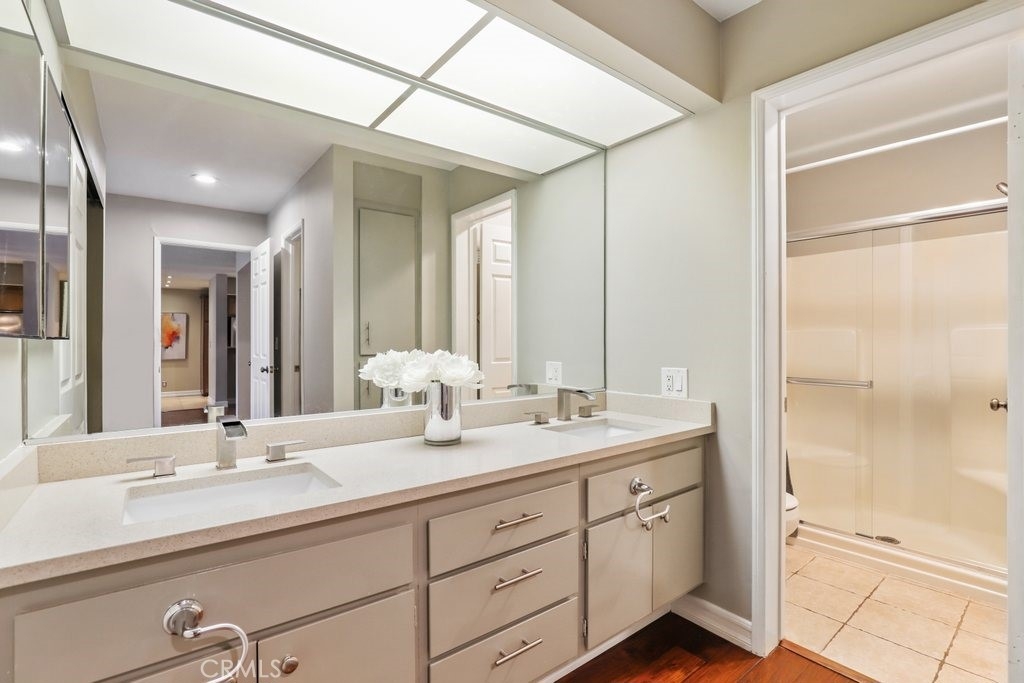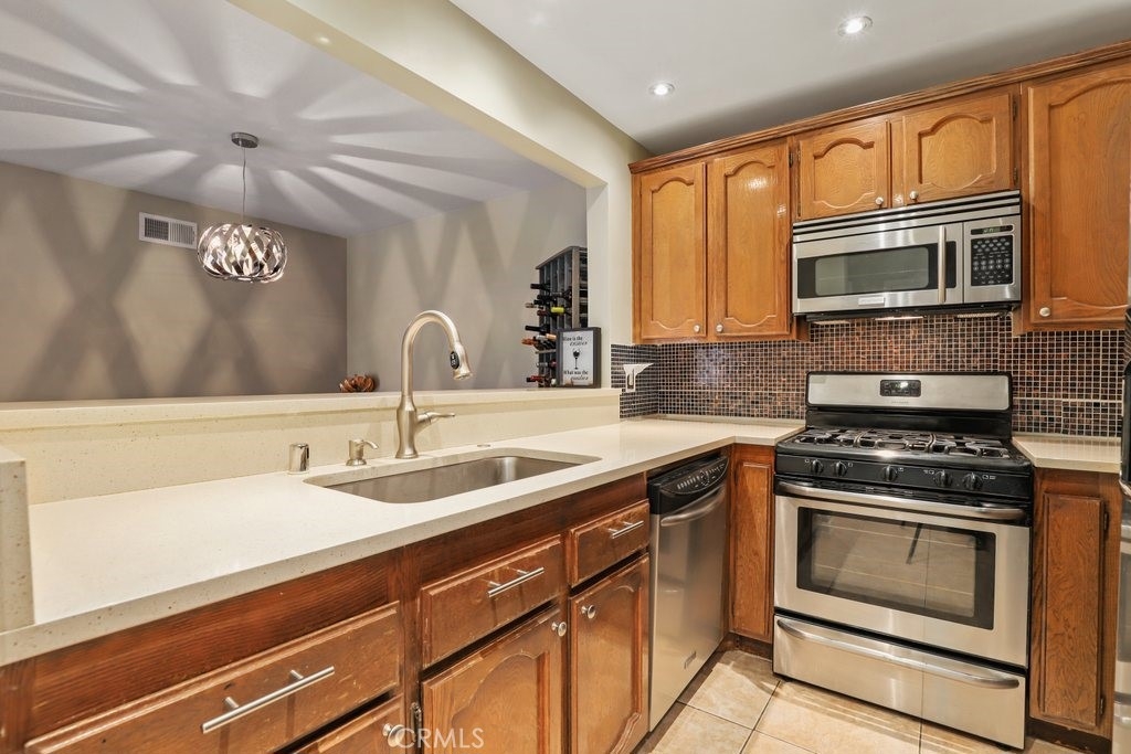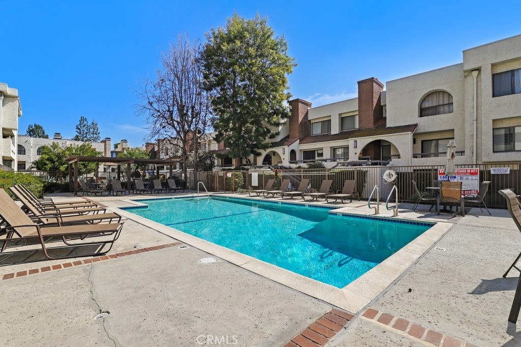 Upgraded top floor home! Come home to this beautifully cared for top floor home featuring vaulted ceilings, wood floors, upgraded kitchen and bathrooms, and brand new HVAC. Cooking in the spacious kitchen is a joy with new quartz counters, stainless steel appliances, and a large pantry. Rest in the spacious primary bedroom with a large walk-in closet and double-sink bathroom. Relax on the covered balcony which provides a peaceful greenbelt view with extra room for a BBQ. This gated community amendments include a heated pool, sauna, jacuzzi, gym, and large clubhouse, as well as plenty of guest parking. The unit itself comes with two reserved easy access garage parking spaces and additional storage space. HOA fees cover earthquake insurance, walls-in insurance, water, trash, and daily security patrol. This is a prime location close to shopping, restaurants, public transportation and entertainment!