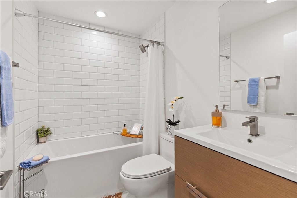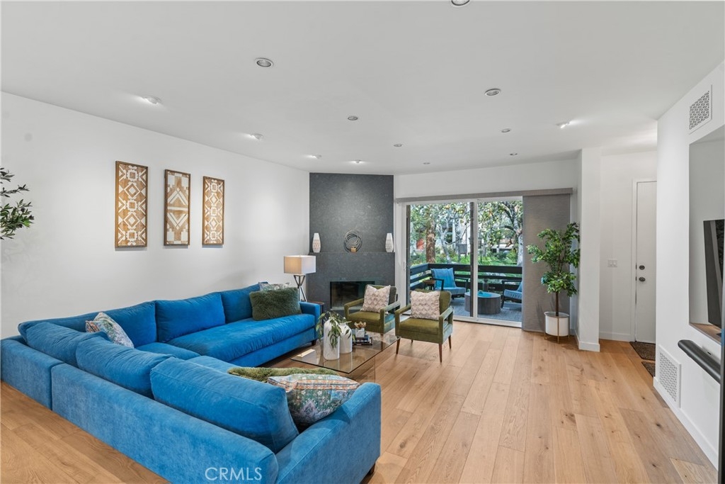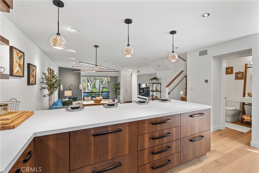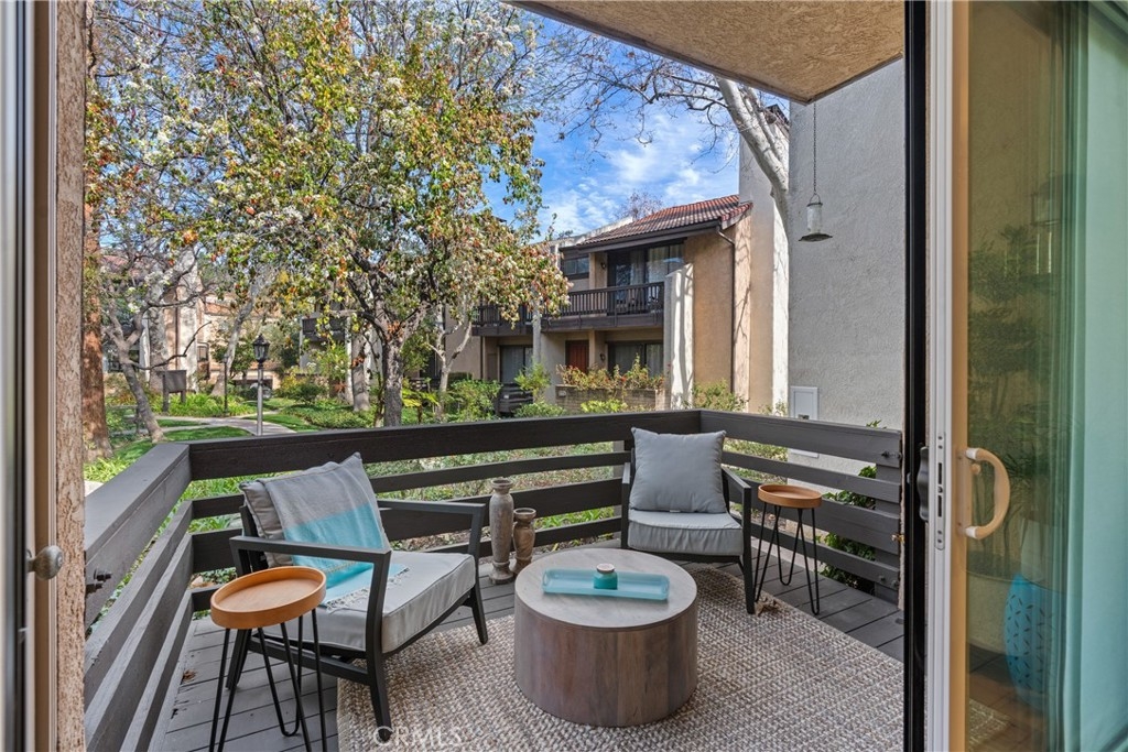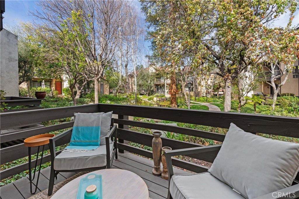 LUXURY NEW YORK LOFT EXPERIENCE IN THE HEART OF WARNER CENTER Discover a rare blend of sophisticated design and top-tier finishes in this meticulously remodeled, one of a kind townhome. Open-concept kitchen enhances the living space, combining elegance with comfort. Wide-plank Renew engineered wood floors, skim-coated walls and top level recessed lighting throughout the home. Chef-inspired Kitchen appointed with Custom Walnut Omega cabinetry, expansive CaesarStone counter for prep and seating. GE Monogram refrigerator and Bosch dishwasher are paneled and counter depth. Zephyr retractable stove fan, and large capacity sink with touch-activated faucet. Dining area steps down to living room which features elegant CaesarStone fireplace. Large sliding glass door opens to private deck, overlooking lush landscaping replete with trees, meandering streams and bridges. Primary bedroom serves as tranquil retreat, with soaring ceiling, generous closet space, and direct access to private balcony. Spa-inspired primary bathroom features large stone mosaic-tiled shower, James Martin vanity and Robern mirror with integrated lighting. Spacious second bedroom can easily be converted to 2 bedrooms. Hall bath with high end fixtures and opulent Hydro Systems tub. Exercise/play room features Omega laundry cabinet system. Clean, spacious 2 car garage equipped with 220v outlet for EV charging. Quiet and secluded townhome community offers resort-level amenities, including three swimming pools with spas, a tennis court, racquetball court, and sauna. Warner Center park is adjacent for play, walking and summer evening concerts. Minutes from Topanga Village, Ventura Blvd. and convenient freeway access. Effortless access to outstanding dining, shopping, and entertainment. Furnishings may be purchased outside of escrow.