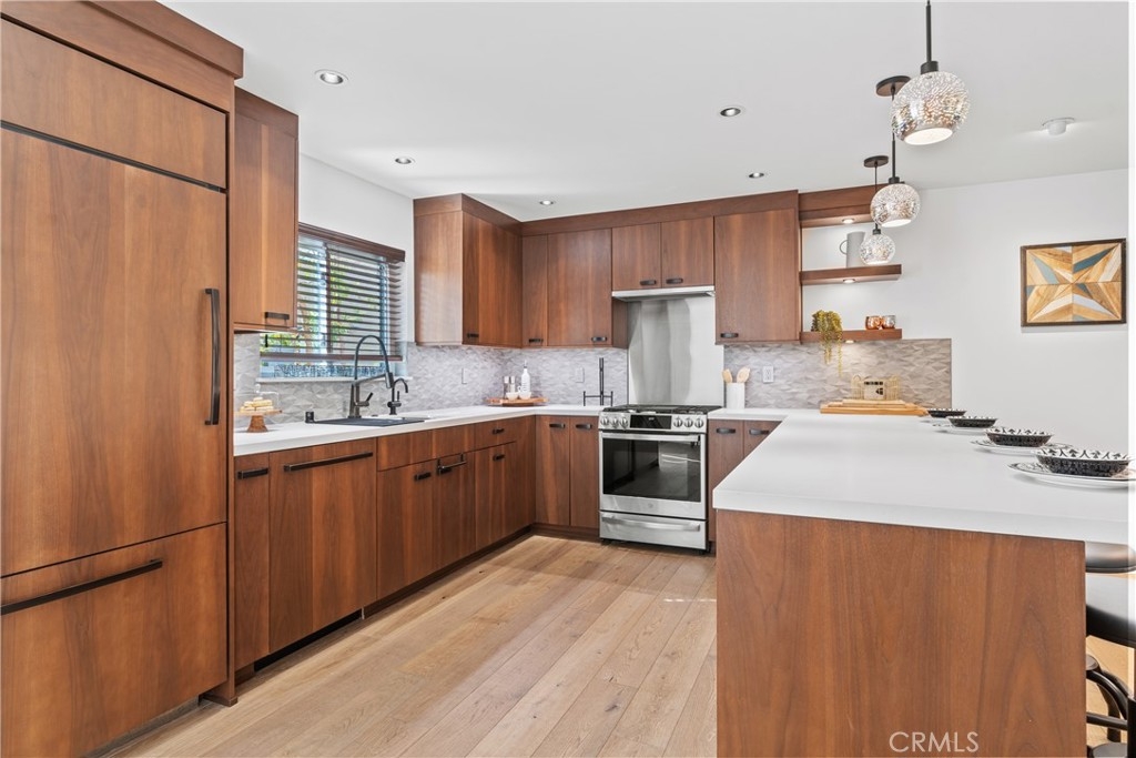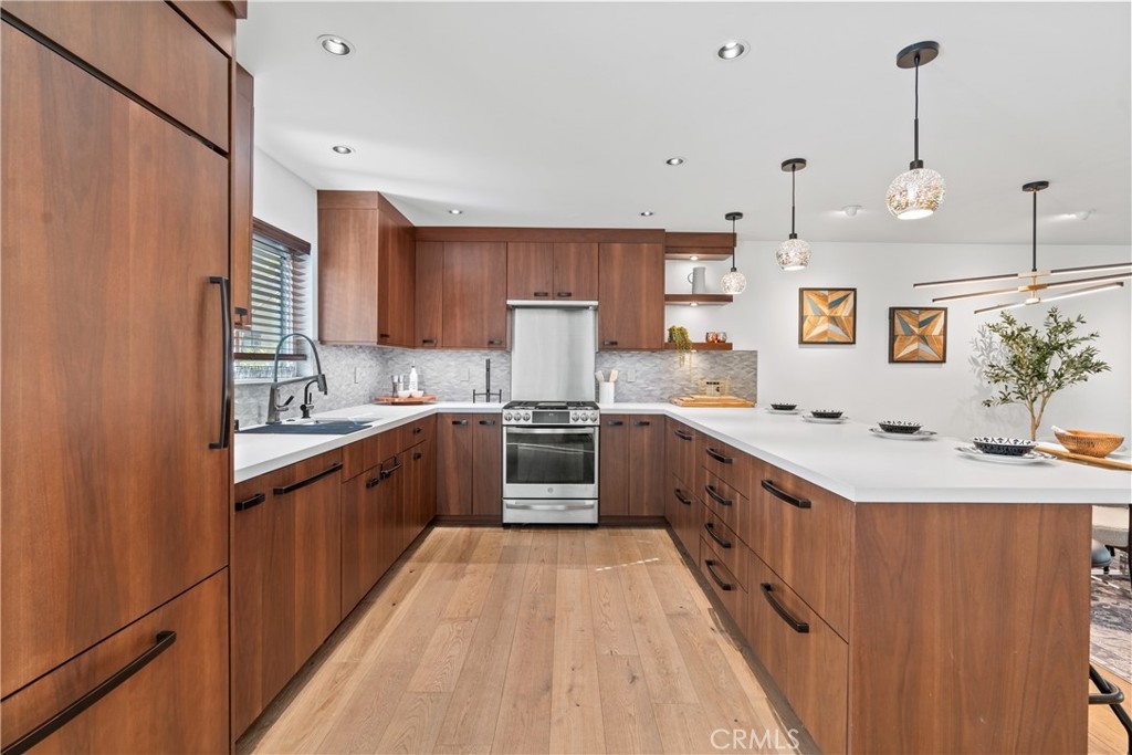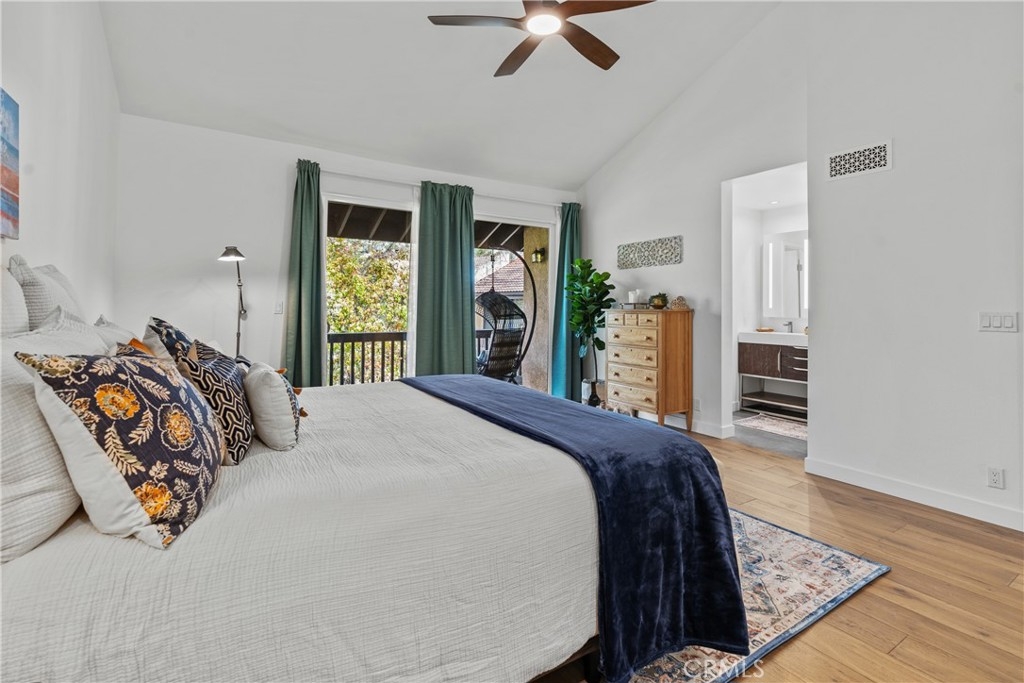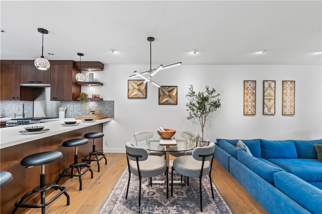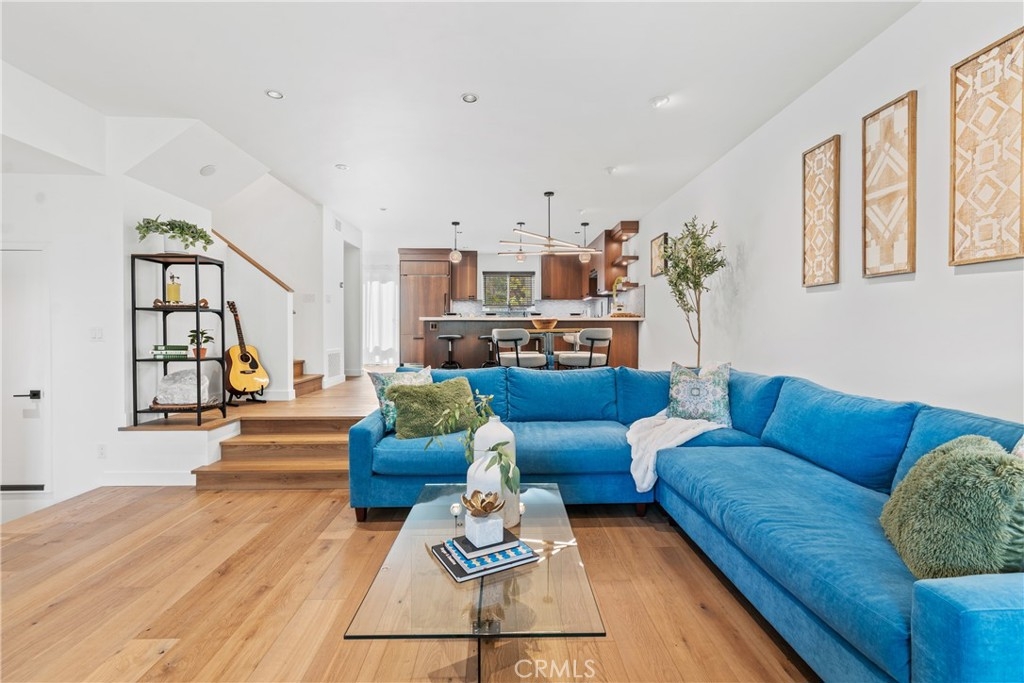 LUXURY NEW YORK LOFT EXPERIENCE IN THE HEART OF WARNER CENTER Discover a rare blend of sophisticated design and top-tier finishes in this meticulously remodeled, one of a kind townhome. Open-concept kitchen enhances the living space, combining elegance with comfort. Wide-plank Renew engineered wood floors, skim-coated walls and top level recessed lighting throughout the home. Chef-inspired Kitchen appointed with Custom Walnut Omega cabinetry, expansive CaesarStone counter for prep and seating. GE Monogram refrigerator and Bosch dishwasher are paneled and counter depth. Zephyr retractable stove fan, and large capacity sink with touch-activated faucet. Dining area steps down to living room which features elegant CaesarStone fireplace. Large sliding glass door opens to private deck, overlooking lush landscaping replete with trees, meandering streams and bridges. Primary bedroom serves as tranquil retreat, with soaring ceiling, generous closet space, and direct access to private balcony. Spa-inspired primary bathroom features large stone mosaic-tiled shower, James Martin vanity and Robern mirror with integrated lighting. Spacious second bedroom can easily be converted to 2 bedrooms. Hall bath with high end fixtures and opulent Hydro Systems tub. Exercise/play room features Omega laundry cabinet system. Clean, spacious 2 car garage equipped with 220v outlet for EV charging. Quiet and secluded townhome community offers resort-level amenities, including three swimming pools with spas, a tennis court, racquetball court, and sauna. Warner Center park is adjacent for play, walking and summer evening concerts. Minutes from Topanga Village, Ventura Blvd. and convenient freeway access. Effortless access to outstanding dining, shopping, and entertainment. Furnishings may be purchased outside of escrow.