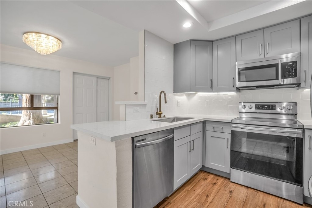 Opportunity knocking! Here is your chance to own a 2-bedroom, 2-bath condo in the heart of Woodland Hills for under $500K. Take advantage of the opportunity BEFORE the RAMS Stadium is constructed and price go way up! This first-floor corner unit is available in the sought-after Woodland Hills neighborhood. The condo, which shares only one wall with neighbors, serves as a fantastic starter home and has been well-loved and maintained by the current owner for the past 9 years. The kitchen was updated two years ago, featuring stainless steel appliances, and the unit boasts a new AC unit (2 years old) and updated flooring in most areas. Enjoy the spacious wrap-around balcony with light fixtures, a rare feature in the building. The primary bedroom is generously sized, complete with a walk-in closet and an attached private bath/shower. The second bedroom is also sizable and includes two closets. Additional highlights of the condo include beautiful plantation shutters, recessed lighting, and other charming touches that must be seen to be appreciated. The unit is conveniently located close to its two side-by-side parking spaces, the guest parking lot, as well as amenities like laundry facilities and trash disposal. The gated complex offers resort-style living with a pool surrounded by beautiful brickwork and lush landscaping. Residents can also take advantage of a spacious recreation room, a gym, an additional private jacuzzi, and a tennis court. Security is provided on-site, and the community features both gated access and gated parking for residents. The property is within walking distance of Warner Center, Westfield Topanga, Topanga Village outdoor mall, and Ventura Blvd restaurants and shopping. Live close to local events such as concerts in the park (also within walking distance) and fine dining. Experience the convenience of being centrally located to all that Woodland Hills has to offer, with easy access to Malibu beaches, the 101/405 freeways, hospitals, schools, hiking trails, and more. HOA fees cover gas, water, trash, and additional amenities!