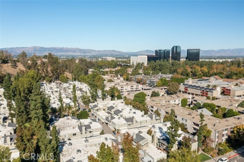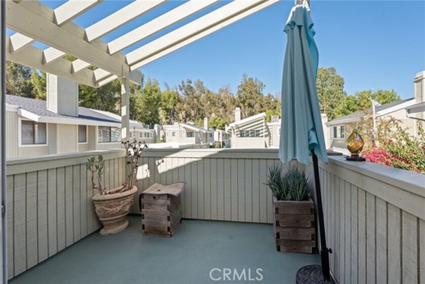 Rarely offered Woodland Village private end unit townhome with 2-car garage, in-unit laundry, and private balcony deck! The townhome is privately situated towards the back of the complex making it the ideal quiet location away from street noise. Enter the property though a quaint courtyard where there is also access to the 2-car garage with built-in storage. Step inside an entry foyer which leads upstairs where all the living spaces and bedrooms are conveniently located on the same level. An oversized light and bright living room has high vaulted ceiling, tiled fireplace, and wall-to-wall picture windows with plantation shutters found throughout. A separate spacious dining room has high vaulted ceiling, direct kitchen access, and a sliding glass door that opens to a large balcony deck with overhead trellis that overlooks the complex and provides a great space for outdoor dining and entertaining. The upgraded kitchen has granite counters, great built-in cabinets with pantry space, and a full suite of appliances including built-in range, microwave, dishwasher, and fridge/freezer. The two bedrooms are located down a private wing with large hallway storage cabinetry and convenient laundry area with side-by-side washer and dryer. The primary bedroom has large closet with custom built-ins and private en-suite upgraded bathroom with newer tiling, cast iron bathtub & shower with Berkey water filter. The second bedroom also has a good sized closet with custom built-ins and access to a hall bathroom which can also be used as a guest powder bath. Additional system upgrades include: newer American Standard air conditioning unit with Ecobee smart thermostat and newer Simonton dual pane windows installed throughout. The complex offers terrific amenities including two swimming pools & spas, two tennis courts, and guest parking. Adjacent to dining/shopping at Westfield Topanga Mall and Village including the vibrant Topanga Social, Calabasas Commons, Warner Center and Warner Park which hosts 4th of July fireworks and summer concerts, and a short drive over the canyon to the beaches and Malibu.