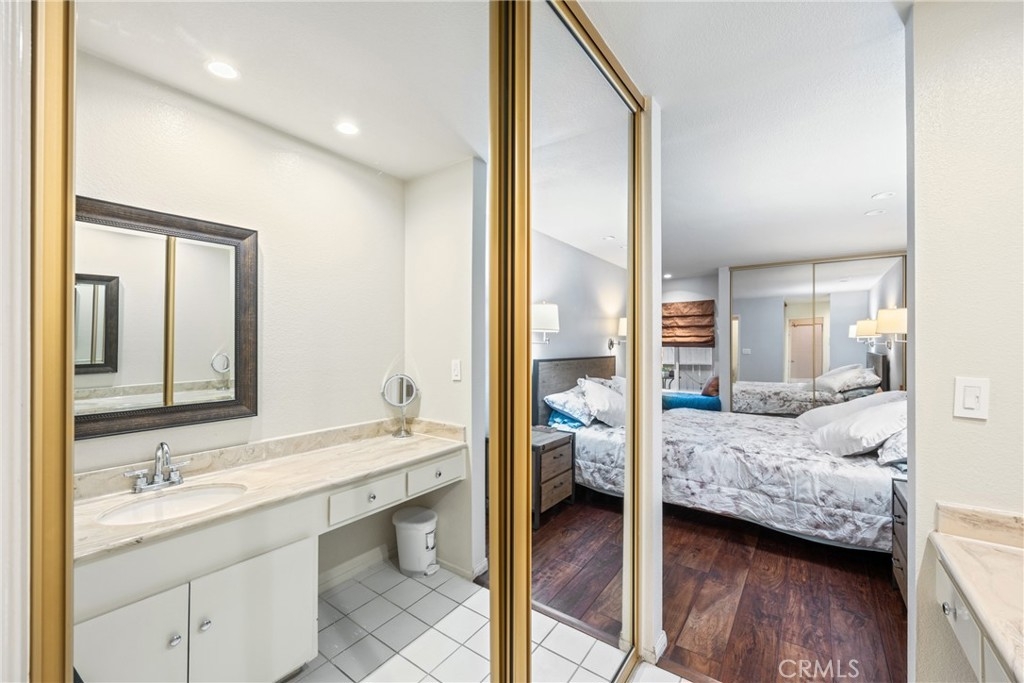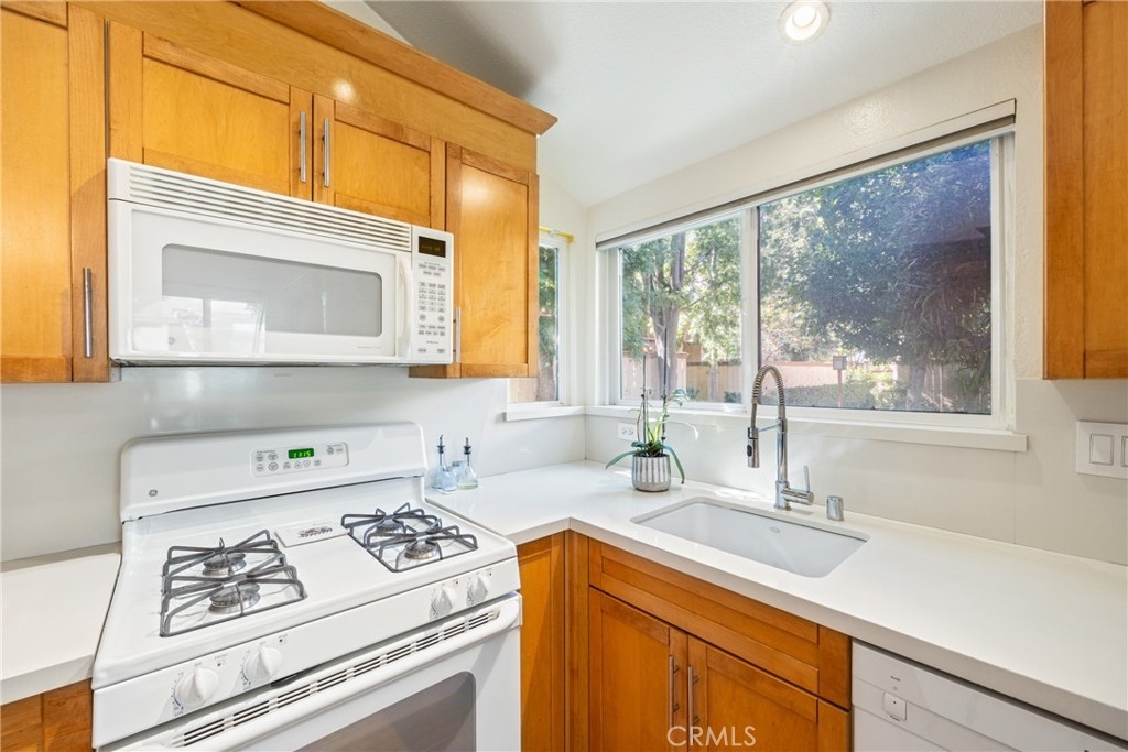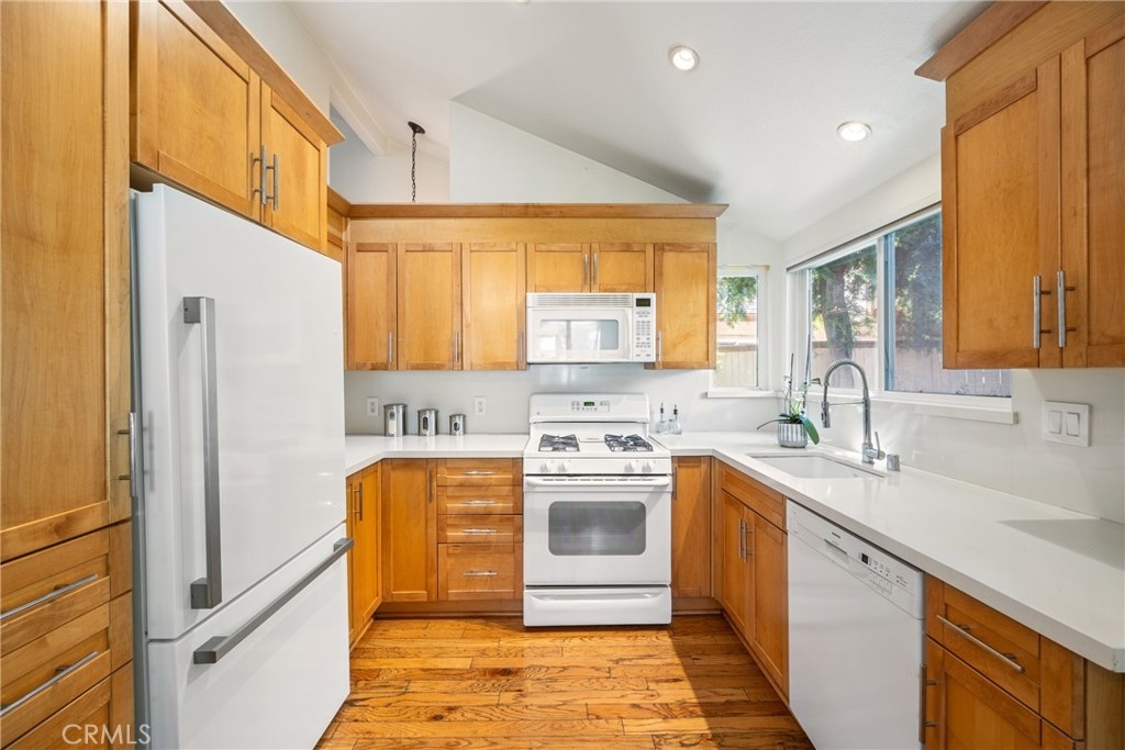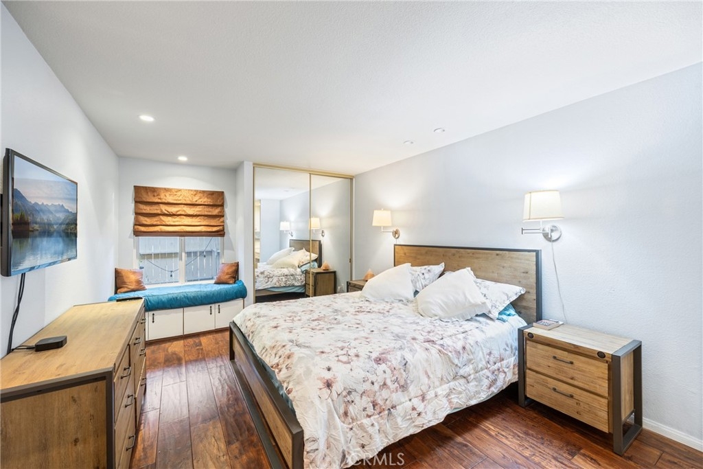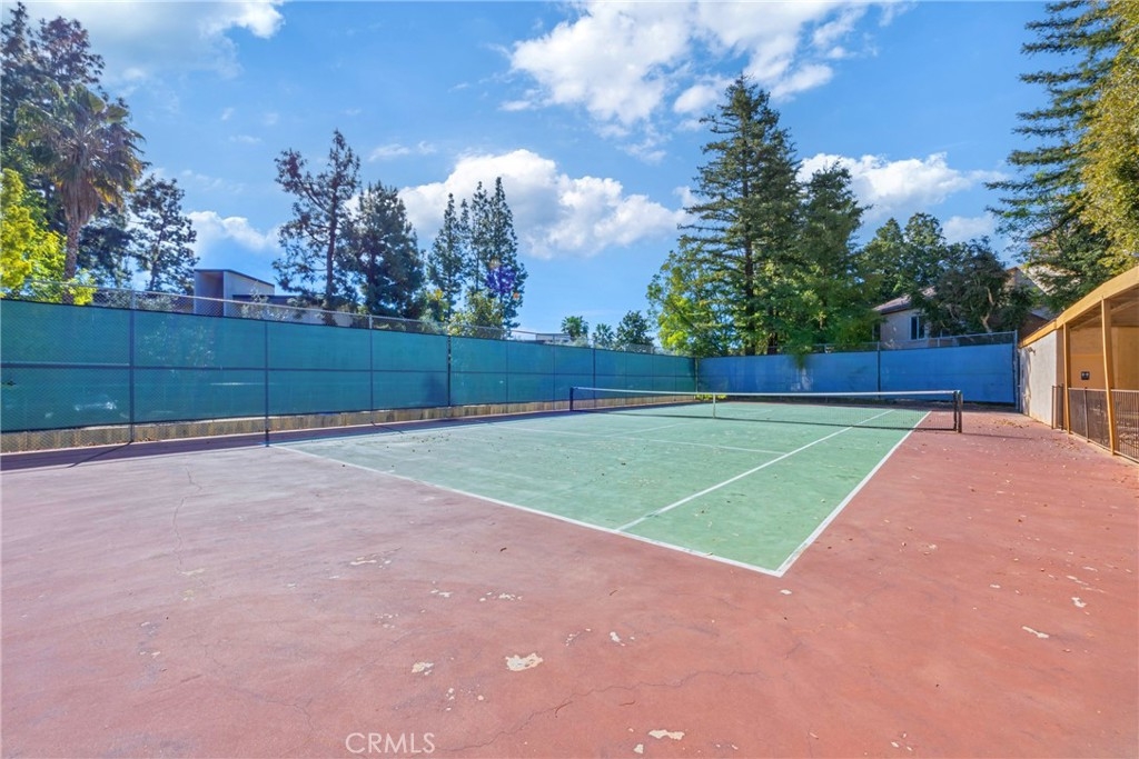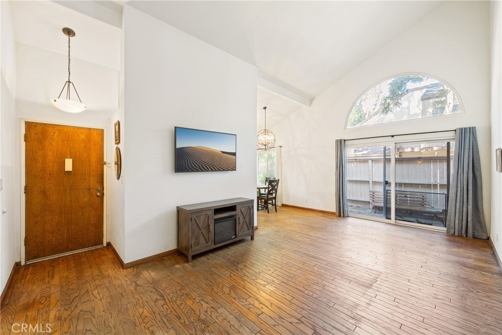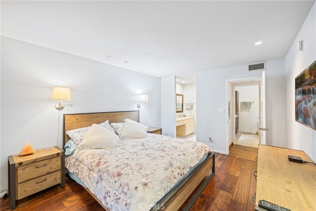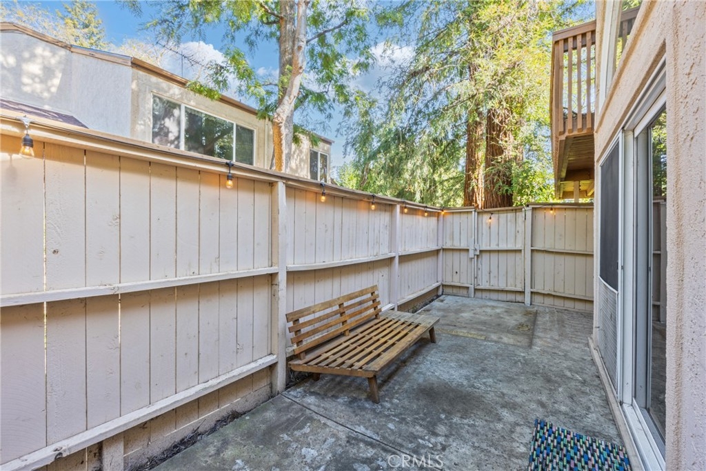 Tucked away in the heart of Sequoia Village, this beautifully updated lower-level two-bedroom condo offers a peaceful, park-like atmosphere. Inside you'll find a spacious living room with soaring vaulted ceilings. The remodeled kitchen features plenty of cabinet space, sleek countertops, a dishwasher, refrigerator, range with a microwave hood, recessed low-voltage lighting, and a convenient lazy Susan corner cabinet. The secondary bathroom is comfortably designed featuring travertine and stone tile flooring, a stylish stall shower with a frameless glass enclosure. High-end chrome bath fixtures, including a hand-held shower spray, add to the modern feel with hardwood floors throughout. The spacious primary bedroom includes two mirrored, lighted wardrobe closets, while the second bedroom, with its double-door entry, is versatile enough to be used as a home office or a den that opens to the main living area. Also included is a full-size washer and dryer, an upgraded electrical panel, newer heating and air conditioning, shaded private patio-perfect for relaxing. The unit also comes with two side-by-side covered parking spaces in a gated carport. Sequoia Village is a well-maintained community offering resort-style amenities, including a pool, gated security. The location is unbeatable—just a short walk to Topanga Plaza, The Village, and the brand-new Rams Training Camp. With easy access to the 101 Freeway and some of the best schools in the Valley, this is an opportunity you don’t want to miss!