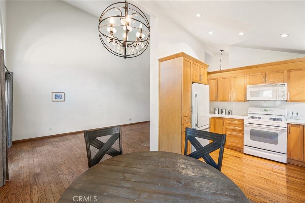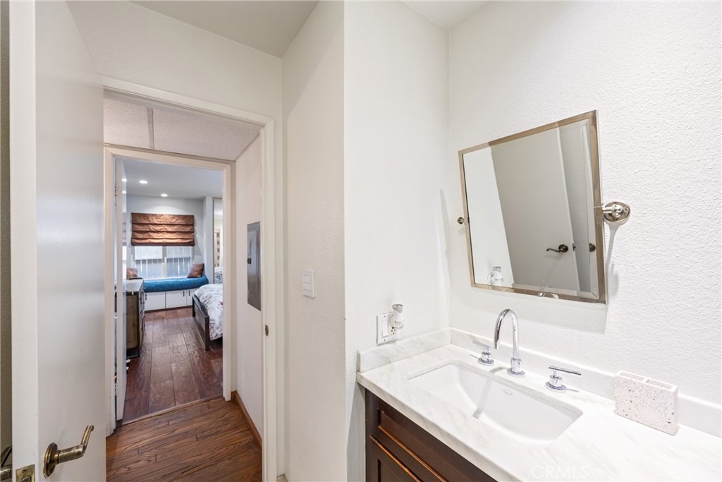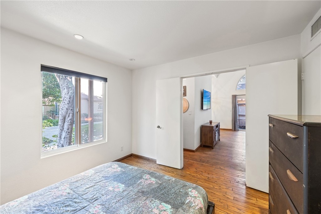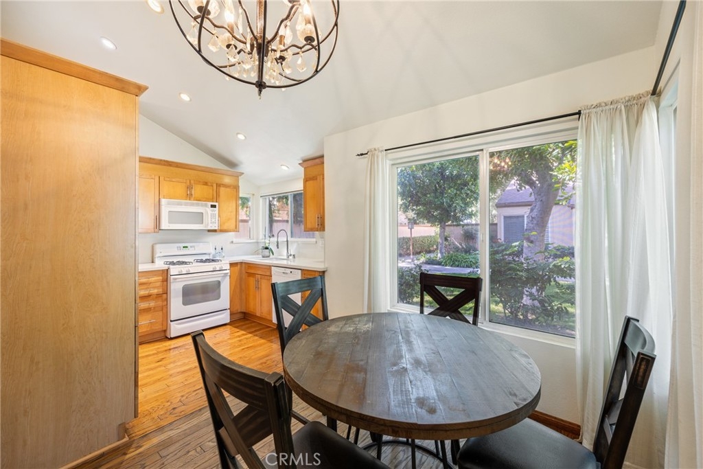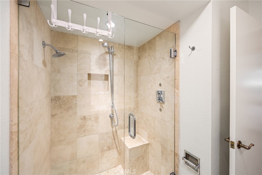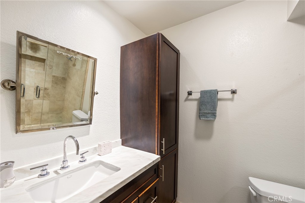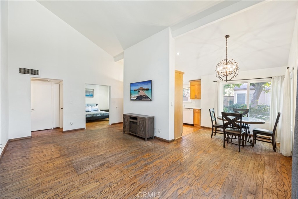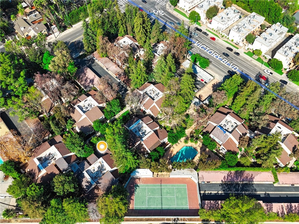 Tucked away in the heart of Sequoia Village, this beautifully updated lower-level two-bedroom condo offers a peaceful, park-like atmosphere. Inside you'll find a spacious living room with soaring vaulted ceilings. The remodeled kitchen features plenty of cabinet space, sleek countertops, a dishwasher, refrigerator, range with a microwave hood, recessed low-voltage lighting, and a convenient lazy Susan corner cabinet. The secondary bathroom is comfortably designed featuring travertine and stone tile flooring, a stylish stall shower with a frameless glass enclosure. High-end chrome bath fixtures, including a hand-held shower spray, add to the modern feel with hardwood floors throughout. The spacious primary bedroom includes two mirrored, lighted wardrobe closets, while the second bedroom, with its double-door entry, is versatile enough to be used as a home office or a den that opens to the main living area. Also included is a full-size washer and dryer, an upgraded electrical panel, newer heating and air conditioning, shaded private patio-perfect for relaxing. The unit also comes with two side-by-side covered parking spaces in a gated carport. Sequoia Village is a well-maintained community offering resort-style amenities, including a pool, gated security. The location is unbeatable—just a short walk to Topanga Plaza, The Village, and the brand-new Rams Training Camp. With easy access to the 101 Freeway and some of the best schools in the Valley, this is an opportunity you don’t want to miss!
