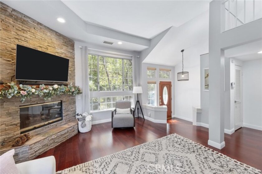 This stunning Woodland Hills townhome offers the perfect blend of comfort, style, and a serene natural setting with picturesque views of trees and the Calabasas creek. Thoughtfully priced for today’s market, this move-in ready residence features over 2,000 sq. ft. of living space, including 2 bedrooms and 2.5 bathrooms. Inside, soaring vaulted ceilings, hardwood floors, and a striking stone fireplace create a welcoming great room filled with natural light. A wall of windows frames with breathtaking views bring the outdoors in. The chef’s kitchen is beautifully appointed with stone countertops, stainless steel appliances, a wine fridge, and a cozy breakfast nook. The open layout flows seamlessly into the family, with both spaces opening directly to the balcony—ideal for relaxing or entertaining while enjoying the tranquil tree-lined views. Upstairs, the primary suite includes its own balcony, a home theater, a walk-in closet, and a sitting area. The designer bath features a soaking tub and separate shower. The second bedroom also offers an en-suite bath with dual sinks and a spacious shower. Additional highlights include upgraded dual-pane windows and balcony doors, a 2-car garage with epoxy flooring, and abundant storage. The gated community has a total of six units and provides fantastic amenities, including a secured entry, pool, guest parking, and HOA fees include insurance, water, sewer, trash, and common area maintenance. Conveniently located just minutes from The Commons at Calabasas, markets, top dining restaurants, Old Town Calabasas, and the 101 freeway. The Sellers are also including an 85” Sony TV, washer, dryer, refrigerator, and wine fridge. Don’t miss the opportunity to experience luxury living surrounded by nature in this exceptional Woodland Hills townhome!