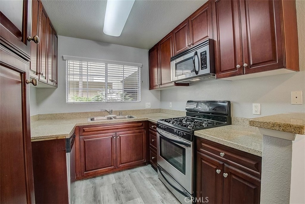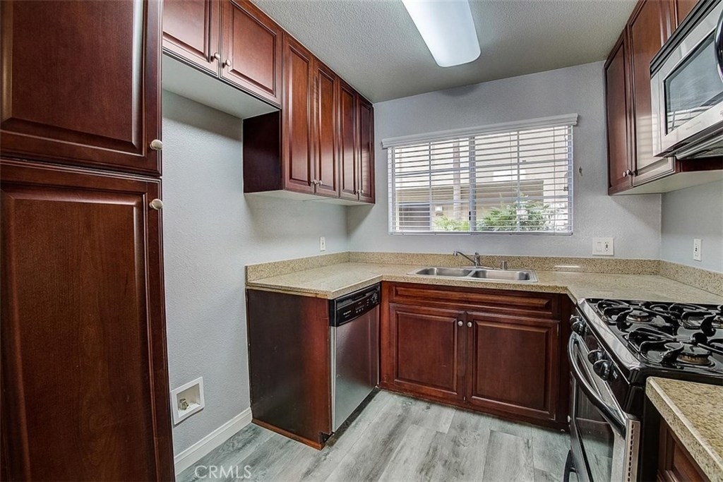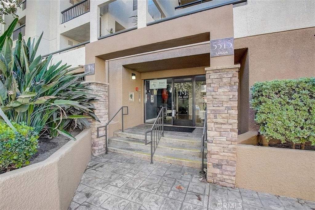 Welcome to resort style living in this beautifully updated single level 2 bedroom/2 bath in The Met Woodland Hills. This home boasts new waterproof vinyl plank flooring throughout (only allowed on the first floor), recessed lighting, crown molding, ample storage and closet space, a Nest thermostat, 6-panel doors and custom paint. The spacious living room features a cozy fireplace & leads to the oversized private balcony. The kitchen boasts stainless steel appliances including built-in microwave, granite counter top, cherry wood cabinets, and stainless steel sink. The master suite features mirrored wardrobe and en suite bathroom with dual sinks, and granite counters. There is also laundry in unit with included washer/dryer, and 1 tandem parking spot in covered garage. Enjoy the many amenities in this 24-hour guard gated community such as 4 pools/spas, 2 saunas, 6 tennis courts, 2 racquetball courts, 2 playgrounds, a state-of-the-art gym, and clubhouse with pool table. Dues cover grounds maintenance, janitorial and landscaping of common areas, 24-he security, EQ ins policy (exterior), trash, water. Conveniently located with easy access to the assigned parking spaces, 101 freeway, public transportation, shopping, restaurants, movie theaters, parks, and The Village/Westfield Mall.