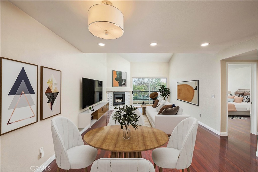 Do not miss this exceptional 2-bedroom, 2-bath penthouse condo offering a rare corner location tucked at the end of the hall, providing ultimate privacy and expansive, open views. The sun-filled interiors are highlighted by their abundant natural light and sleek laminate flooring throughout. The spacious living room with its vaulted ceiling is perfect for entertaining or relaxing, featuring a romantic central fireplace and tree top views. Adjacent to the living room is the inviting dining area, creating a seamless flow for both casual living and formal gatherings. The updated cook’s kitchen is outfitted with newer stainless-steel appliances, granite counters and plenty of storage. The beautiful primary suite is a peaceful retreat, complete with a marble top dual-sink vanity, dressing area, and ample closet space. The spacious secondary bedroom is perfect for guests or as a home office. Step outside to your private patio balcony, where you’ll enjoy fresh air and scenic views, plus a convenient storage area. Inside, you'll additionally find washer/dryer hookups for added convenience, new HVAC system, recessed lights and updated lighting fixtures. This guard-gated community offers resort-style amenities, including a sparkling pool and spa, tennis courts, picturesque grounds, gym, along with recreational areas. Located in the highly desirable Warner Center area, within close proximity to shopping, dining, and entertainment, making this the ideal place to call home.