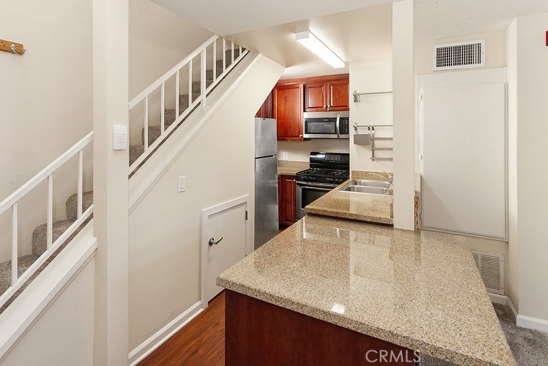 RARE and DESIRABLE SUBTERRANEAN TANDEM 2-CAR PARKING SPOTS IN THIS COMMUNITY! Beautiful updated upper level end unit situated in the highly-desirable gated and guarded community of The Met in Woodland Hills that offers a luxurious lifestyle with a high-end resort vibe. Conveniently located within moments from the wealth of community amenities that include but are not limited to the pool, spa, tennis courts, and fitness center. Freshly painted free-flowing floor plan. The living room is saturated in natural light and is enriched with soaring cathedral ceilings, a lighted ceiling fan, gas fireplace with a cutting-edge wood surround, new carpet and sliding glass doors that lead to a private balcony. Remodeled modern kitchen with rich wood-grained cabinets, granite countertops, dual basin stainless steel sink, state-of-the-art stainless-steel appliances which include a gas range with self-cleaning oven, built-in microwave, dishwasher and refrigerator, striking low-maintenance wood laminate flooring; plus, a granite crowned center island/breakfast bar with additional storage. The dining area fittingly adjoins the kitchen and it is perfect for any occasion. Generously sized primary suite that is enhanced with a sparkling window, high-ceilings, oversized closet with custom pull-out organizers, mirrored wardrobe doors, and plush new carpet: plus, an en suite bathroom with contemporary white vanity with granite countertop, large framed dressing mirror and designer lighting; plus, a separate privacy area with tub/shower and commode. BRIGHT AND AIRY UPSTAIRS LOFT THAT COULD BE TRANSFORMED INTO A SECOND BEDROOM or utilized as a private office or media area, and is enriched with stylish track lighting, generous closet space to maximize storage, mirrored wardrobe doors and complementary wood-grained vinyl tile flooring. Recently upgraded complete HVAC system. Recently installed water heater. Other units like this do not have subterranean parking. This is a RARITY! 24-hour guarded entrance. Located in the heart of Woodland Hills and only moments from Warner Center, Westfield Topanga, The Village outdoor mall, fine dining, world-class shopping, entertainment, Ventura Boulevard’s active social scene, and the 101 freeway.