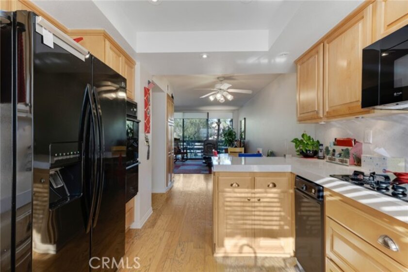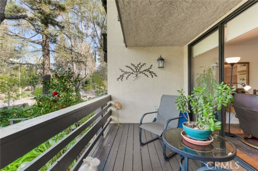 Located within the desirable Warner Village community in Woodland Hills, this beautifully situated end unit townhome offers exceptional privacy facing the tranquil greenspaces of Warner Center Park and only one shared wall. With nearly 1,800 sq ft of living space and four private outdoor areas, this 3 bedroom, 2.5 bath residence features a split-level layout, soaring ceilings, and abundant natural light throughout. Double doors open to a welcoming foyer with a convenient powder bath for guests. Step down into the formal living room highlighted by vaulted ceilings, a central fireplace, and oversized sliding glass doors leading to an enclosed patio. A short flight up reveals the formal dining room with sightlines to the living area and sliding doors opening to a balcony. Adjacent, the kitchen is appointed with maple cabinetry, quartz countertops, built-in gas range with overhead microwave and vent, wall oven and broiler, dishwasher, and trash compactor. The adjoining family room offers generous proportions and wall-to-wall sliding glass doors that open to a deck overlooking a peaceful, trickling stream. Wood flooring extends across the main and mid levels (with carpet in the formal living room), while carpeting continues on the stairs and upper floor. Downstairs from the foyer, a flexible bonus room (not included in total square footage) is ideal for a home office, studio, gym, storage, or potential fourth bedroom, complete with a dedicated laundry area and direct access to the 2 car garage featuring built-in storage cabinets and a newly installed electrical panel (late 2025). All bedrooms are located upstairs, including the primary suite with an elevated vaulted ceiling, private balcony, walk-in closet, dual sink vanity, and oversized shower. Two secondary bedrooms—one with a vaulted ceiling—are served by a full hall bath. Warner Village residents enjoy HOA amenities including 2 pools, 2 spas, tennis courts, and manicured grounds with streams, waterfalls, and mature landscaping; water, trash, basic cable, exterior maintenance, and insurance are included in the dues. Ideally situated near shopping, dining, and entertainment at Westfield Topanga and The Village at Warner Center, summer concerts and events at Warner Center Park, local recreation, and convenient access to the Ventura Freeway (US 101), this home offers comfortable living in one of the Valley’s most connected neighborhoods.