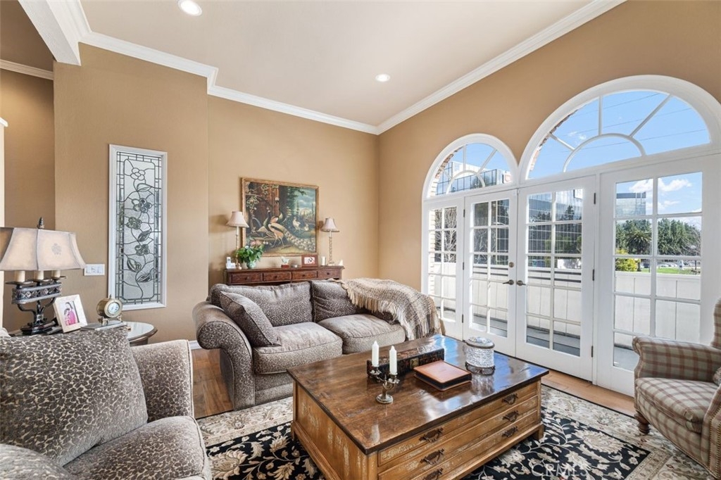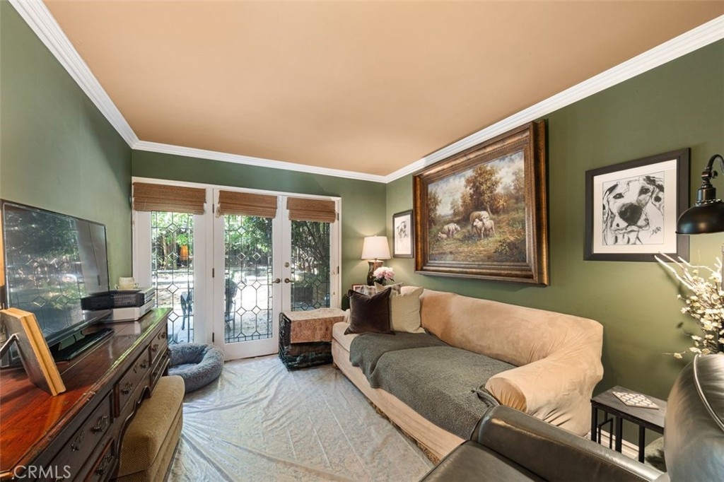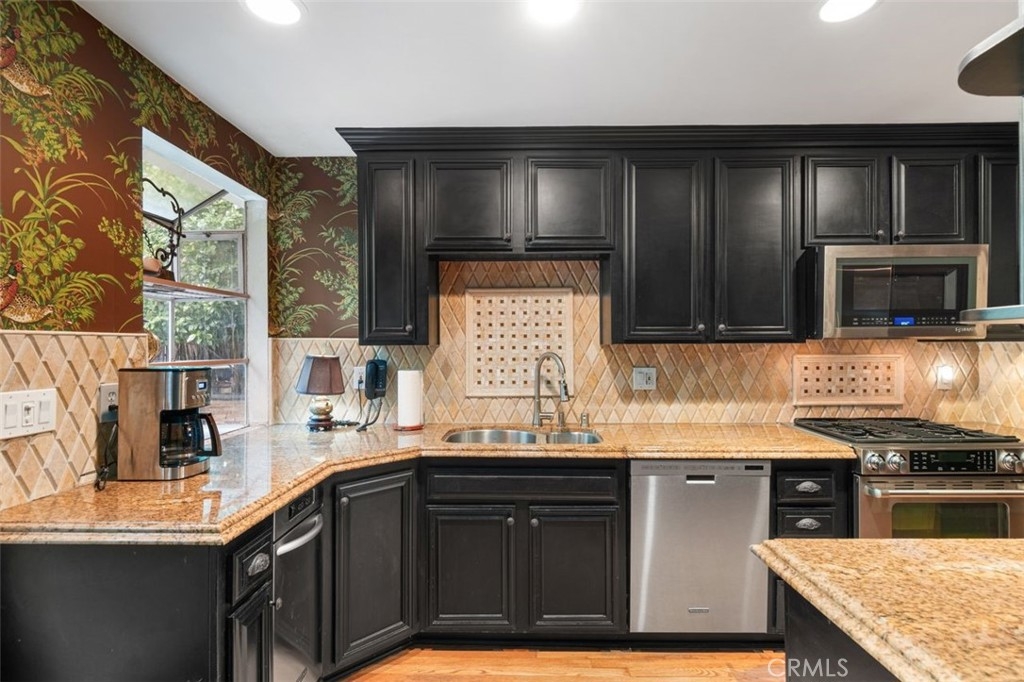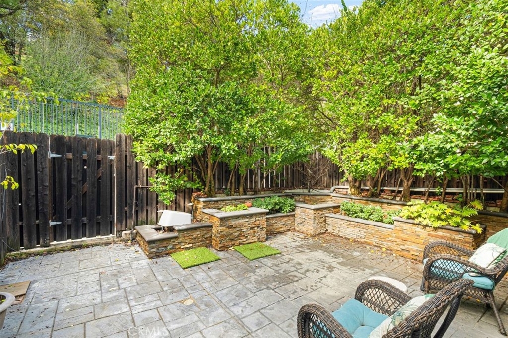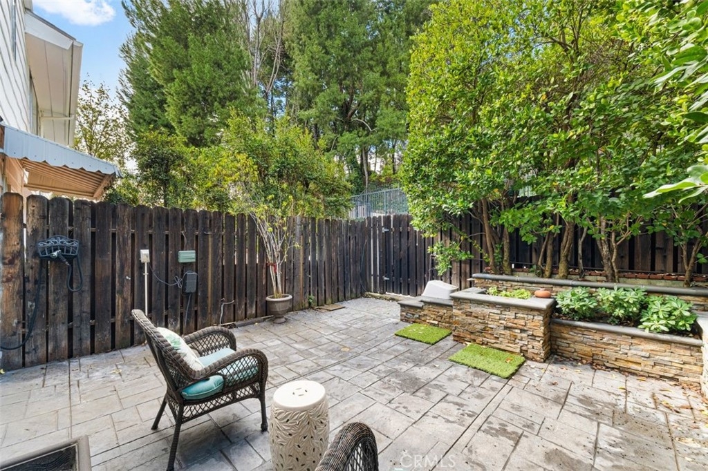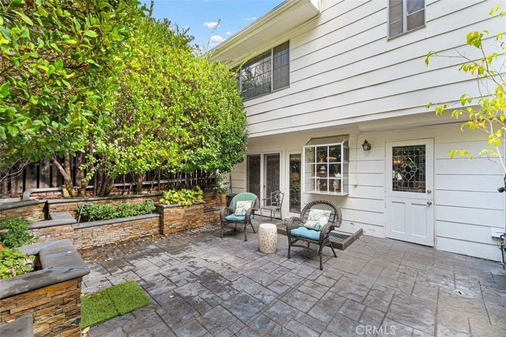 Take advantage of this rare opportunity to own in the Topanga Canyon Townhome community. This designer decorated traditional style townhouse feels like home. With beautiful curb appeal, the gated complex has a brick exterior and stamped concrete driveway. The welcoming entry leads right into the living room with Palladian windows, vaulted ceilings, hardwood floors, a beautiful marble fireplace and French doors. Up the stairs is the powder room, den and kitchen. The den has beautiful leaded glass doors leading to the spacious stamped concrete patio with gorgeous mature greenery. The dining area is perfect for entertaining and leads right into the updated kitchen. Complete with granite counters and travertine backsplash, stainless steel Jenn Air appliances and great storage, this kitchen is perfect for any chef! Downstairs is an additional approximately 300 square foot bonus room perfect for a gym, office, guest area and more! The two ensuite bedrooms with high ceilings are upstairs on the highest level. With views of Warner Park, this primary suite is spacious and has a beautiful second fireplace. The primary has walk-in closets, a double vanity and a gorgeous spa tub and shower. Welcome home - pull right into your own two-car garage with ample storage! Pets are welcome! The complex has a pool too! In close proximity to Warner Park, Warner Center, The Village and the Westfield Shopping Center.