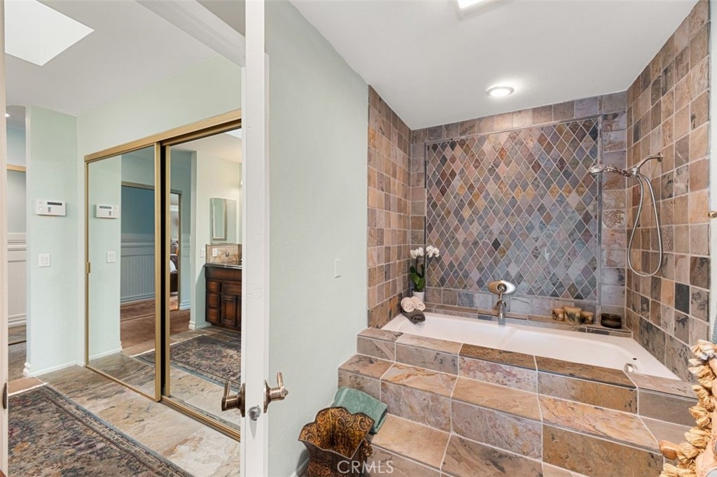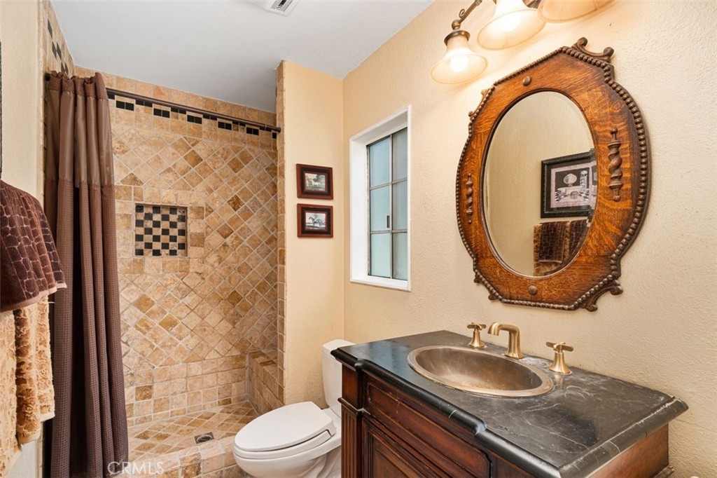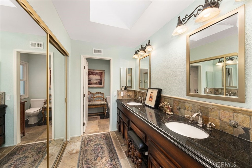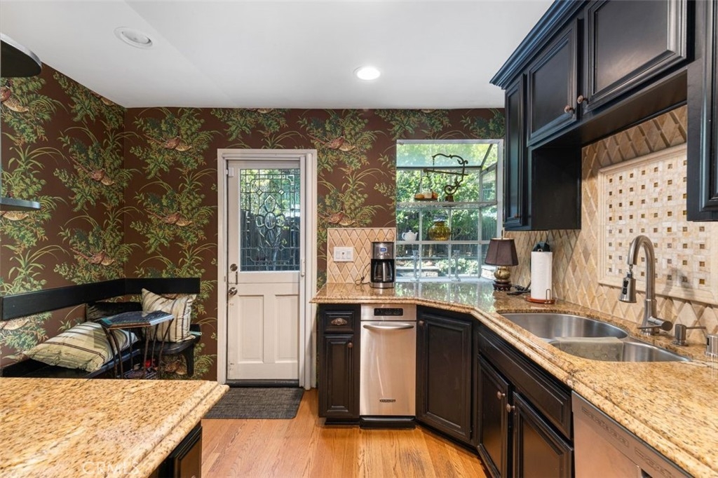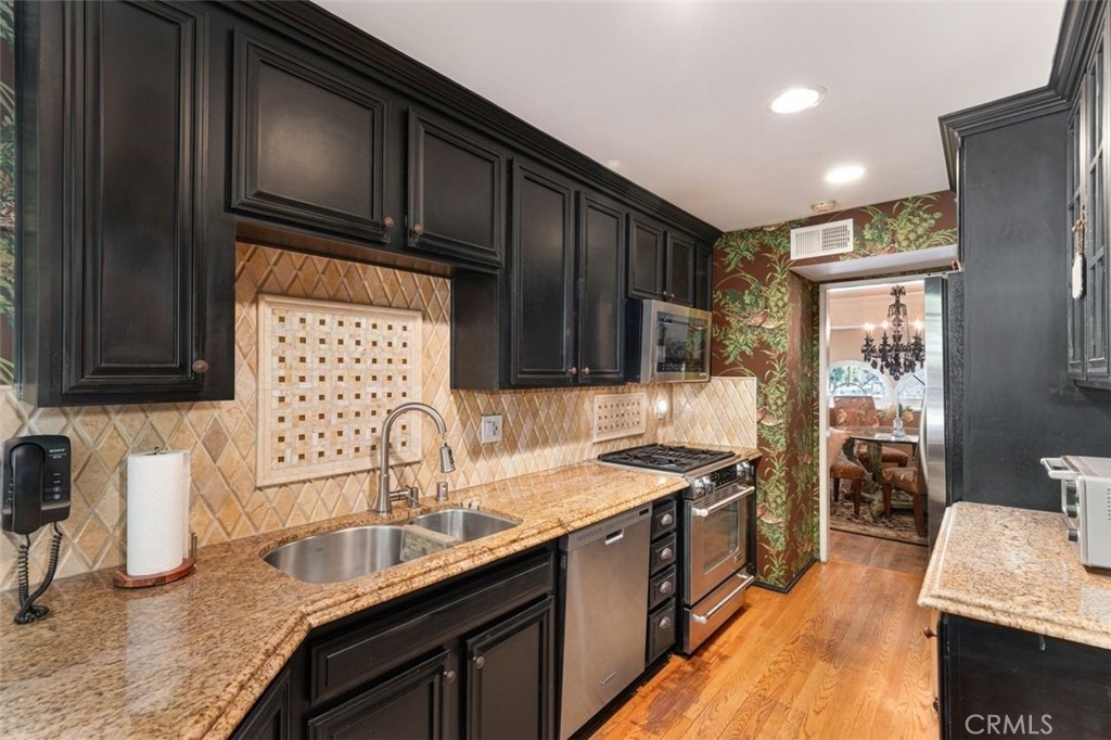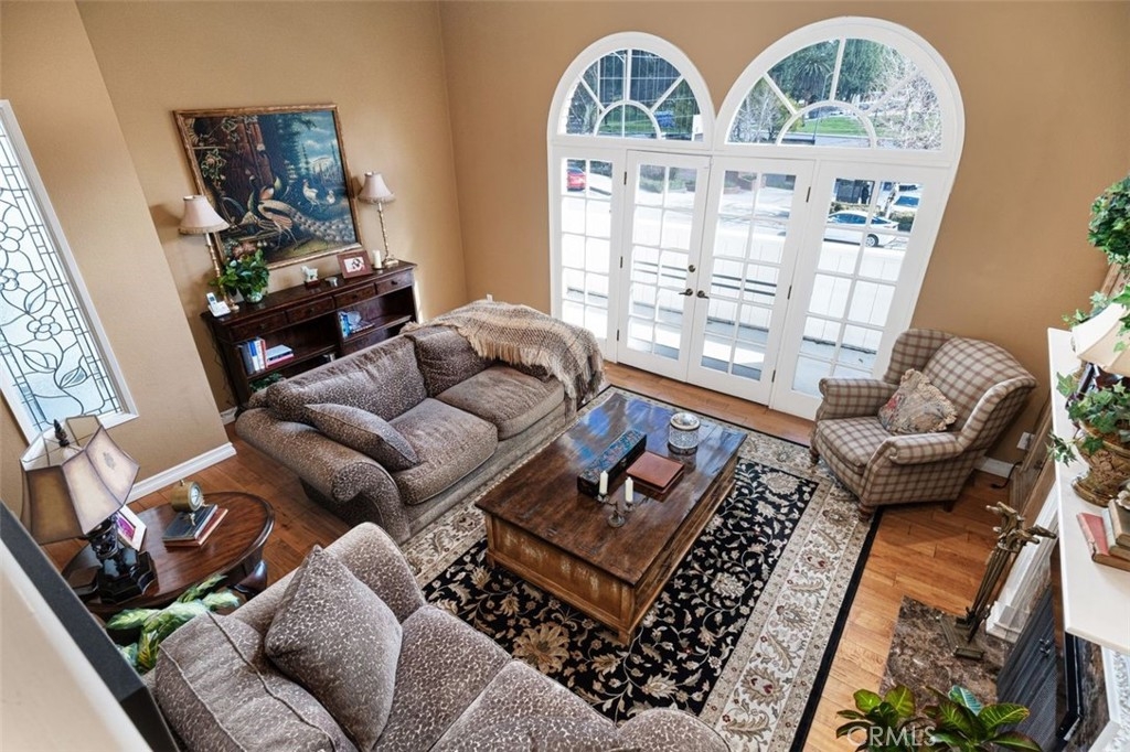 Take advantage of this rare opportunity to own in the Topanga Canyon Townhome community. This designer decorated traditional style townhouse feels like home. With beautiful curb appeal, the gated complex has a brick exterior and stamped concrete driveway. The welcoming entry leads right into the living room with Palladian windows, vaulted ceilings, hardwood floors, a beautiful marble fireplace and French doors. Up the stairs is the powder room, den and kitchen. The den has beautiful leaded glass doors leading to the spacious stamped concrete patio with gorgeous mature greenery. The dining area is perfect for entertaining and leads right into the updated kitchen. Complete with granite counters and travertine backsplash, stainless steel Jenn Air appliances and great storage, this kitchen is perfect for any chef! Downstairs is an additional approximately 300 square foot bonus room perfect for a gym, office, guest area and more! The two ensuite bedrooms with high ceilings are upstairs on the highest level. With views of Warner Park, this primary suite is spacious and has a beautiful second fireplace. The primary has walk-in closets, a double vanity and a gorgeous spa tub and shower. Welcome home - pull right into your own two-car garage with ample storage! Pets are welcome! The complex has a pool too! In close proximity to Warner Park, Warner Center, The Village and the Westfield Shopping Center.