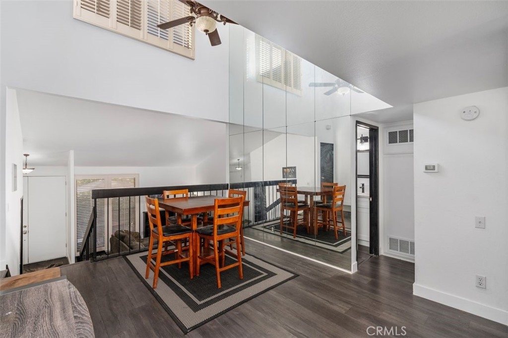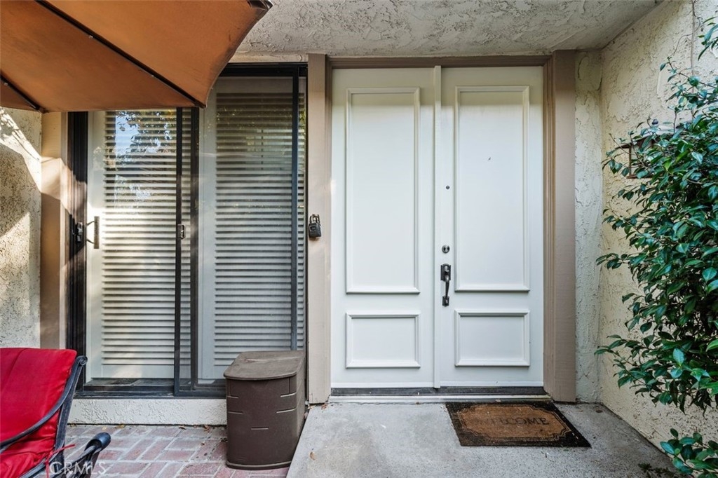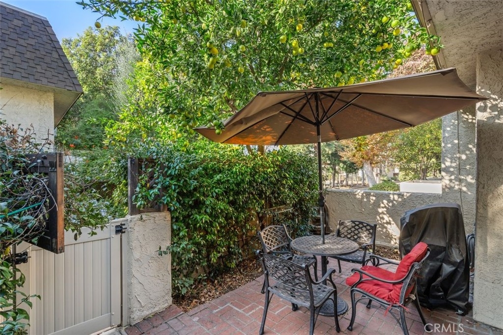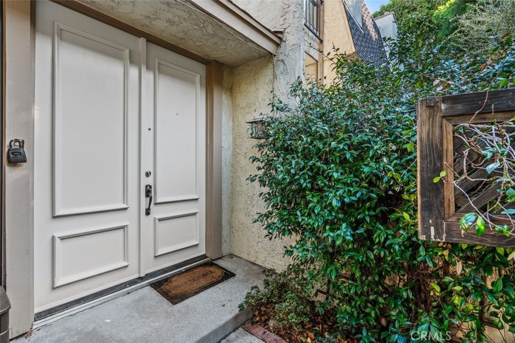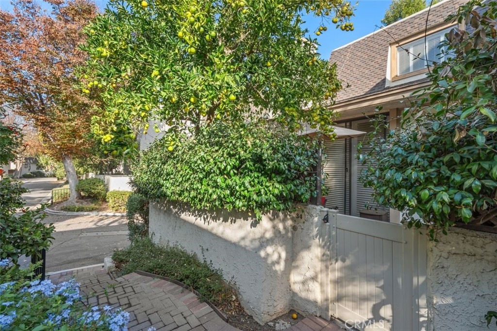 What an incredible property!. This inside end unit has a prime location with enhanced privacy featuring approximately 1,243 sq. ft. with a thoughtful multi-level layout. You enter through the very private brick patio with a water fountain and surrounded by lush landscaping and fruit trees. The first floor consists of a living room with a fireplace and cathedral ceiling. On the second floor is the second bedroom, full bathroom with a new shower stall and custom shower doors, kitchen with quartz counter tops, and the dining area. The large master suite is on the upper level with a sitting area, ample closet space with full wall mirrored closet doors, master bath with new custom shower stall, and double sinks. Features include plantation shutters, new wood laminate flooring throughout, freshly painted, and new electric service. There is also an attached garage with the laundry area and additional storage area. This townhome is not only move-in ready but also perfect for anyone seeking comfort, style and a great location. The Dove Creek Condominium Complex offers an ideal blend of amenities, convenience, and privacy. The amenities include two tennis courts, a heated pool and spa, earthquake insurance and well maintained grounds. This is an ideal place to call home!