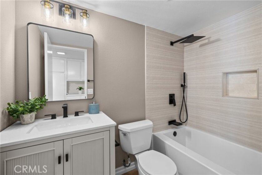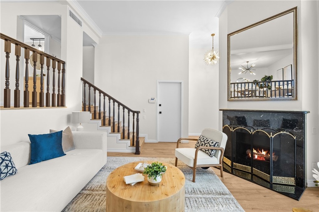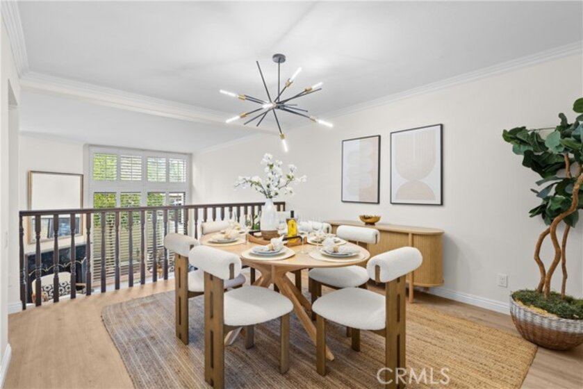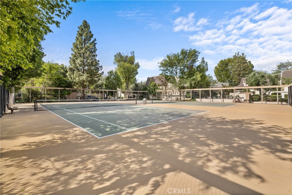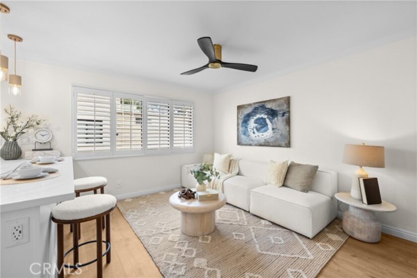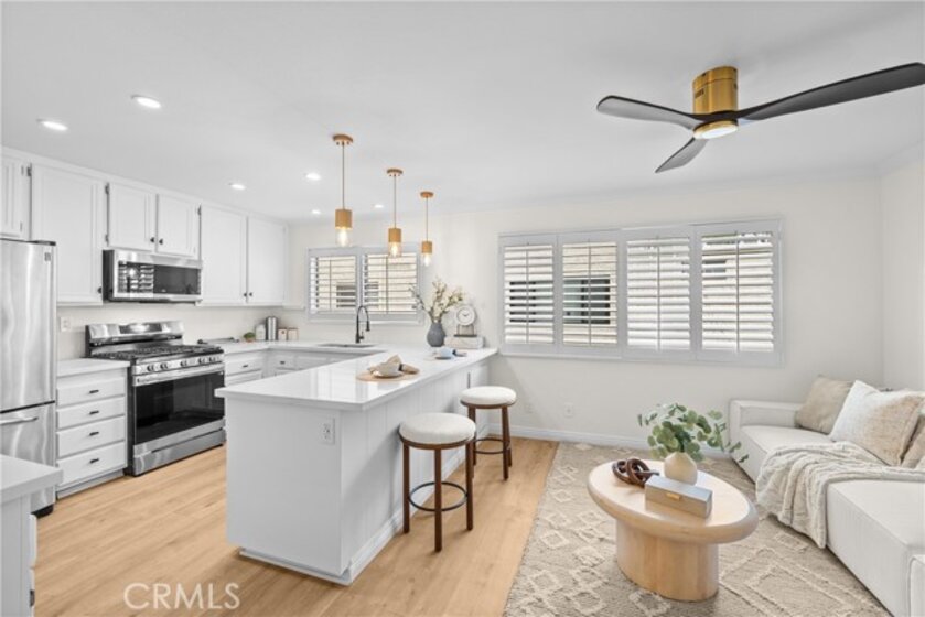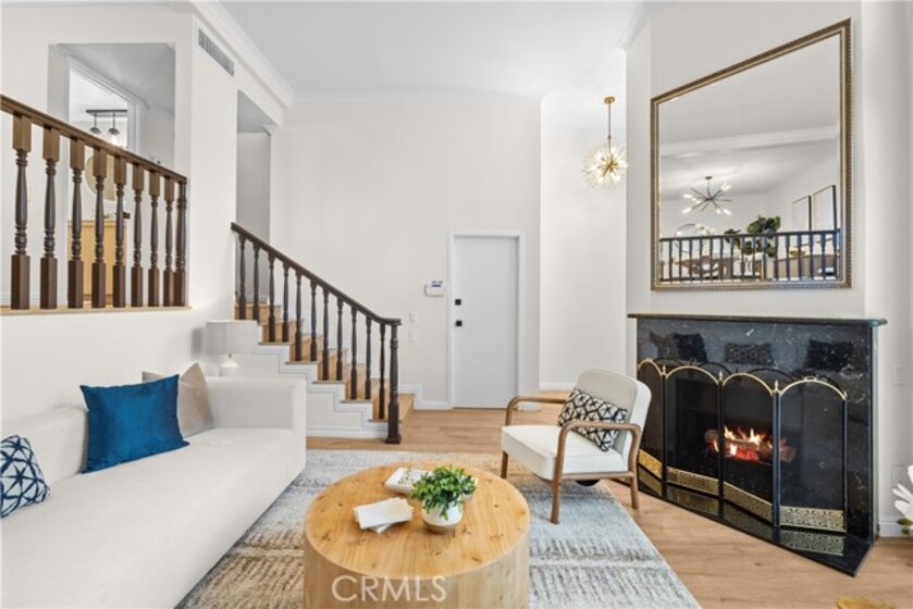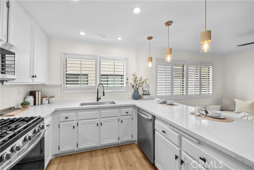 Gorgeous, remodeled townhome in the serene Dove Creek community, offering over 1,750 square feet of living space with 3 bedrooms and 2.5 bathrooms. A grand double-door entry opens to a spacious living room with soaring two-story ceilings, a cozy fireplace, and plantation shutters. Sliding glass doors fill the space with natural light and lead to a private patio—perfect for morning coffee or evening relaxation. An elevated dining area overlooks the living room and flows seamlessly into the kitchen and family room, creating an ideal layout for both everyday living and entertaining. The light-filled kitchen features quartz countertops, stylish pendant lighting, and stainless steel appliances, including a newer stove and microwave. Adjacent, the family room offers a comfortable space to gather or unwind. Upstairs, a versatile loft with accordion doors provides the perfect option for a home office or third bedroom. The oversized primary suite boasts double-door entry, high ceilings, beautiful flooring, dual closets, and a private en-suite bath. The primary bathroom has been thoughtfully updated with a dual-sink vanity, modern lighting, updated mirrors, and a beautifully remodeled walk-in shower. Additional highlights include a tastefully remodeled powder room for guests and an updated hall bathroom with contemporary finishes. The secondary bedroom features a clean, neutral aesthetic. Private Double Car Garage with Automatic Opener and Direct Access. Central Air & Heat. Residents of Dove Creek enjoy access to a pool, two spas, and a tennis court. Ideally located near shopping, dining, and entertainment at The Village, Westfield Topanga, and Ventura Boulevard, with convenient access to the 101 and 118 freeways.